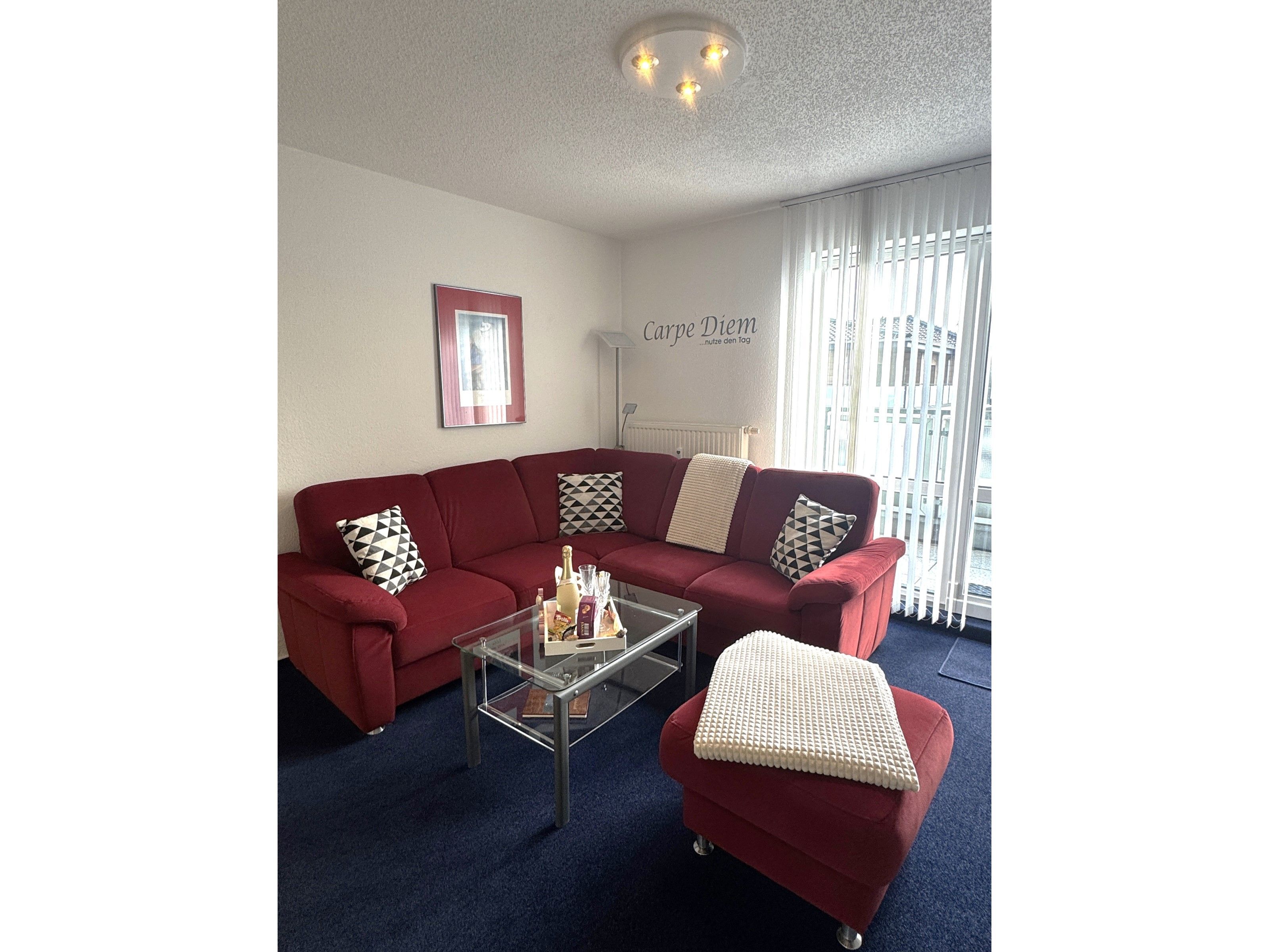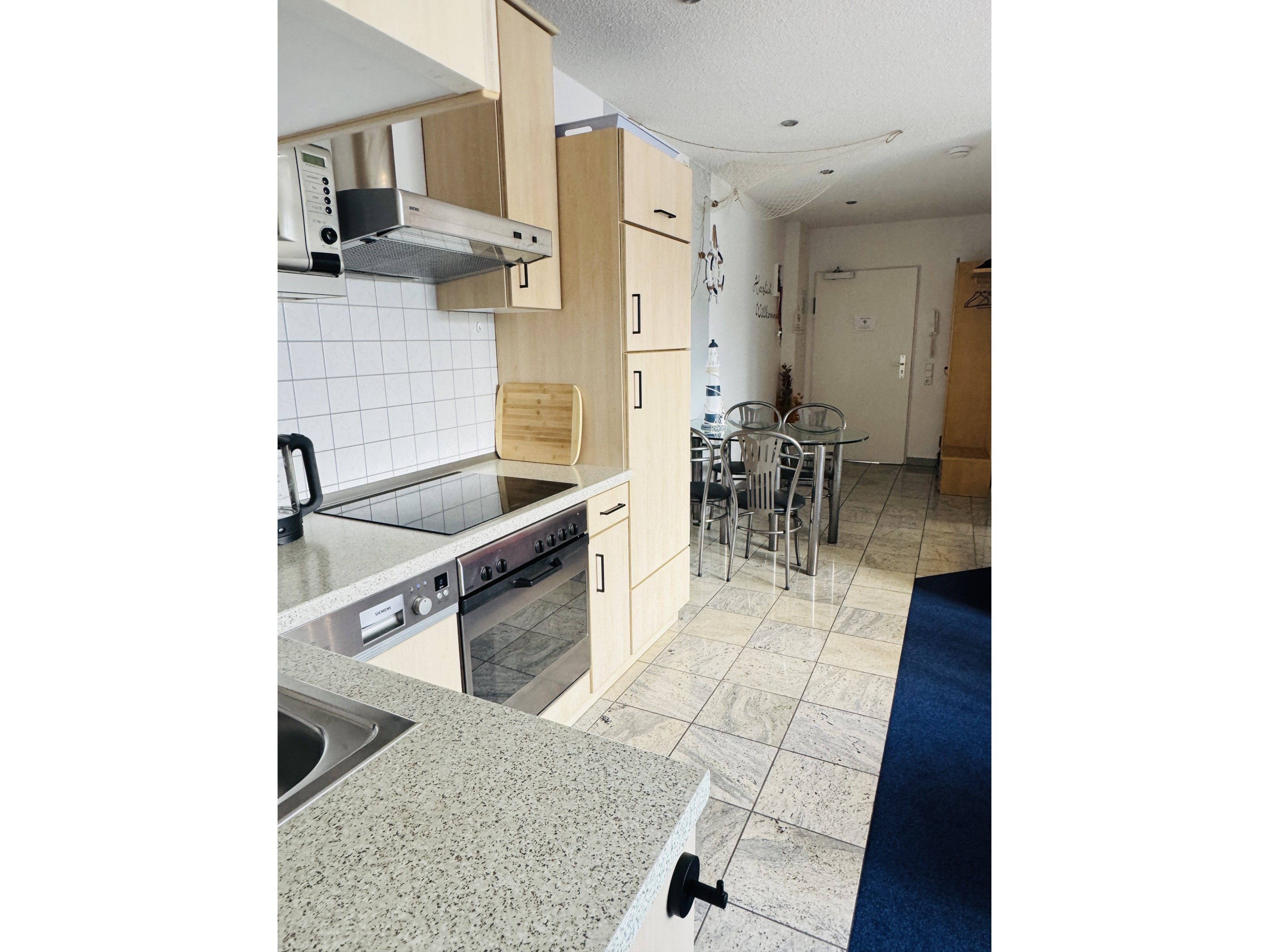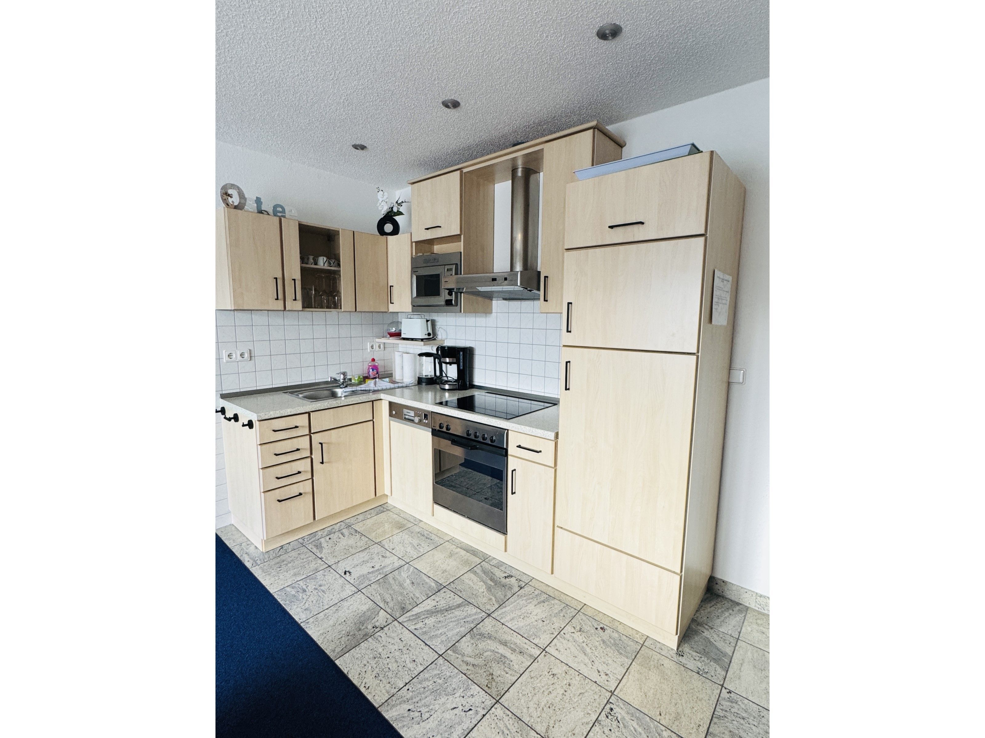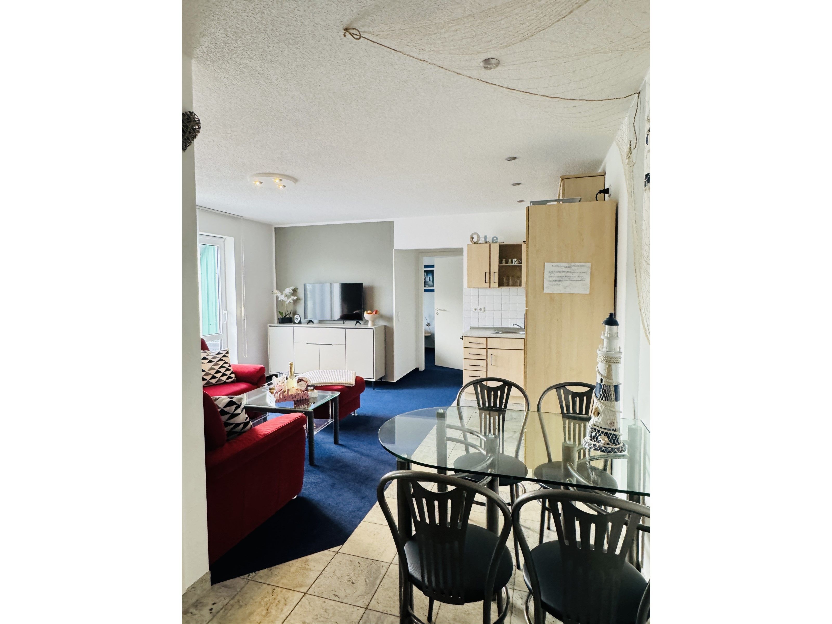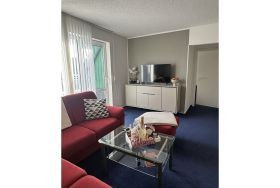 Im kombinierten Wohn- Esszimmer befindet sich neben dem gemütlichen Sofa und TV die Küchenzeile mit Cerankochfeld, Backofen, Spülmaschine, Kühlschrank mit Gefriermöglichkeit, Mikrowelle, Kaffeemaschine, Wasserkocher, Toaster und Essplatz. Die Wohnung verfügt über zwei Schlafzimmer mit Schrank und je einen Doppelbett (1x 180 x 200 / 1x 160 x 200).
