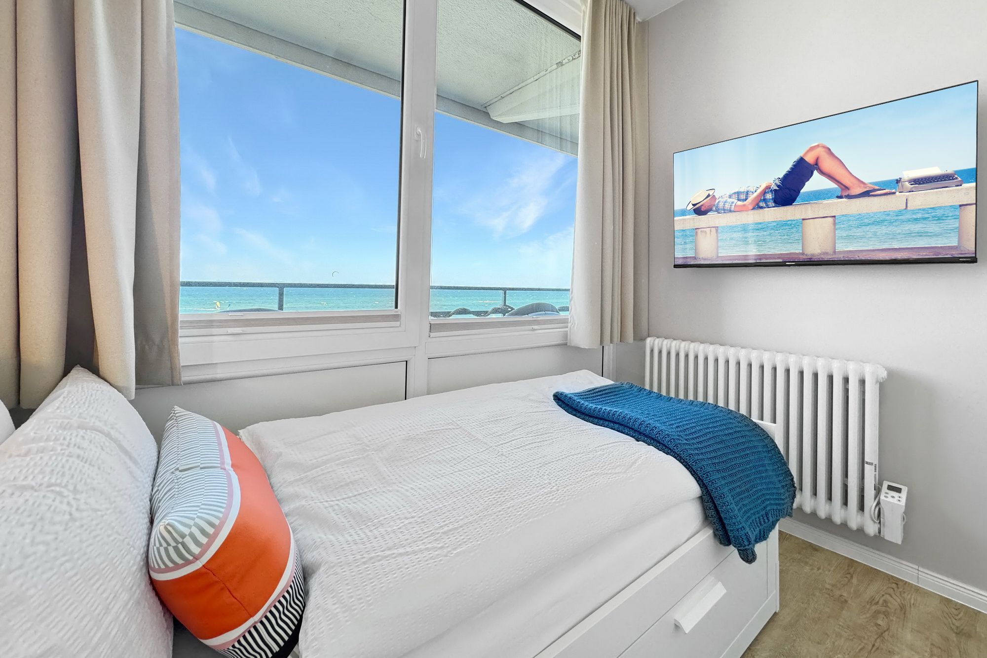 Wohn-/Schlafbereich: Helles Sofa, Smart-TV mit Panoramablick, ausziehbares Einzelbett für bis zu 2 Kinder inklusive eigenem TV