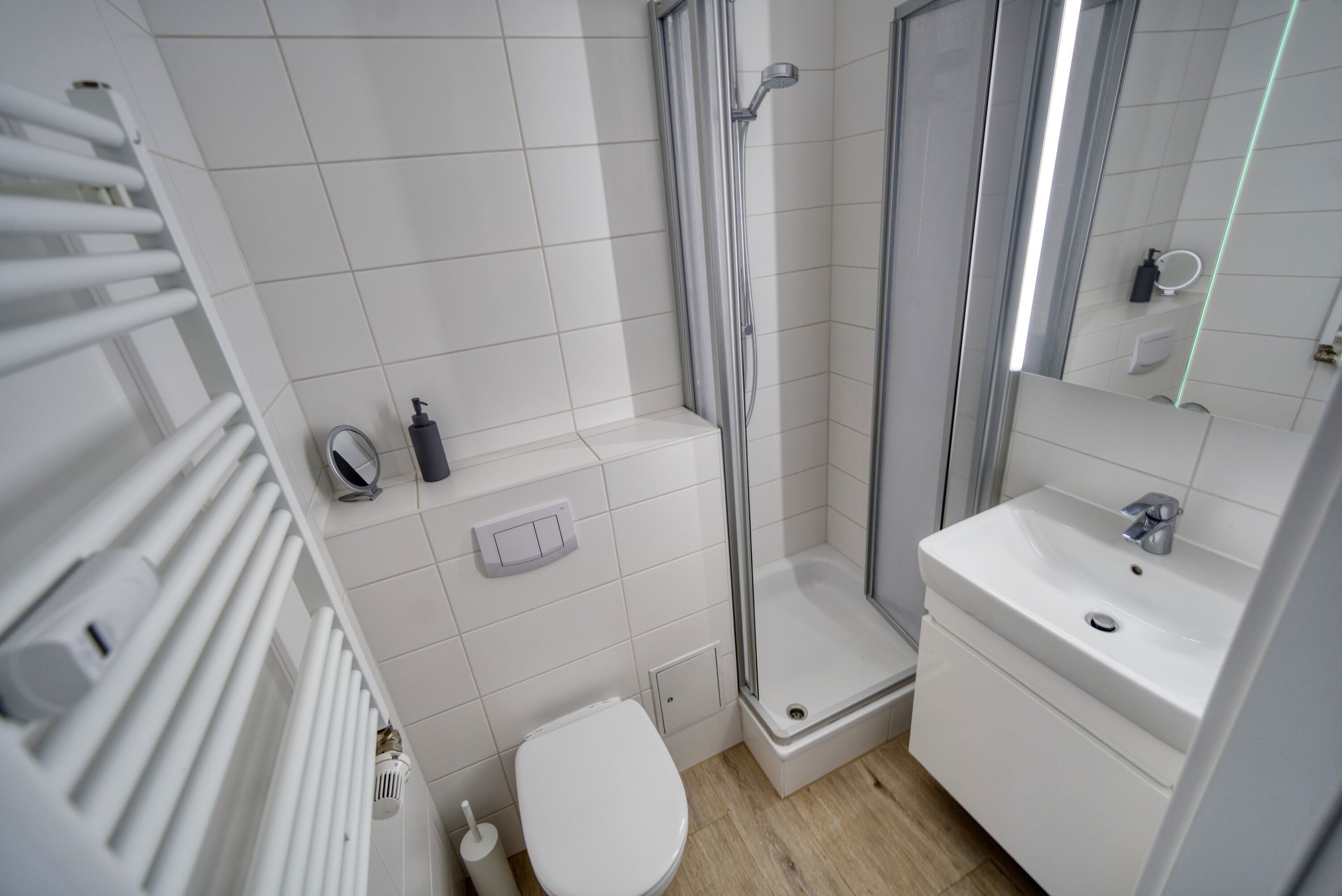 Handtuchtrockner, Spiegel, Waschbecken und WC