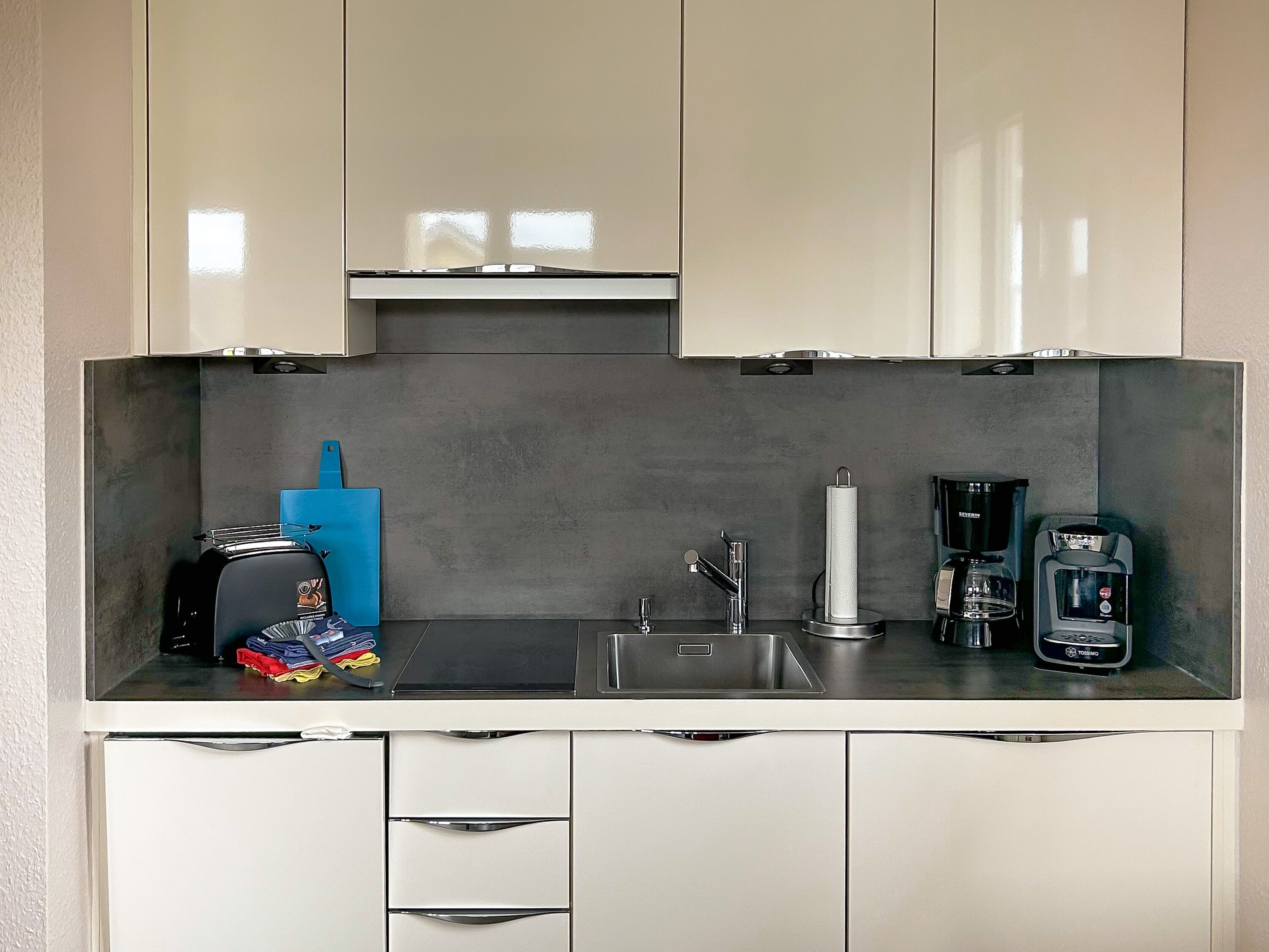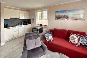 Die in den Wohnbereich integrierte Küchenzeile überzeugt mit ihrer umfangreichen Ausstattung, u.a. einem 2-Zonen-Ceranfeld, einer Spülmaschine, einem Kühlschrank mit Gefrierfach sowie einer Filterkaffeemaschine und einer Tassimo-Kapselmaschine. Selbstverständlich stehen Ihnen auch ein Wasserkocher, Eierkocher, ein Toaster sowie das nötige Küchenequipment für ein leckeres Frühstück oder warme Speisen zur Verfügung, sodass Sie sich bequem selbst versorgen können. Hierzu können Sie Ihr gemütliches Frühstück oder Abendessen wahlweise drinnen am Esstisch einnehmen oder Sie genießen bei schönem Wetter draußen auf dem möblierten Balkon die frische Ostseeluft.