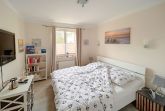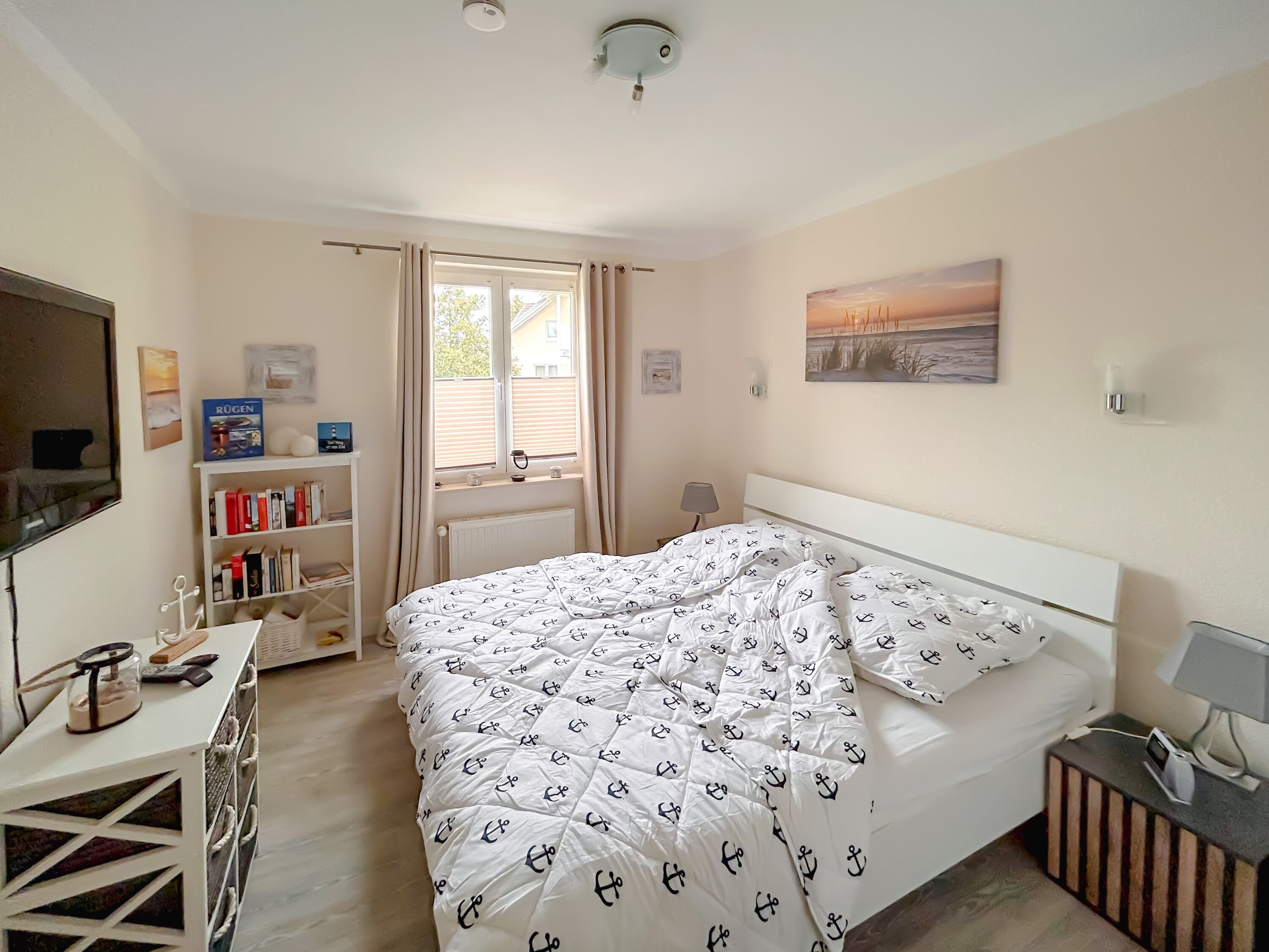 Im Schlafzimmer Ihres Urlaubsdomizils finden Sie ein bequemes Doppelbett (1,80 x 2,00 m), einen zweiten Flachbild-TV und einen geräumigen Kleiderschrank für Ihre Urlaubsgarderobe. Für gemütliche Stunden ist ein Regal mit einer kleinen Buchauswahl zum Schmökern für Sie vorbereitet.