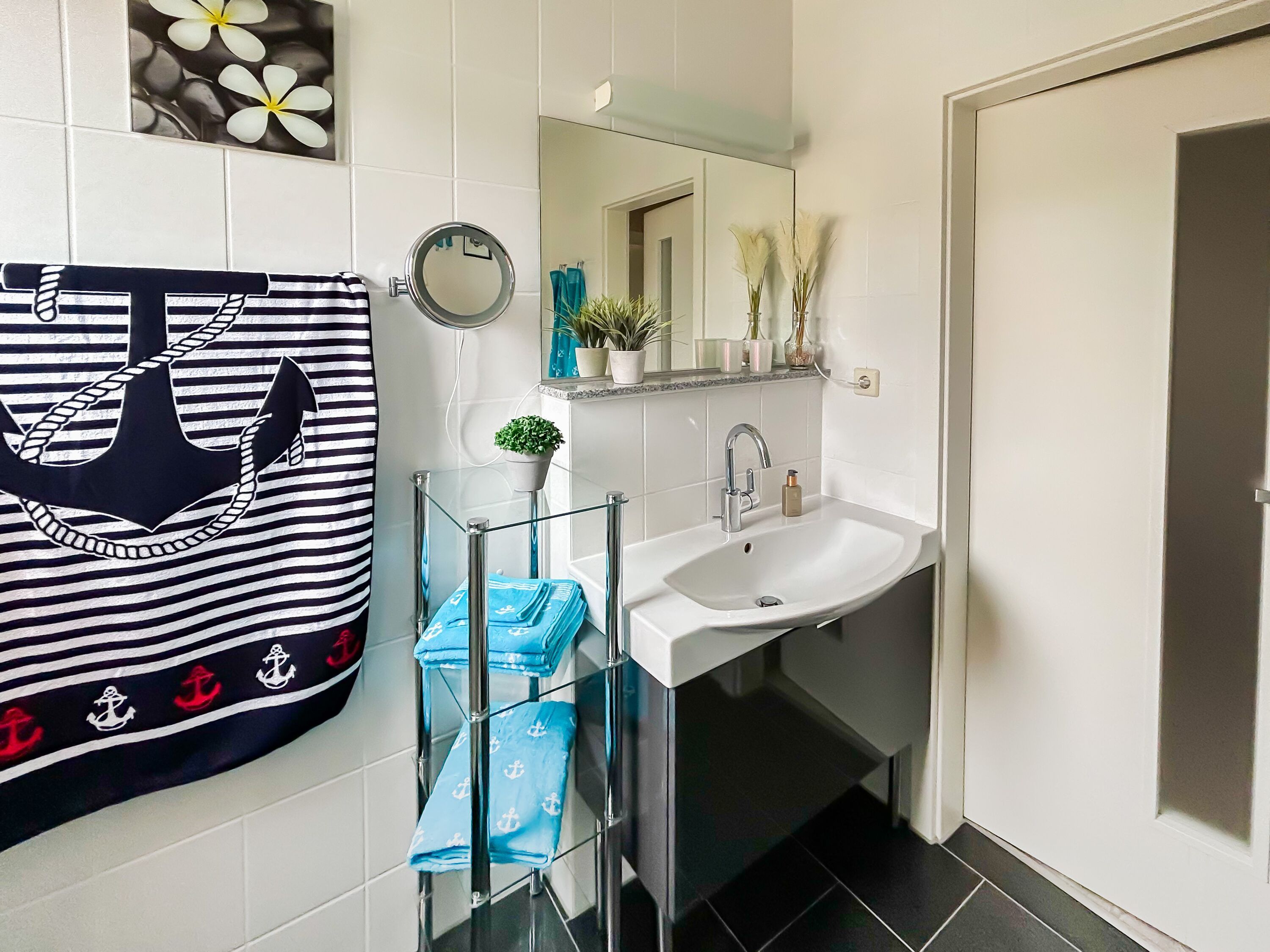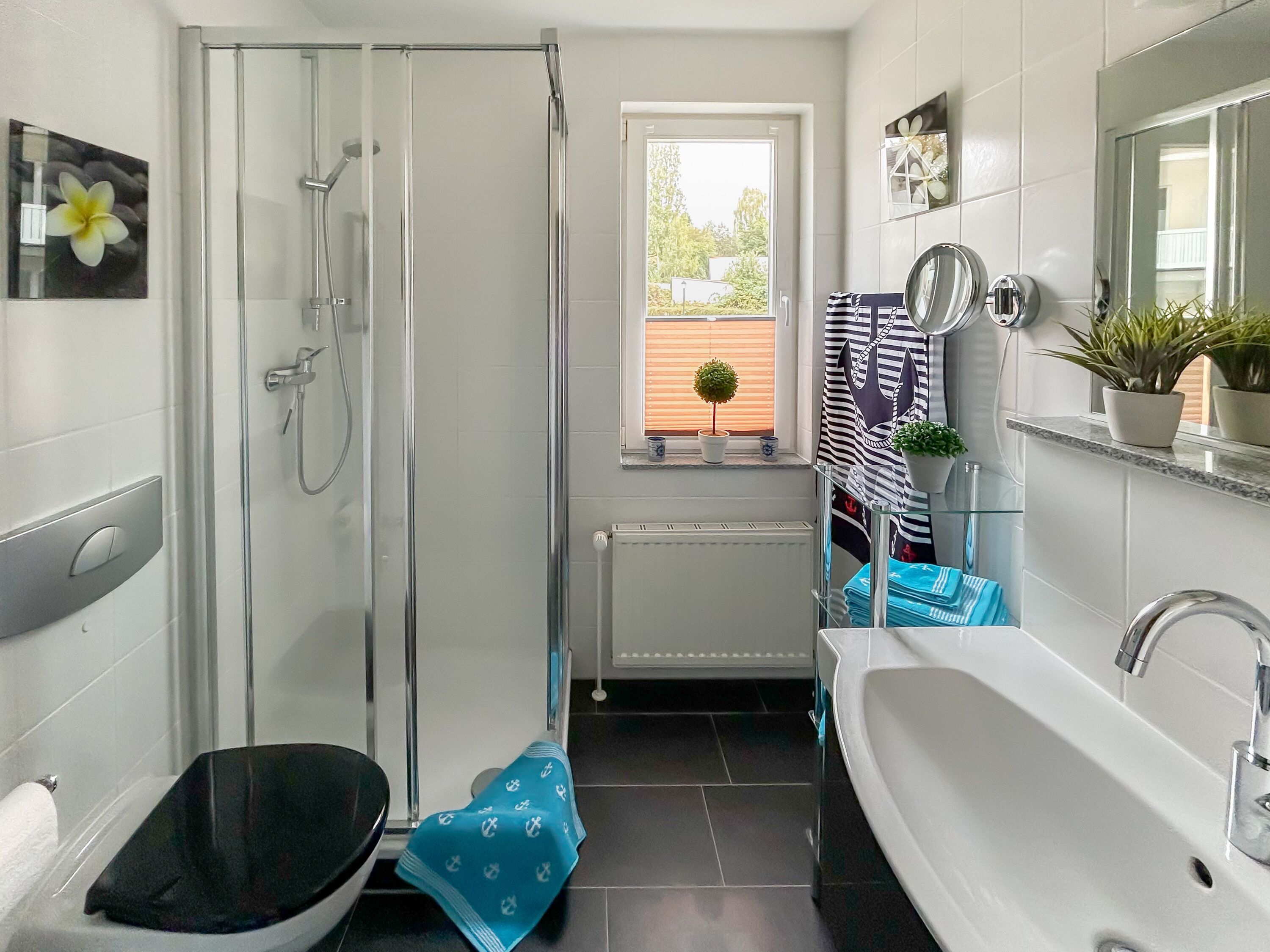 Das modern geflieste Tageslichtbad verfügt über Dusche/WC, einen Waschtisch mit Spiegel und beleuchtetem Kosmetikspiegel sowie einen Fön. Haken und Ablageflächen für Ihre persönlichen Utensilien sind selbstverständlich ausreichend vorhanden.