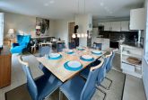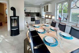 Ein großzügiger Wohnraum mit Wohn-/Essbereich ist hochwertig eingerichtet, LED-TV, Blue-ray-Hifi-Anlage und Kaminofen sowie einer kompletten Einbauküche ausgestattet.
