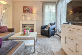 • Wohnbereich: Heller Wohnraum mit Kamin, Smart-TV und bequemer Sitzgruppe