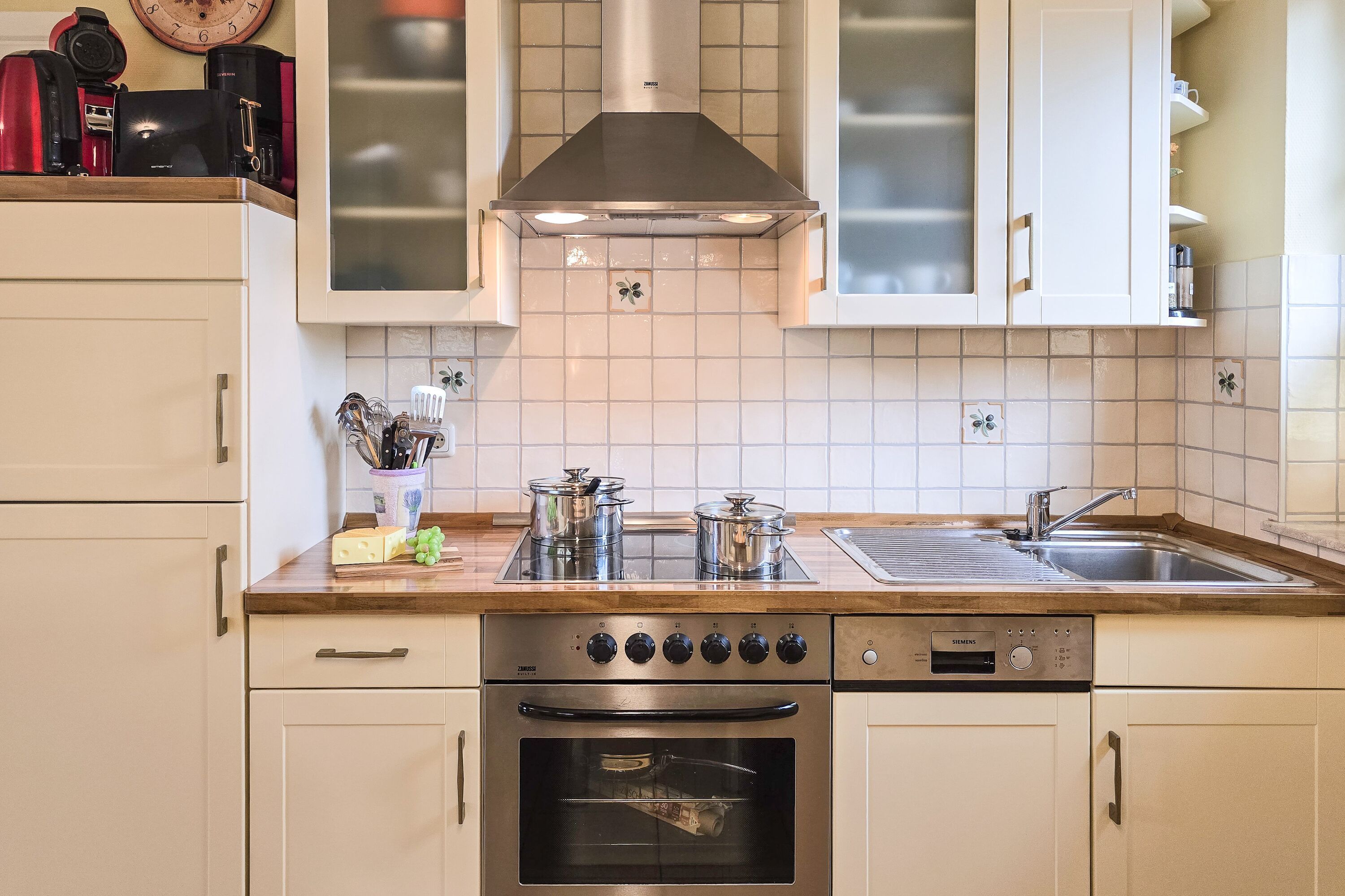 • Küche: Voll ausgestattete Küchenzeile mit Spülmaschine, Backofen, Kochfeld, Kühlschrank, Filterkaffeemaschine und Pad-Kaffeemaschine