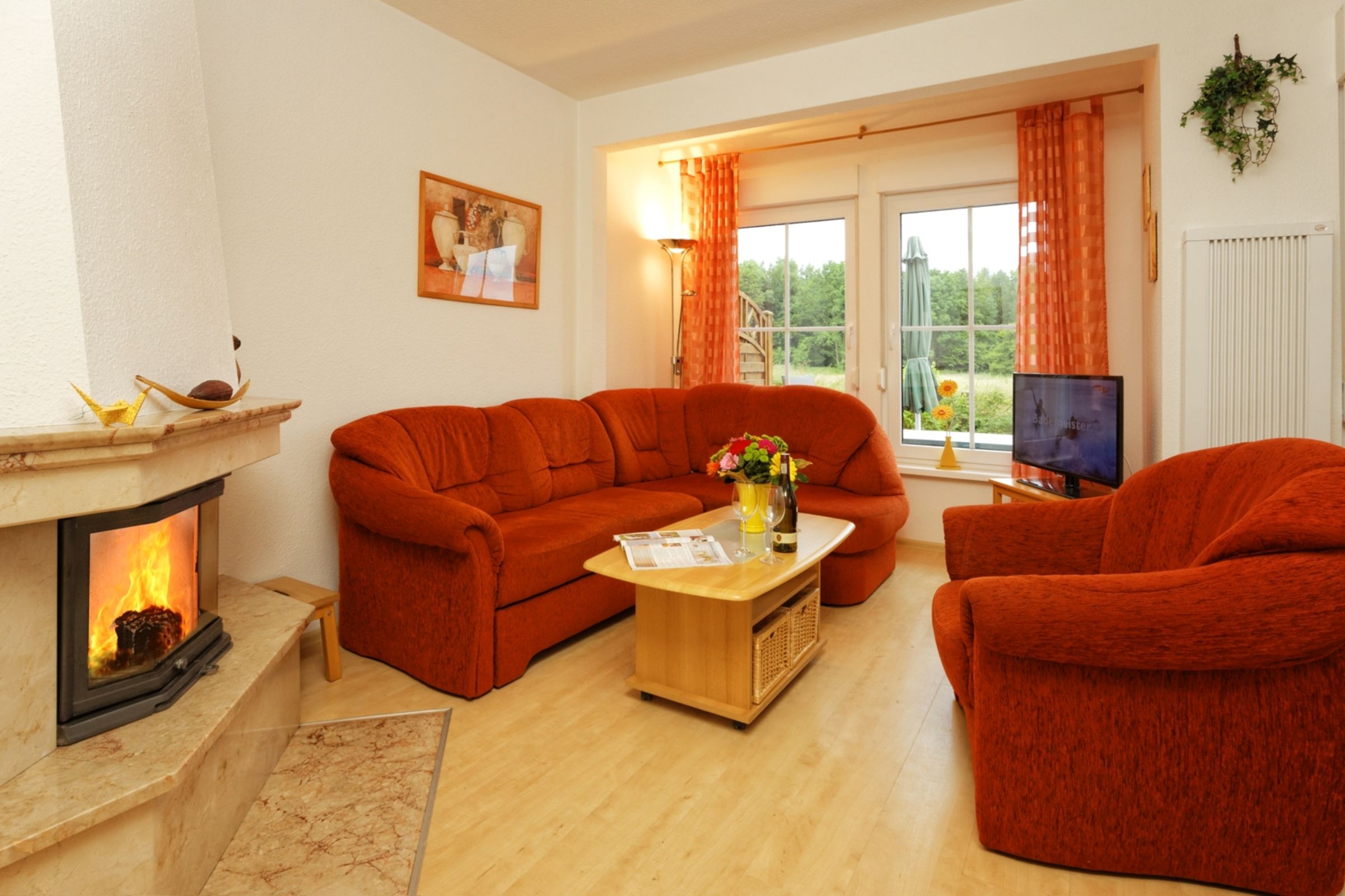 • Wohnraum mit Ecksofa u. Sessel, Eckbankgruppe, Holzkamin, Satelliten-TV (LCD) mit ca. 80cm Bilddiagonale, HiFi Radio, Internet-WLAN