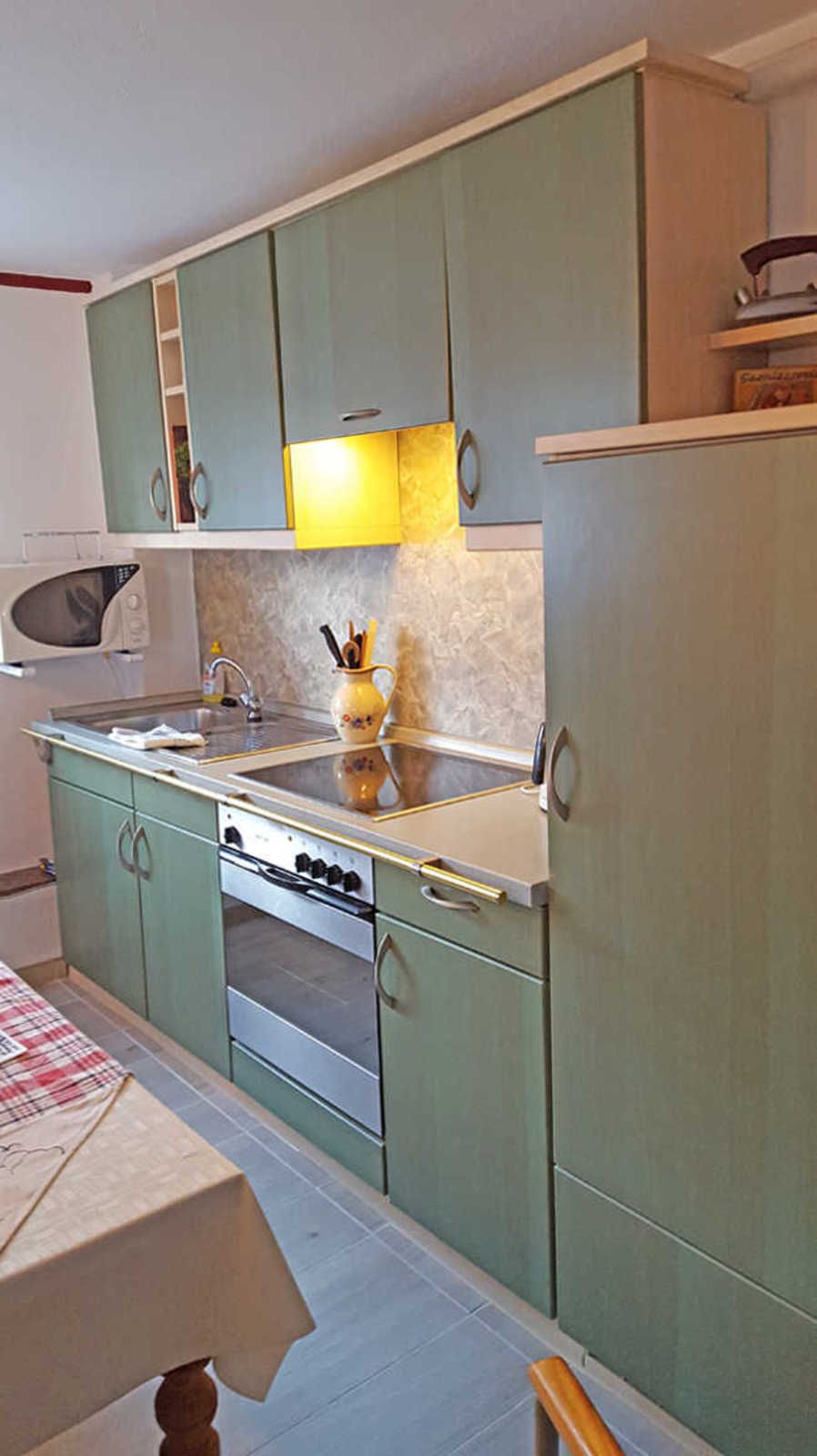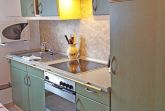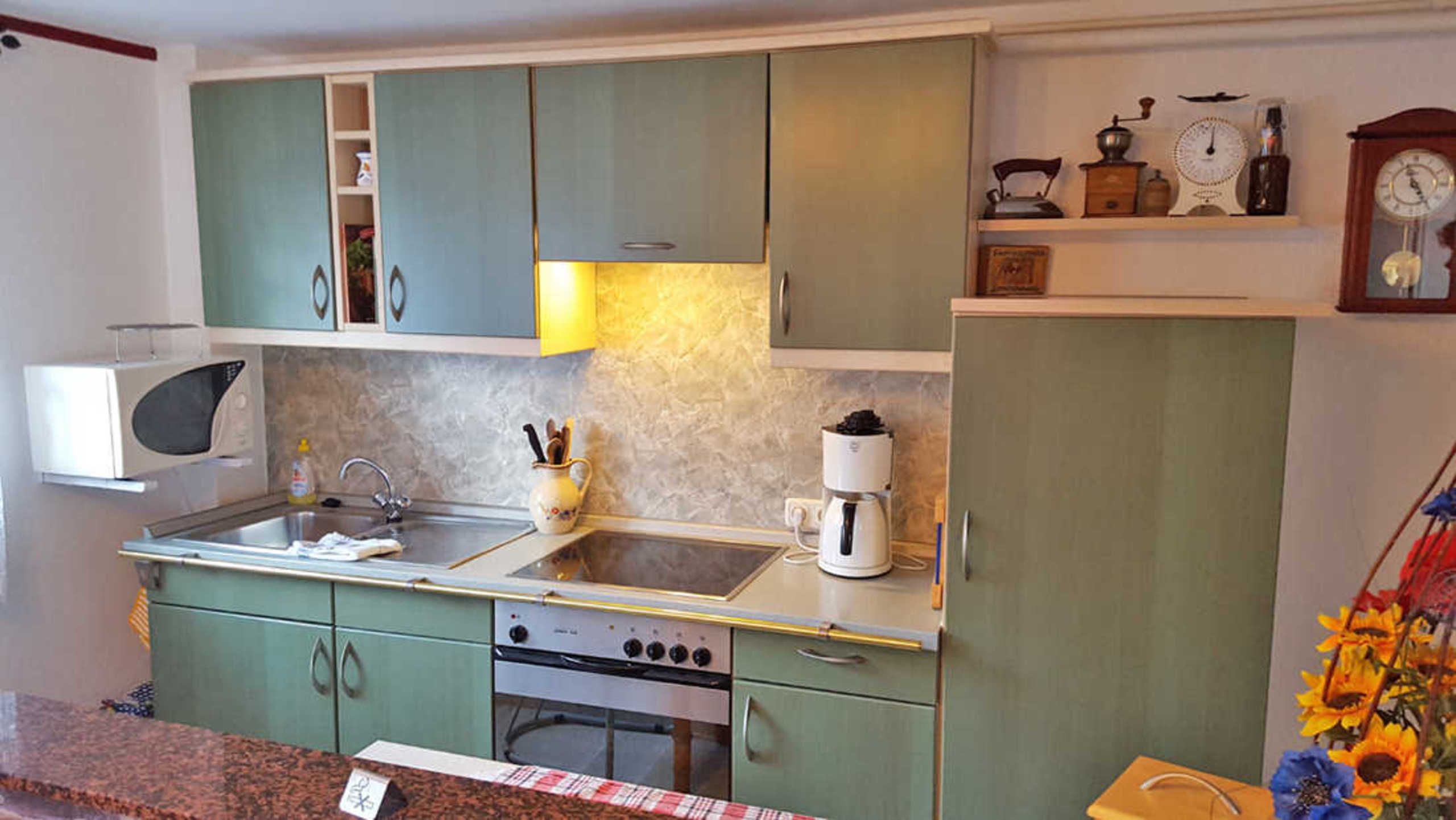 Die vollausgestattete offene Küche passt sich durch eine kleine Abgrenzung optisch wunderbar in das Bild des Wohnzimmers ein. In supergemütlichen Sesseln können Sie den Abend ausklingen lassen. Die Küche ist mit Geschirr, Ceran-Kochfeld, Backofen, Kühlschrank mit Gefriermöglichkeit, Kaffeemaschine, Mikrowelle, Toaster und Wasserkocher ausgestattet.