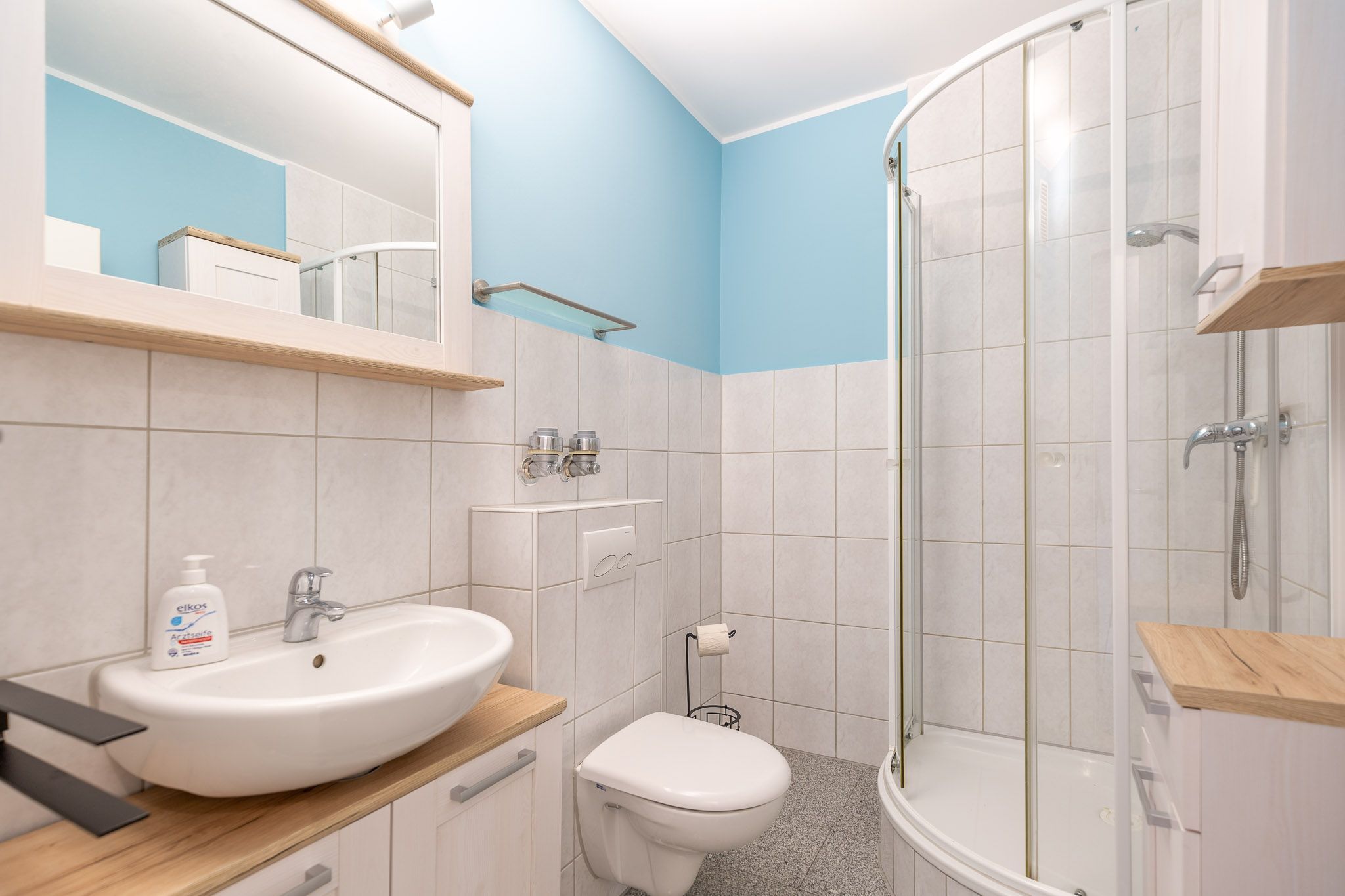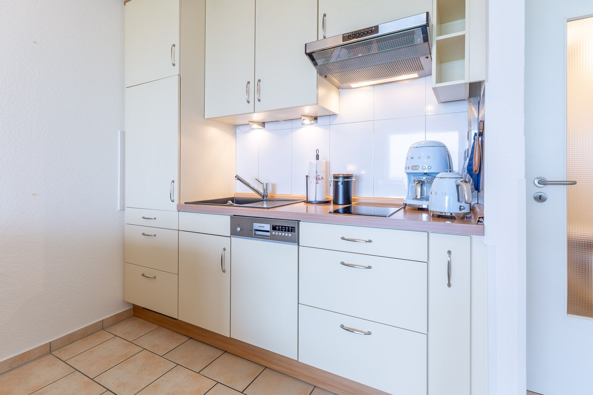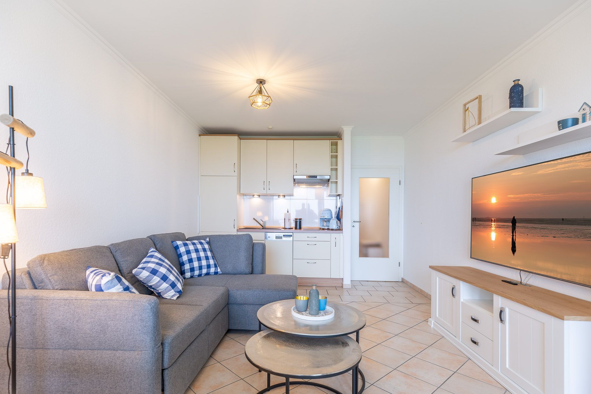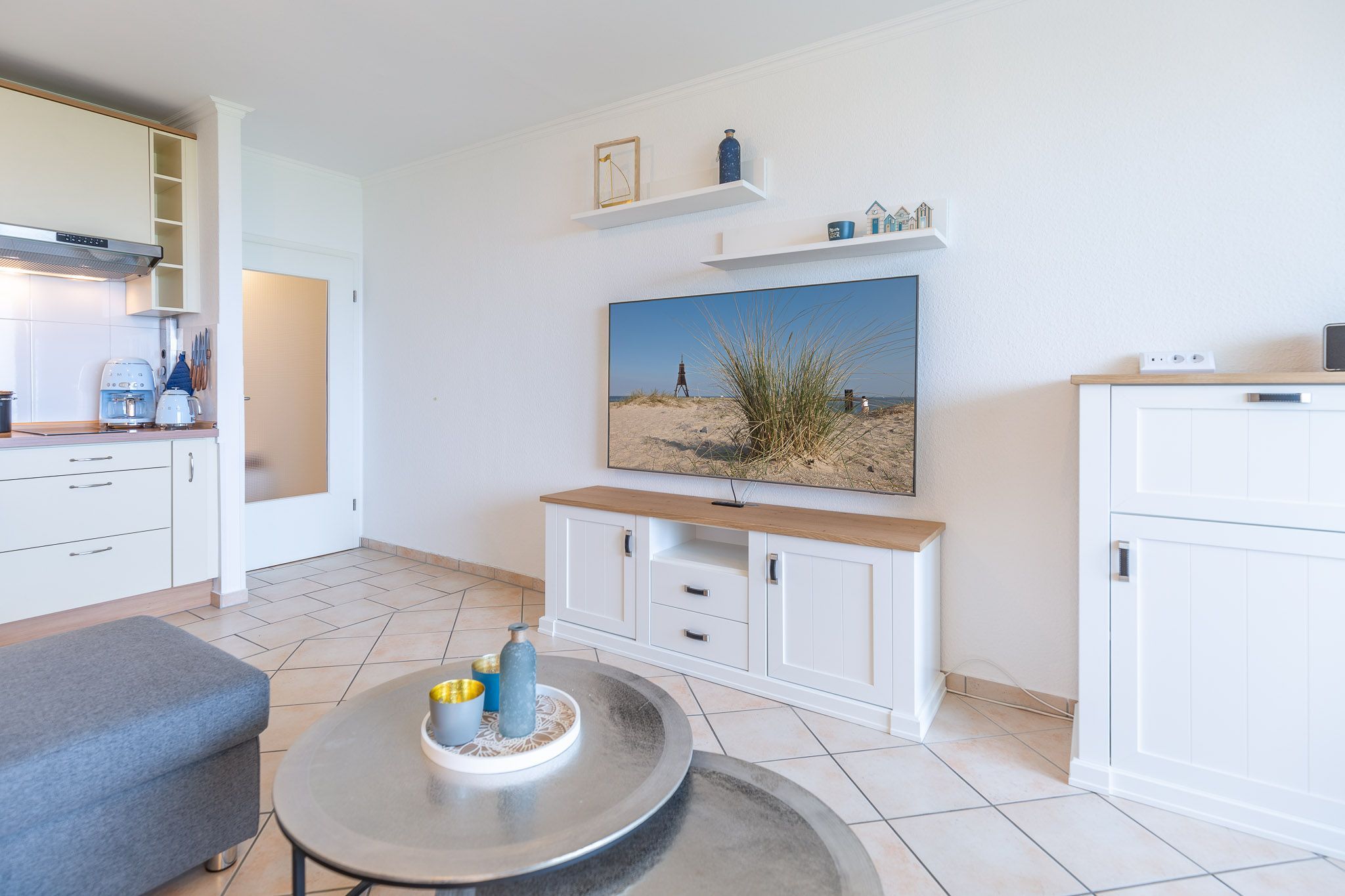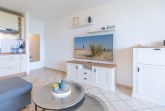 Der Flachbildfernseher im Wohnbereich gewährleistet, dass Sie auch im Urlaub nicht auf Ihre Lieblingsserie verzichten müssen. Die Küchenzeile ist mit einem Geschirrspüler, 2-Plattenherd, Kühlschrank und allen notwendigen Küchenutensilien ausgestattet. Ein separates Schlafzimmer mit komfortablen Betten gewährleistet einen erholsamen Schlaf. Elektrische Außenjalousien sorgen dafür, dass Sie nicht von der Morgensonne geweckt werden. Das Bad ist mit Dusche und WC ausgestattet. Zudem können Sie auf dem Balkon die frische Nordseeluft spüren, den Ausblick genießen und die Zeit vergessen. Zur Ferienwohnung gehört eine Garage (2,06 m Höhe, 2,20 m Breite (Garagentor) und ca. 5,00 m Länge).