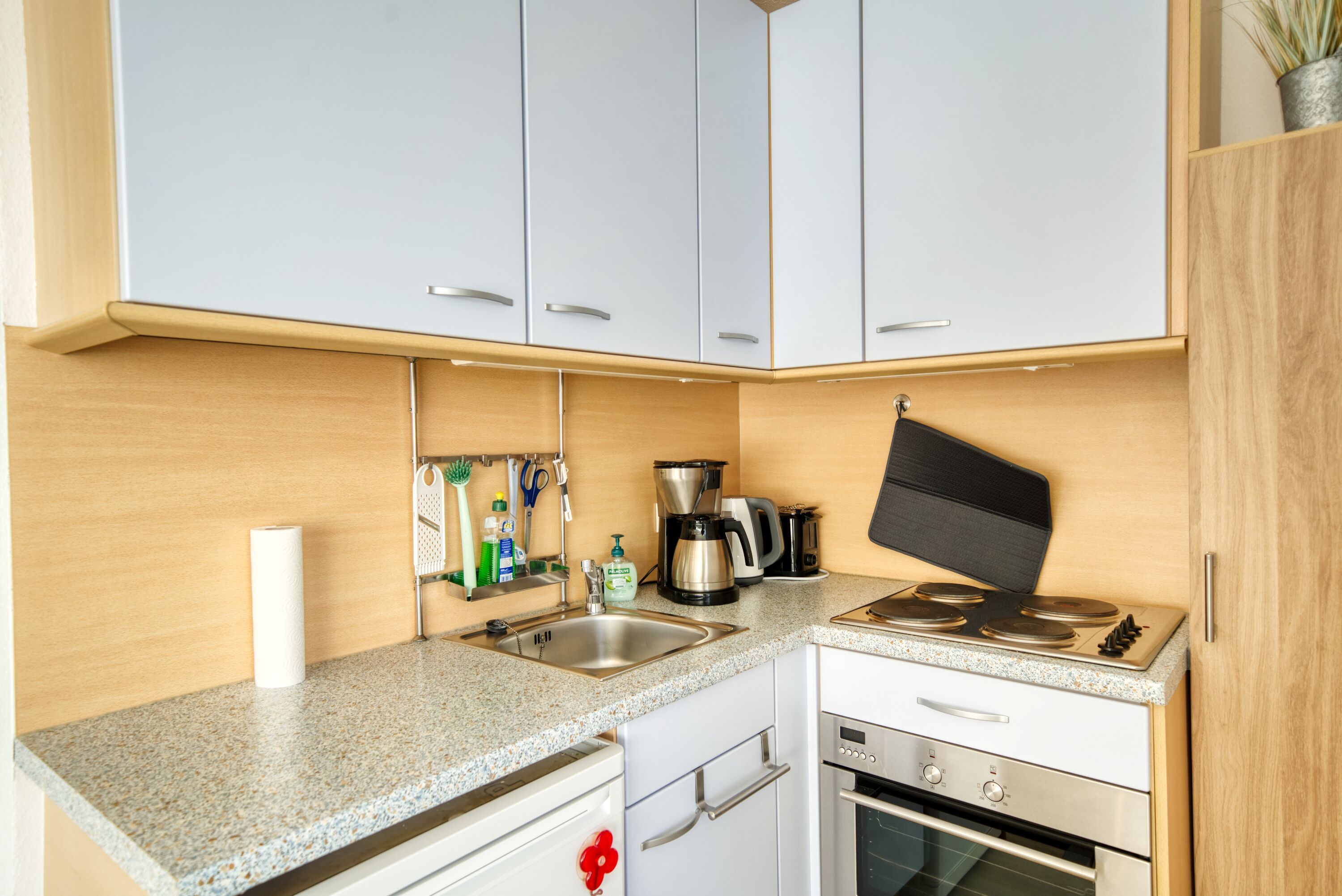 Komplett eingerichtete Küche mit Kühlschrank + Gefrierfach, 4-Platten-Herd, Backofen
