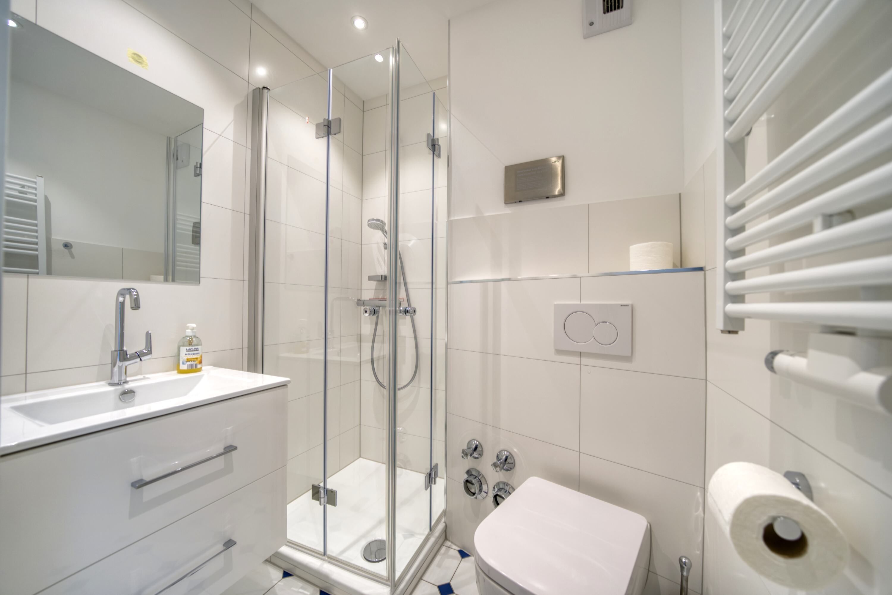 Modernisiertes Bad mit WC, Duschkabine (niedriger Einstieg) und Waschbecken