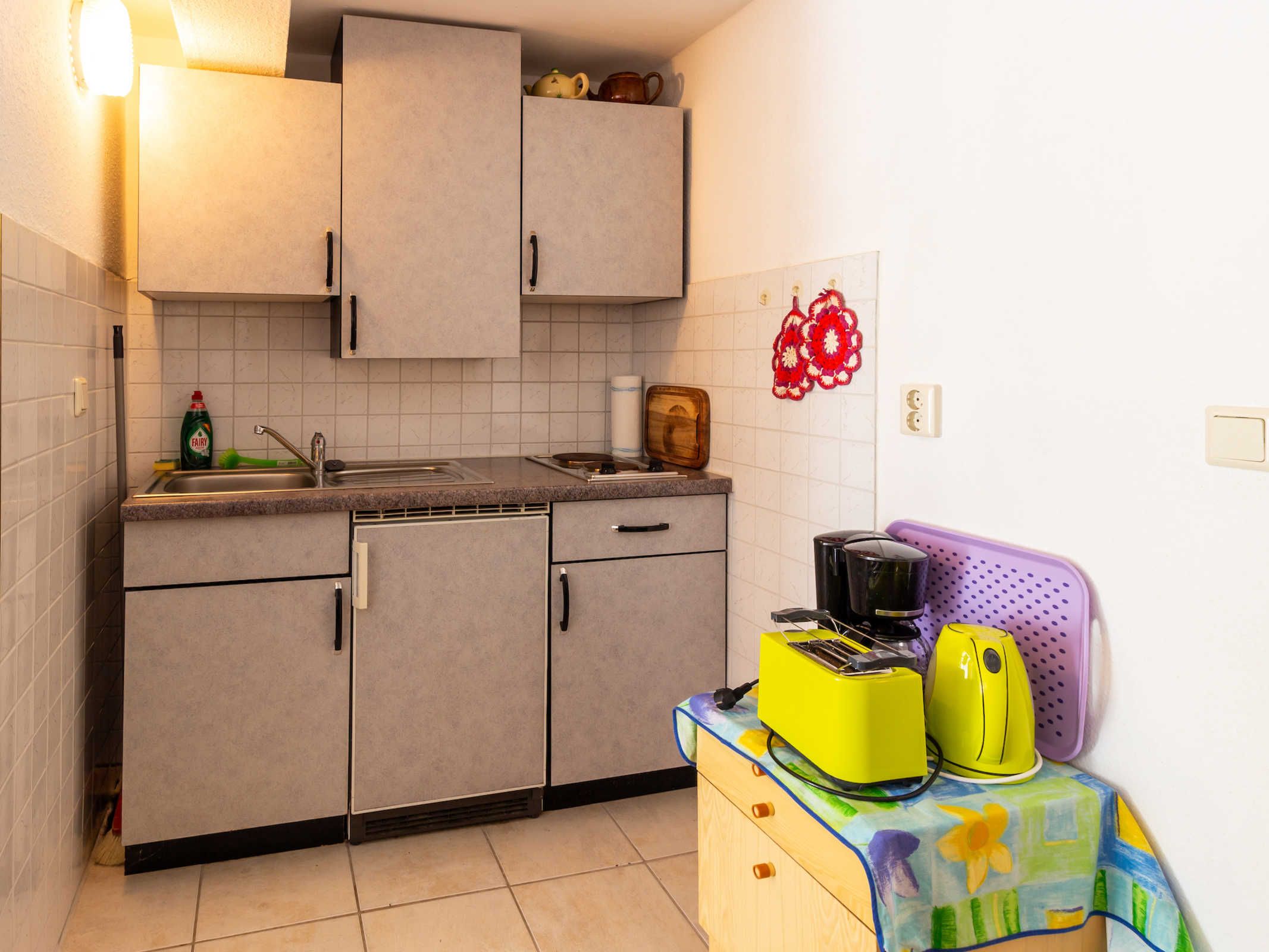 • Pantryküche, Essecke sowie Kaffeemaschine, Wasserkocher, Toaster, Kühlschrank