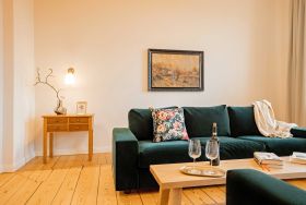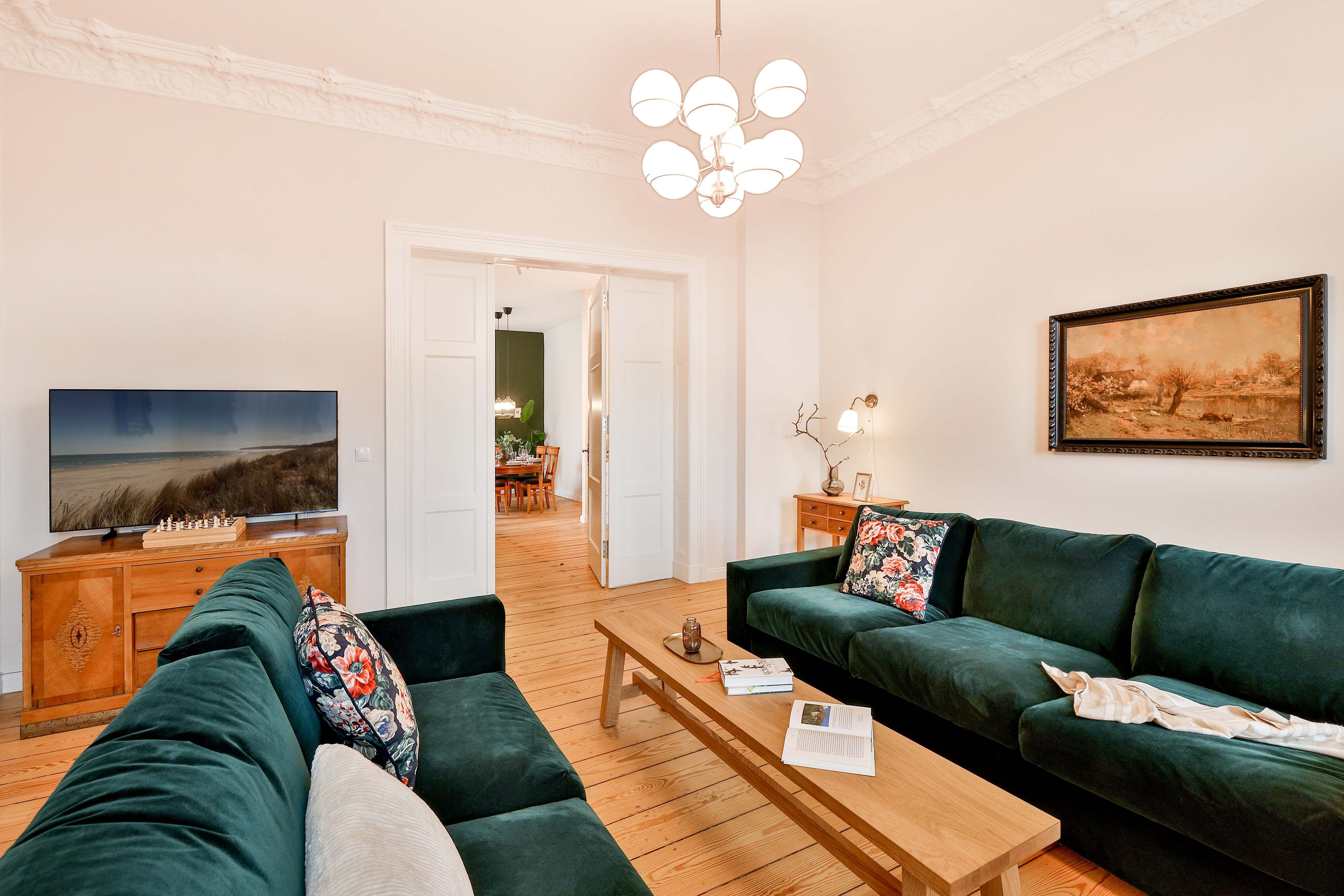 Wohnbereich: Ein einladender Wohnraum mit originalen Dielenböden und kunstvollem Stuck, der eine warme und gemütliche Atmosphäre schafft. Hier finden Sie zwei bequeme Sofas, wovon sich eins in ein Bettsofa umwandeln lässt und einen Smart-TV.