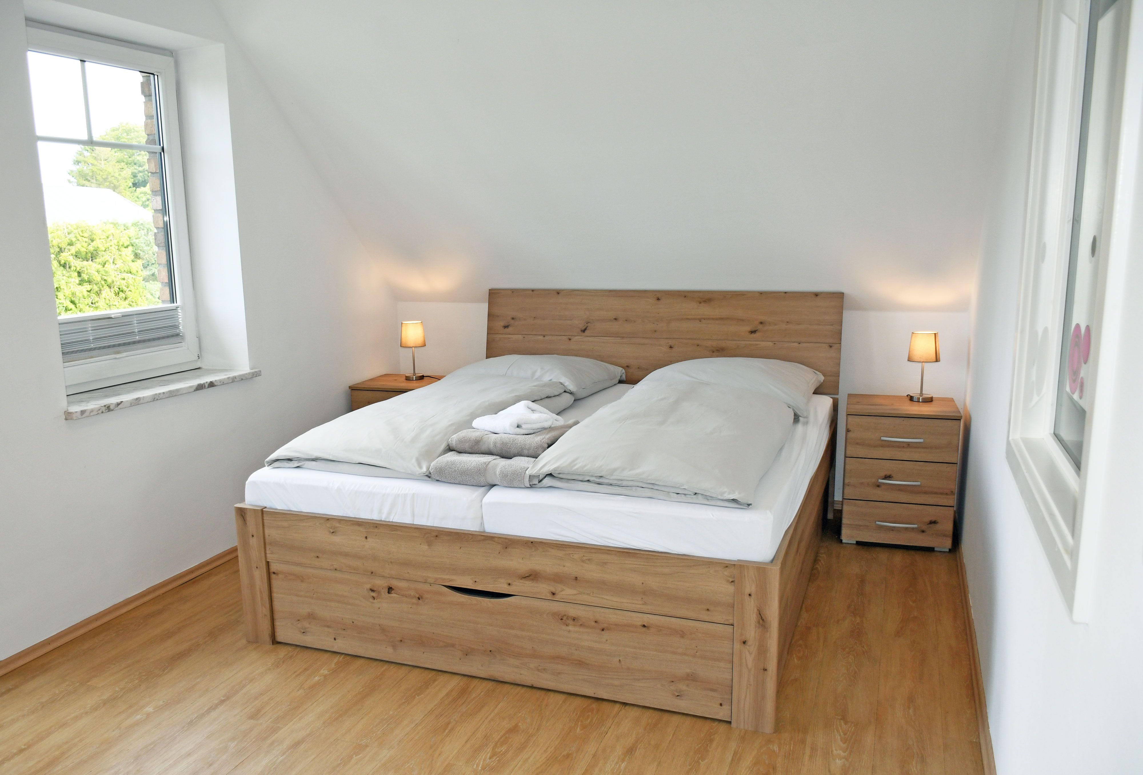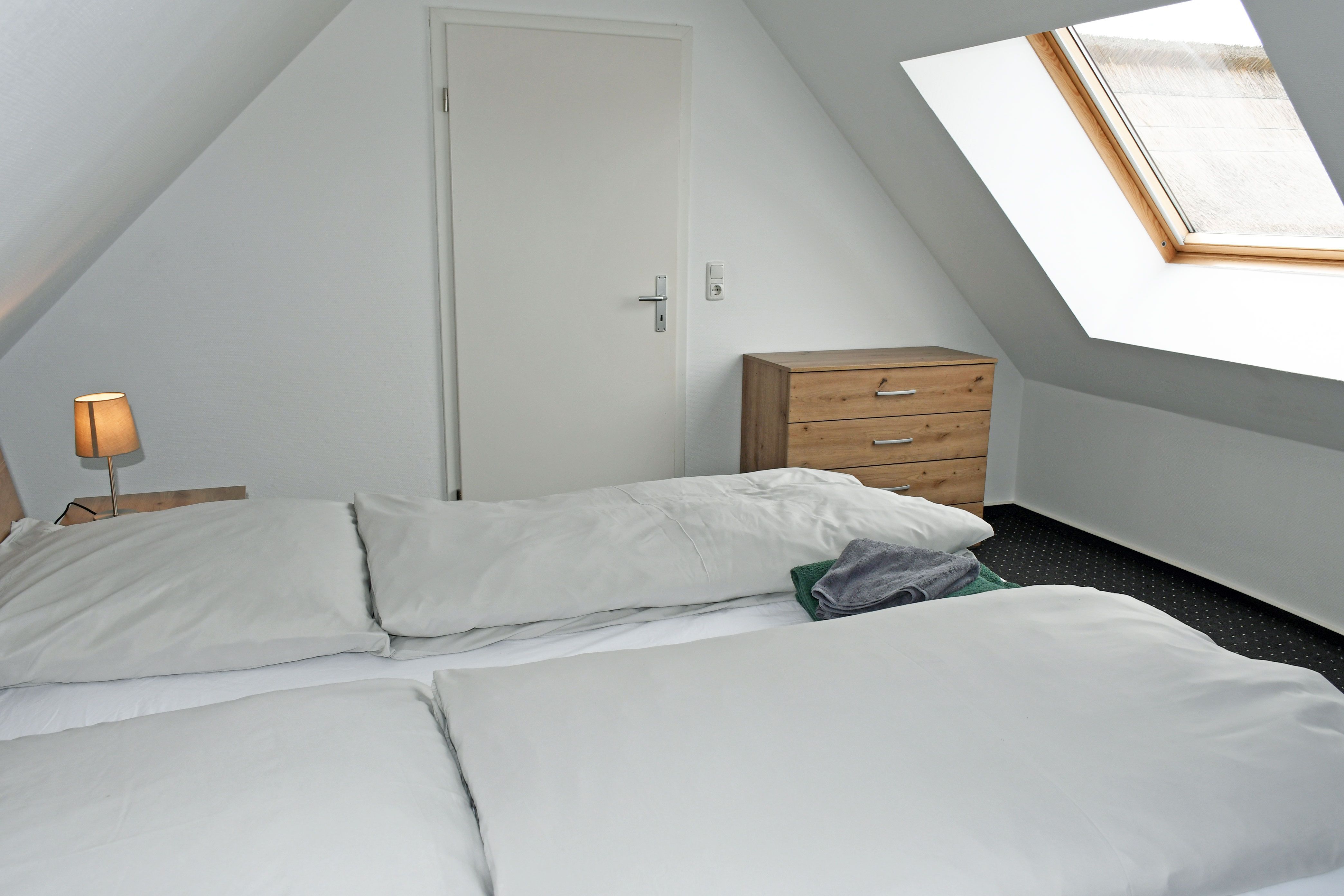Das 1. Schlafzimmer liegt im 1. OG und ist mit einem bequemen Doppelbett (180 x 200cm) mit Nachttischen und Leselampen sowie einem Kleiderschrank ausgestattet. Das 2. Schlafzimmer hat die gleiche Ausstattung und ist über eine Treppe im Dachgeschoss erreichbar. Ein kleines Kinderreisebett und ein Hochstuhl können auf Wunsch kostenlos in diesen beiden Schlafzimmern zur Verfügung gestellt werden. Ebenfalls im Dachgeschoss (ohne Türabtrennung nach unten zum Wohnbereich) befindet sich das 3. Schlafzimmer, ebenfalls mit einem bequemen Doppelbett (180 x 200cm) mit Nachttischen und Leselampen sowie einem Kleiderschrank ausgestattet.