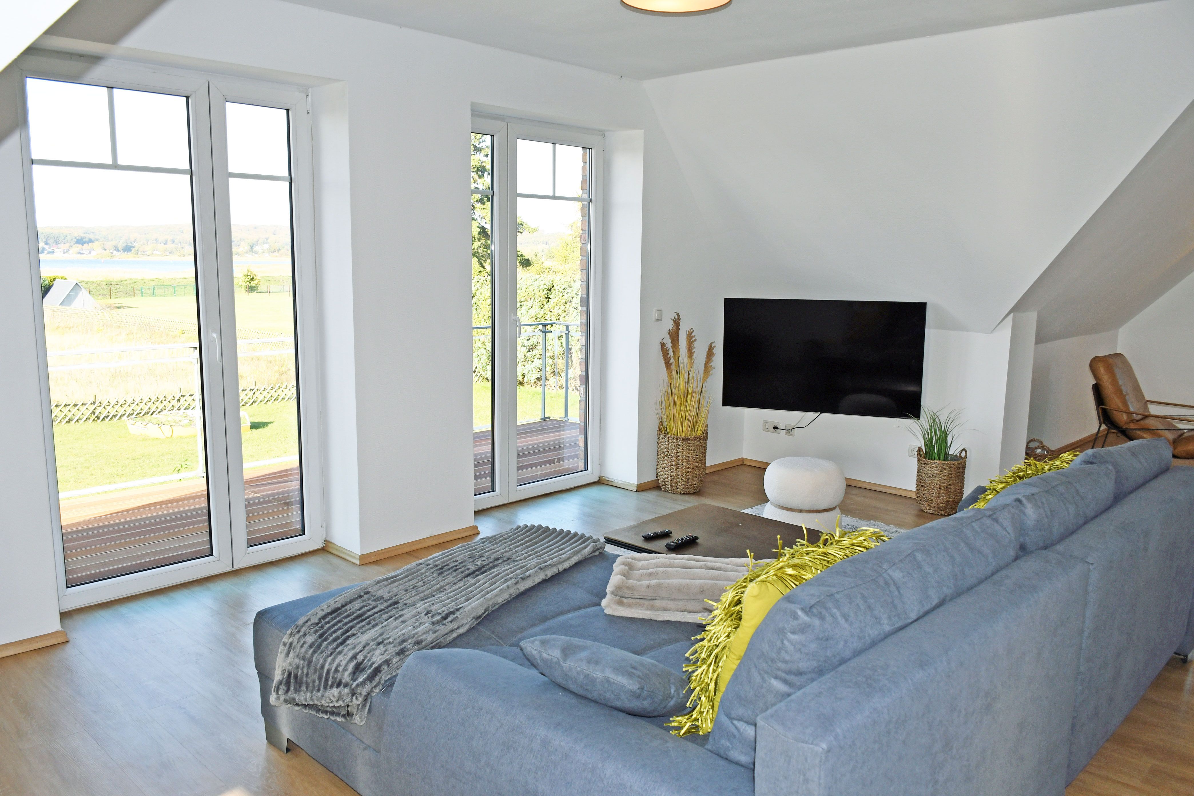 Diese Ferienwohnung wurde modern und komfortabel eingerichtet. Gäste dieser Ferienwohnung können auch ein kostenloses WLAN-Internet nutzen. Im sehr großen Wohnraum befinden sich eine bequeme Couch, Sessel und ein Tisch und ein modernes Flachbild-TV-Gerät. Hier steht auch ein großer Esstisch mit Stühlen. Zu dieser Ferienwohnung gehören 3 sehr große Balkone mit Gartenmöbeln und Sonnenliegen. Sie liegen nach Osten, Süden und Westen. Ais der Ferienwohnung haben Sie eine sehr schönen Panorama-Seeblick über den Selliner See, dessen Uferpromenade sie in 50 m schnell erreichen. Genießen Sie hier bei einem Glas Wein und nach einem schönen Urlaubstag tolle Sonnenuntergänge!
