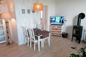 - Wohnzimmer mit Ecksofa (ausziehbar zur Schlafcouch), Kamin, Essbereich für 4 Personen, TV