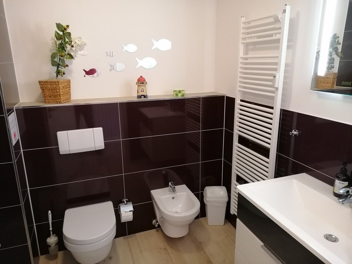 - Badezimmer mit Dusche, WC, Bidet