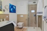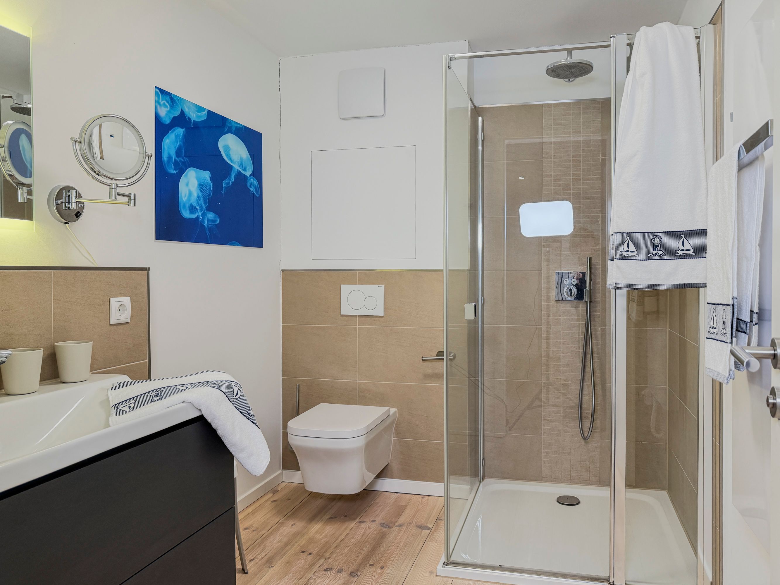 • Badezimmer: Modernes Bad mit ebenerdiger Regendusche, Handtuchtrockner und Haartrockner