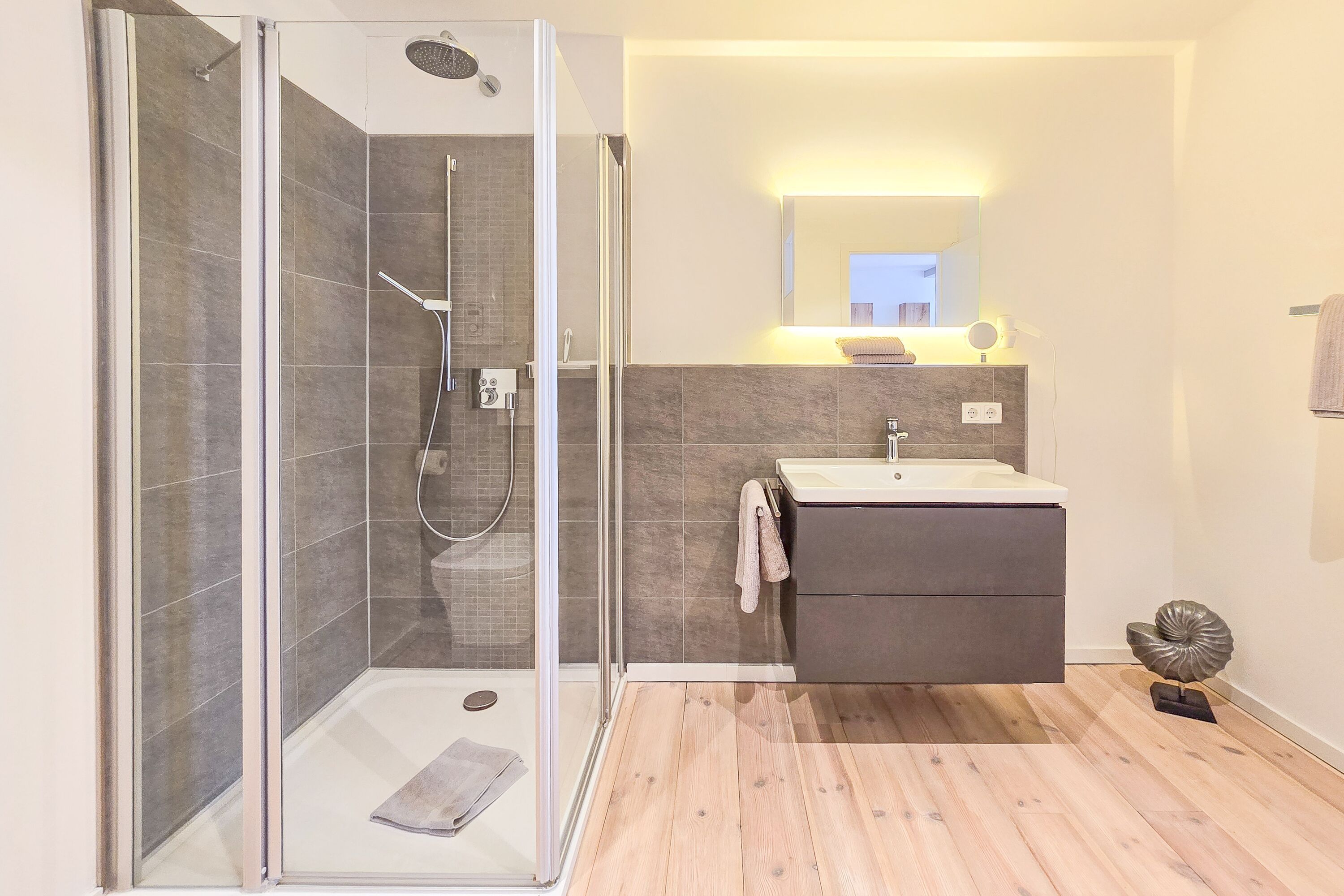 • Badezimmer: Modernes Bad mit ebenerdiger Dusche, Regendusche, Handtuchtrockner und Haartrockner