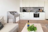 • Küche: Küchenzeile mit Ceranfeld, Kühlschrank, Kaffeevollautomat, Wasserkocher, Toaster sowie Geschirr, Töpfen und Pfannen