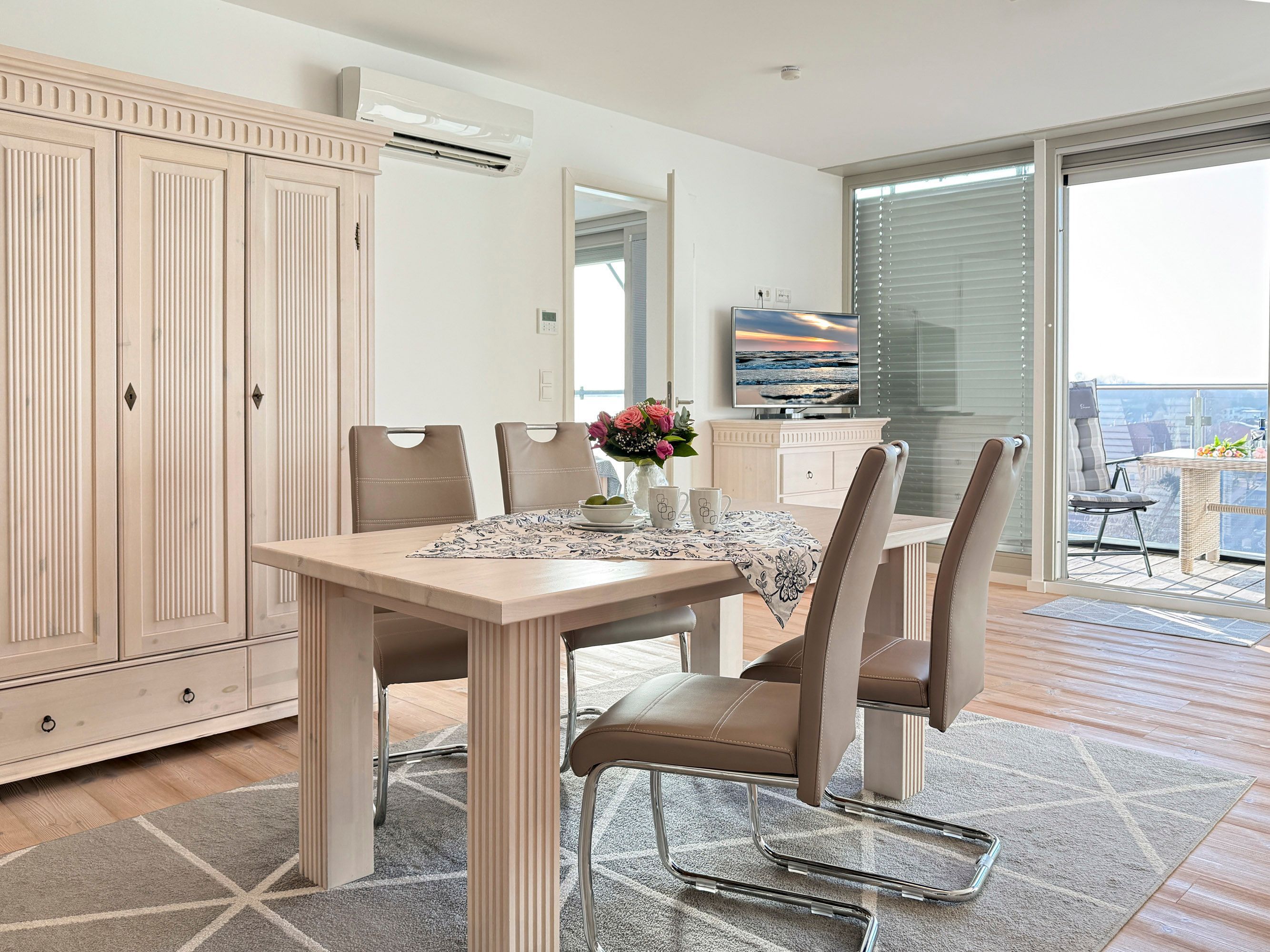 Die Speicherresidenz App. 5.9 empfängt Sie mit einer einladenden Atmosphäre. Der großzügige Wohnbereich mit Schlafcouch und Essplatz lädt zu gemütlichen Abenden ein. In der voll ausgestatteten Küchenzeile können Sie Ihre Lieblingsgerichte zubereiten, die Sie anschließend auf dem Balkon genießen können. Das separate Schlafzimmer bietet komfortable Ruhe, während das moderne Badezimmer mit Dusche zusätzlichen Komfort bietet.