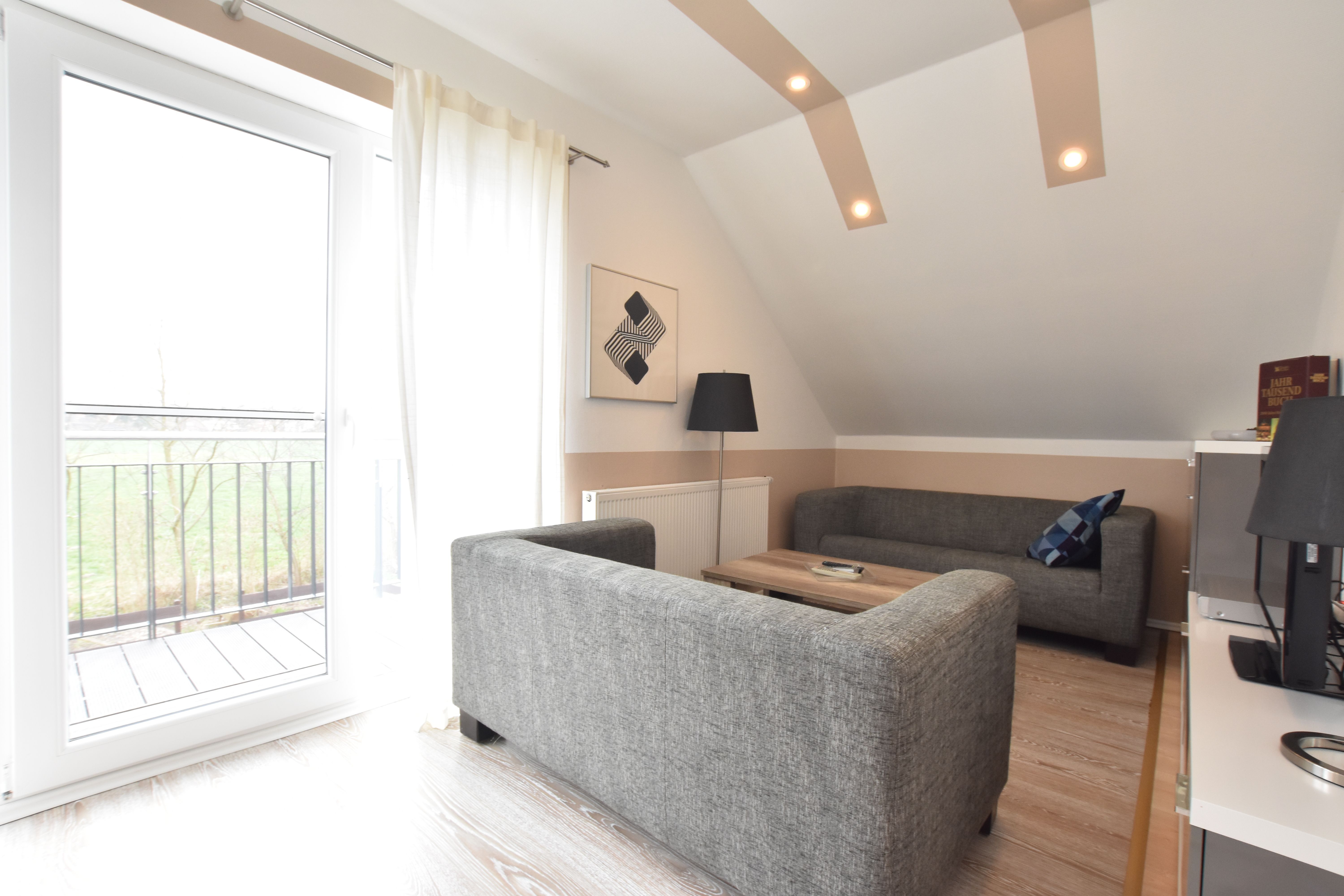 Die gehobene, moderne Ausstattung umfasst einen großen, offen gestalteten Wohnraum mit einer großzügigen Sofaecke, einem langen Tisch, an dem alle Gäste Platz finden sowie eine voll ausgestattete Küche mit Spülmaschine.