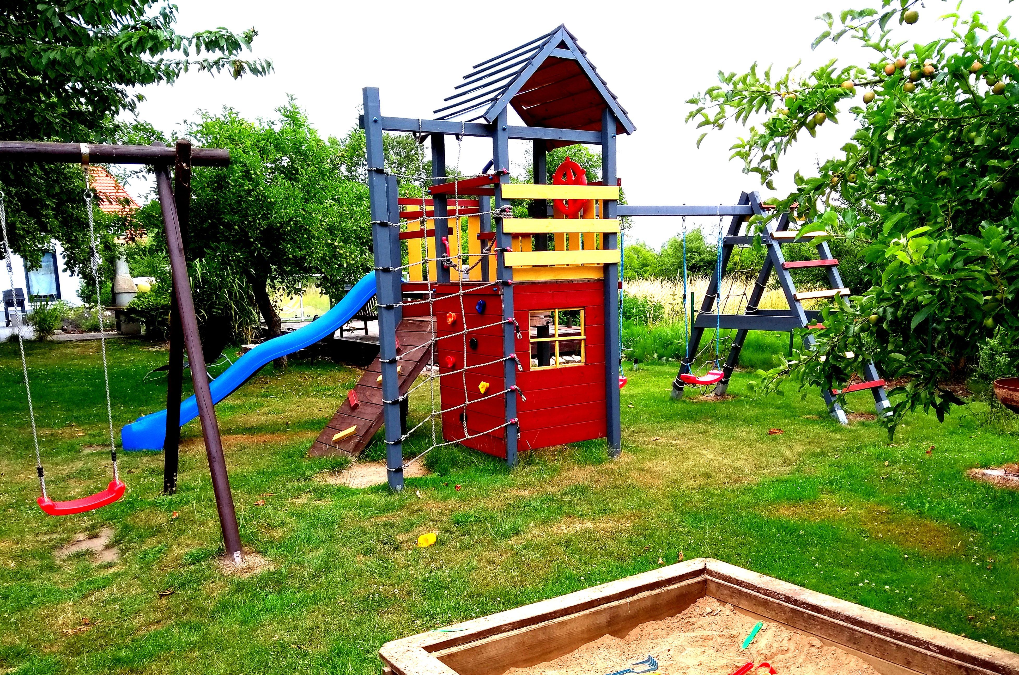 schönem Garten mit Spielgeräten und Grillmöglichkeiten