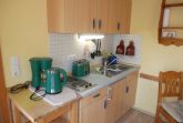 Die lichtdurchflutete Ferienwohnung befindet sich im Erdgeschoß und verfügt über einen kombinierten Wohn- Essbereich ausgestattet mit einer Pantry Küche, die über eine Mikrowelle, 2 Platten Herd, Kühlschrank mit Gefrierfach, Toaster, Wasserkocher und Kaffeemaschine verfügt.