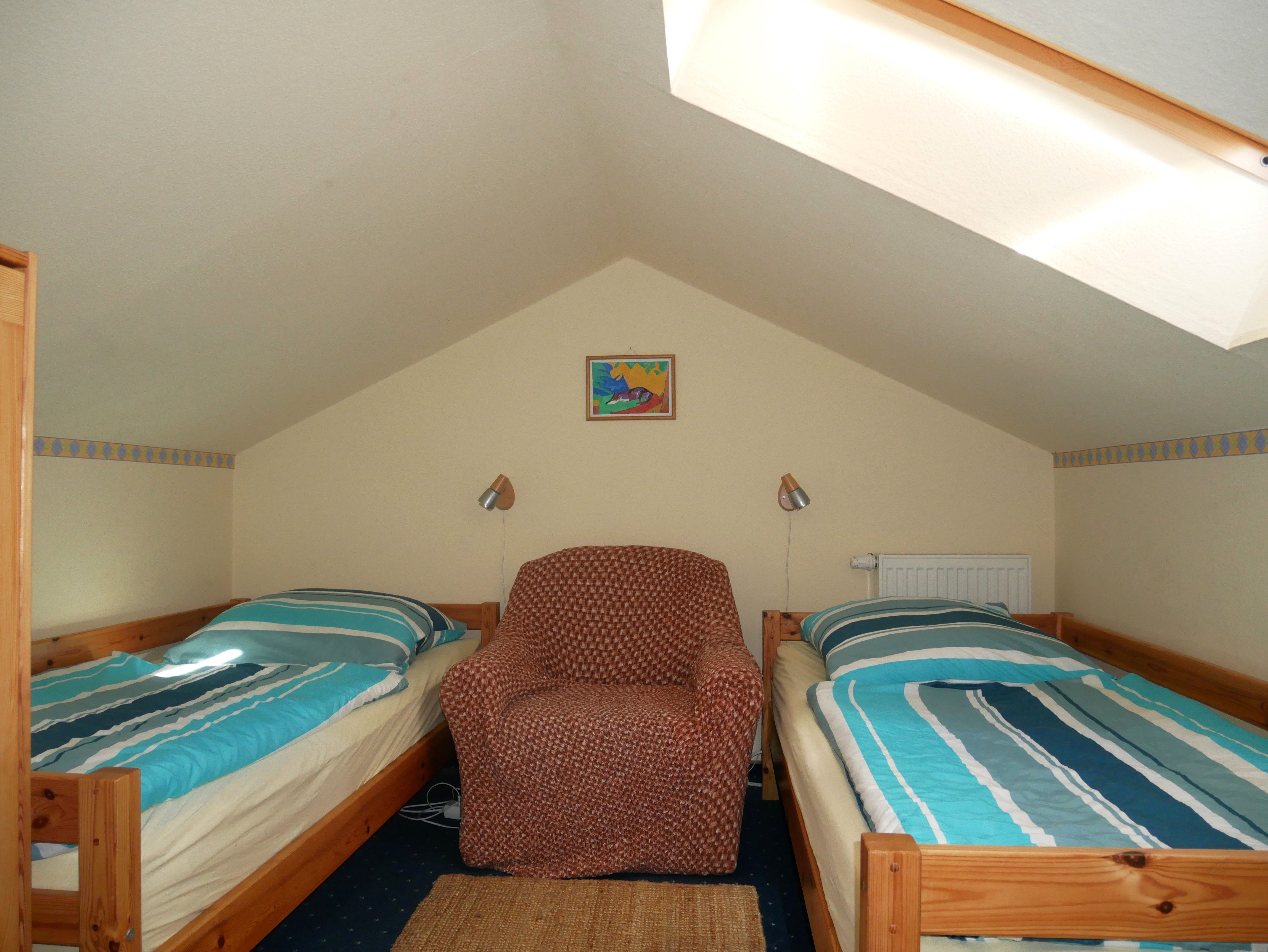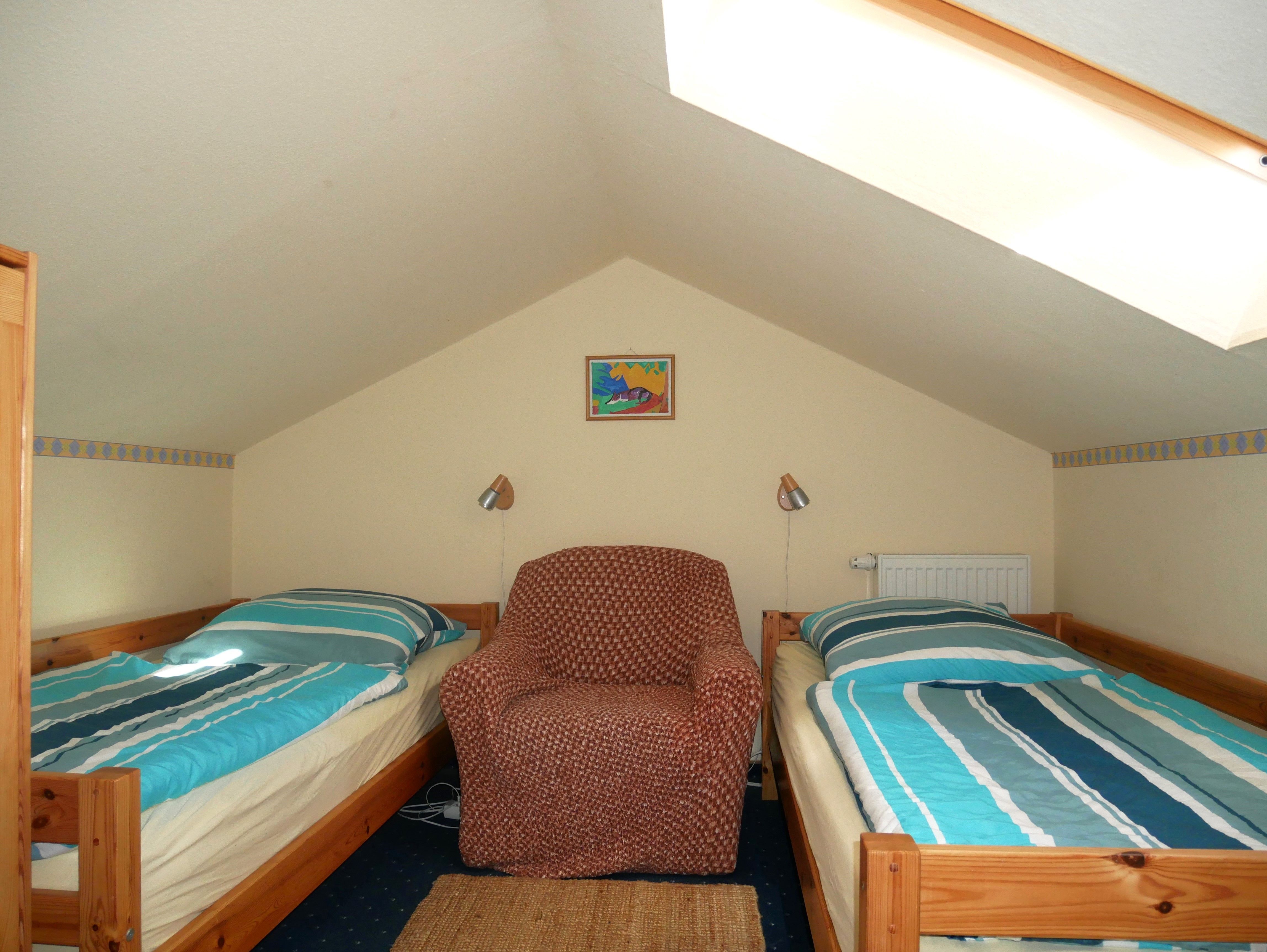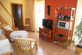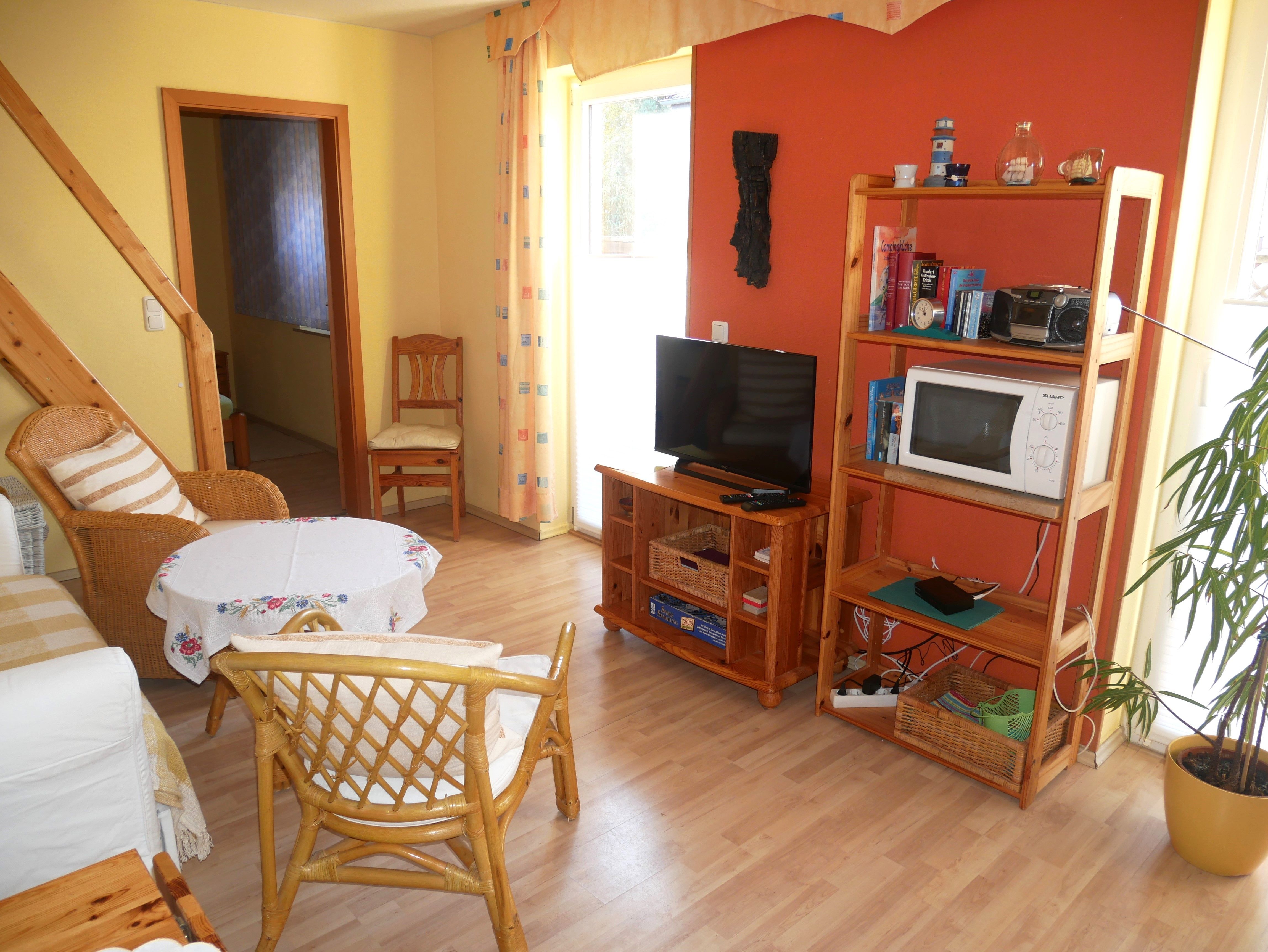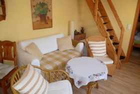 Eine gemütliche Sofaecke mit Flachbild- TV und Esstisch mit 4 Stühlen laden im Wohnraum zum Verweilen ein. Vom Wohnzimmer aus gelangen Sie über die STEILE RAUMSPARTREPPE (für Kinder erst ab 4 Jahren geeignet!) zum offenen Schlafboden, wo 2 Einzelbetten und ein kleiner Schrank stehen.