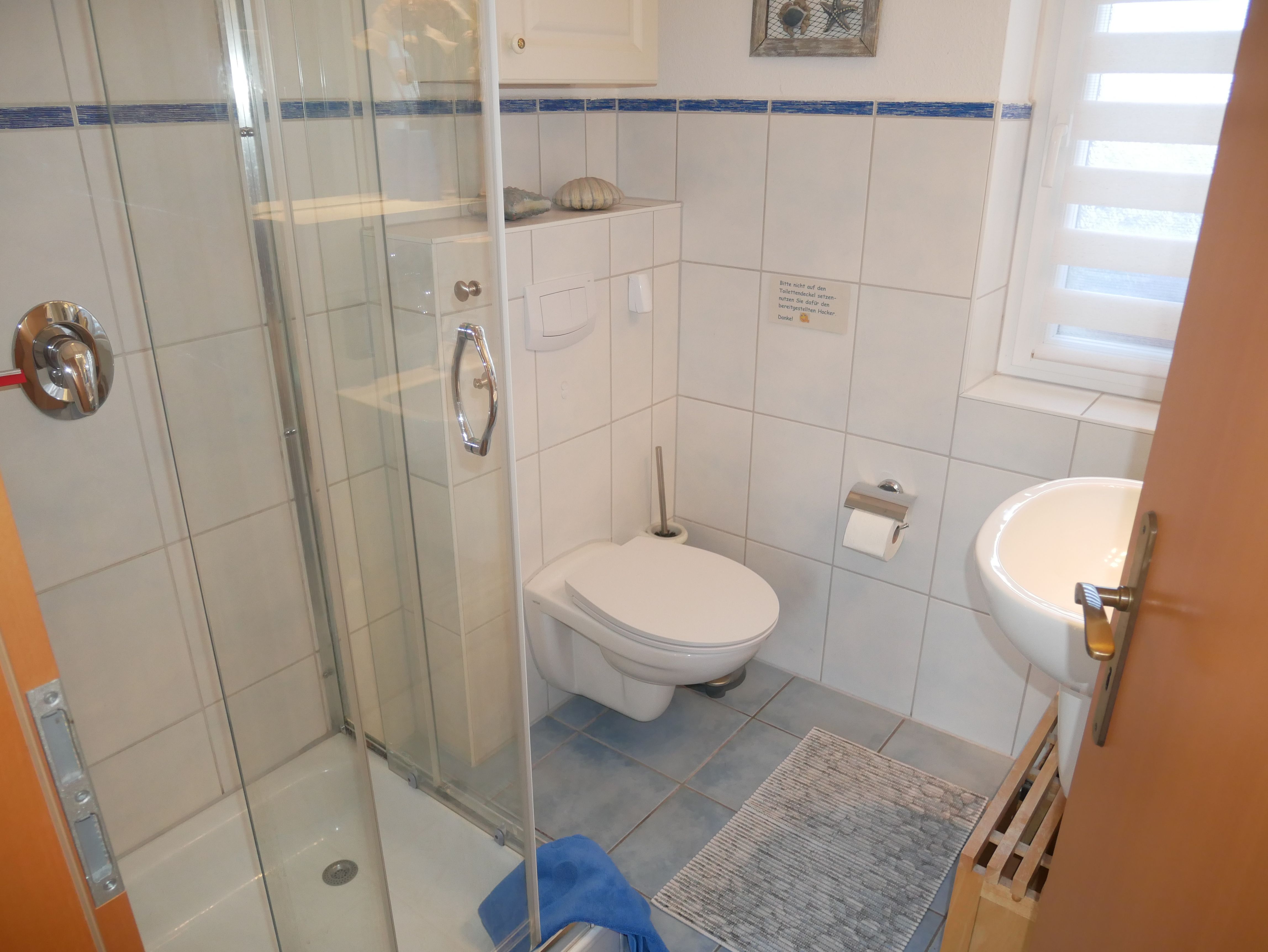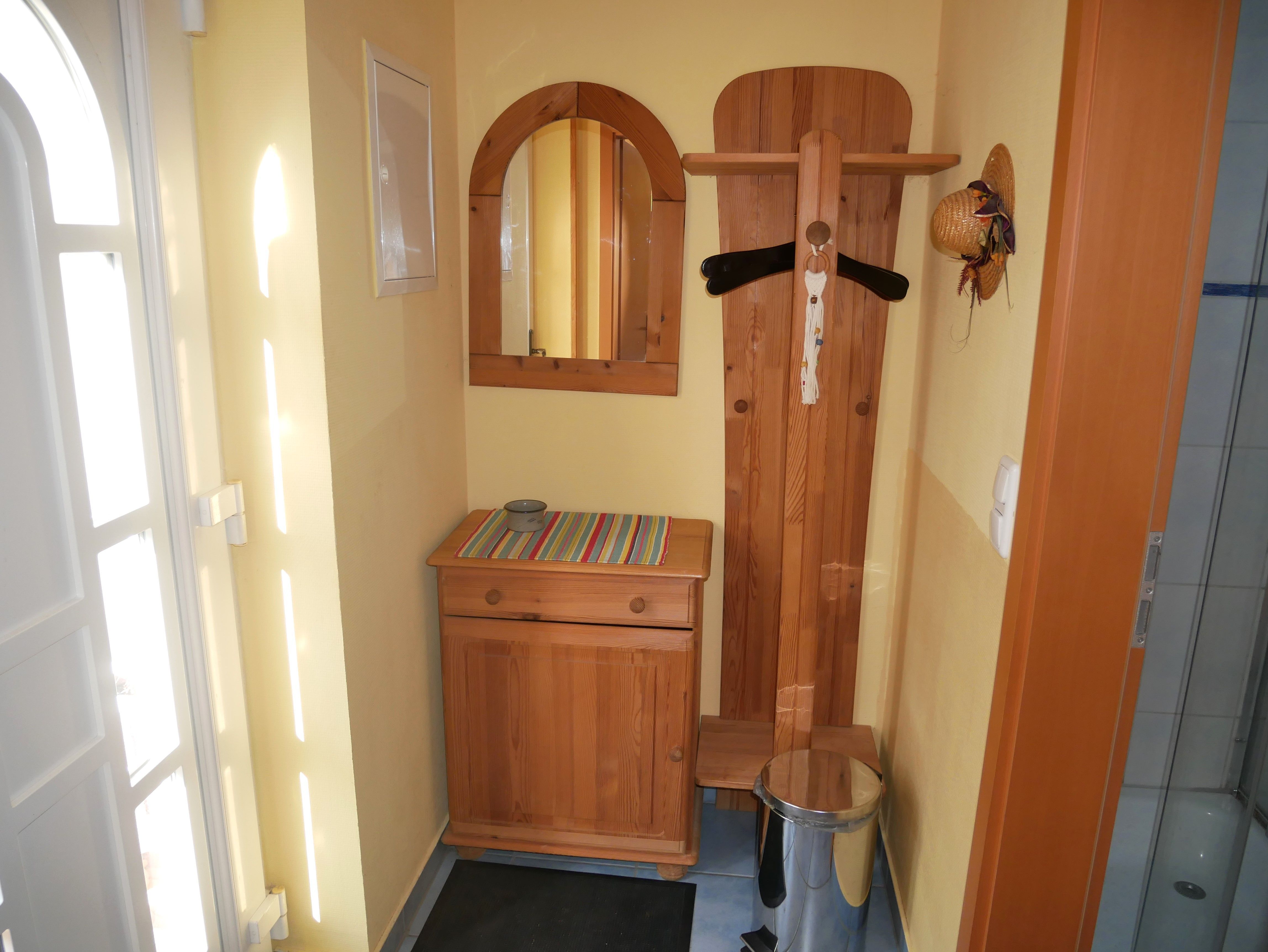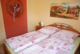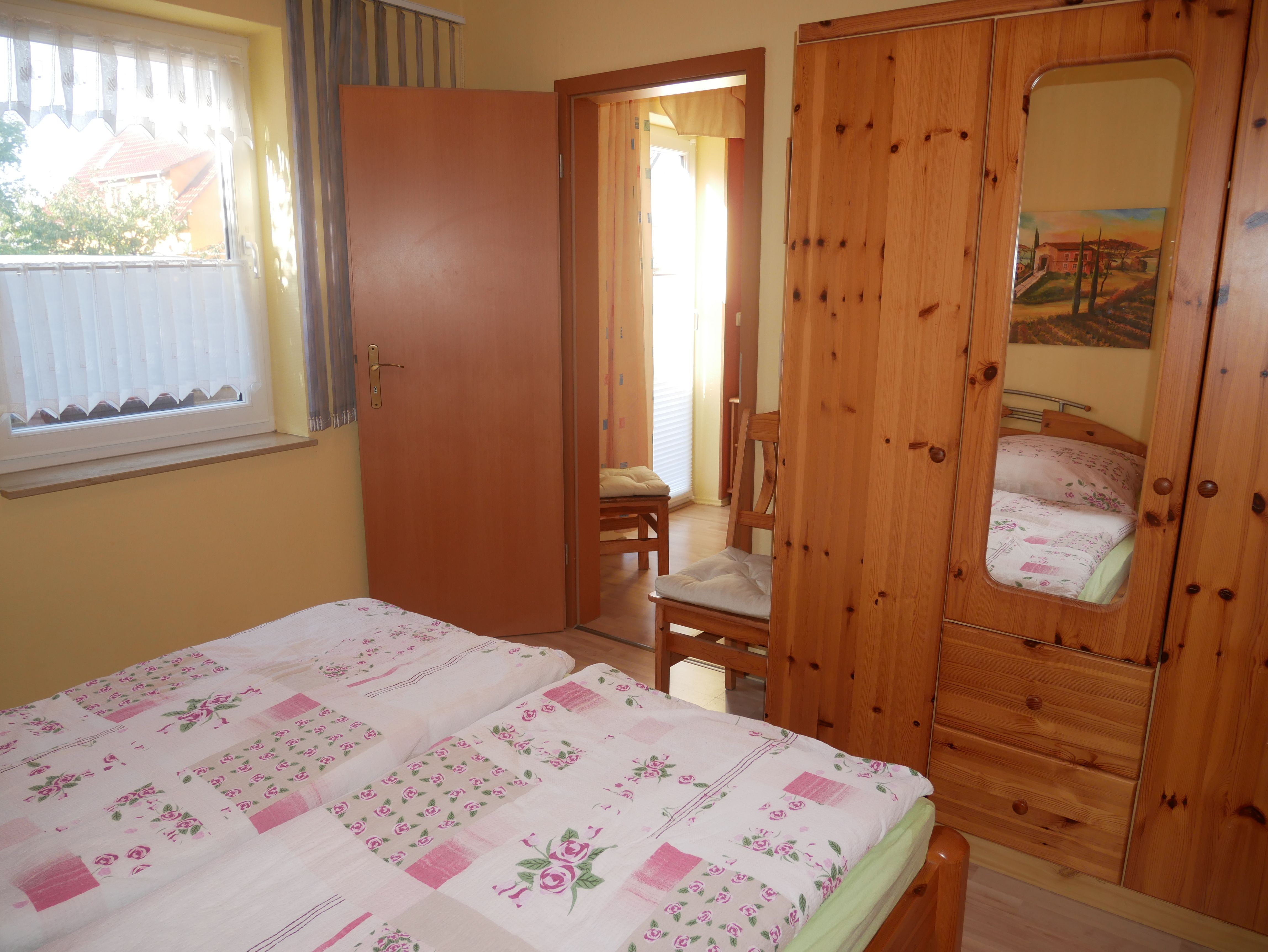 Ebenfalls im Erdgeschoss befindet sich das Elternschlafzimmer mit Doppelbett (1,60m x 2,00m) und Kleiderschrank. Hier kann auch ein Kinderreisebett aufgestellt werden. Das kleine Tageslicht Badezimmer ist mit einer Dusche und WC ausgestattet.