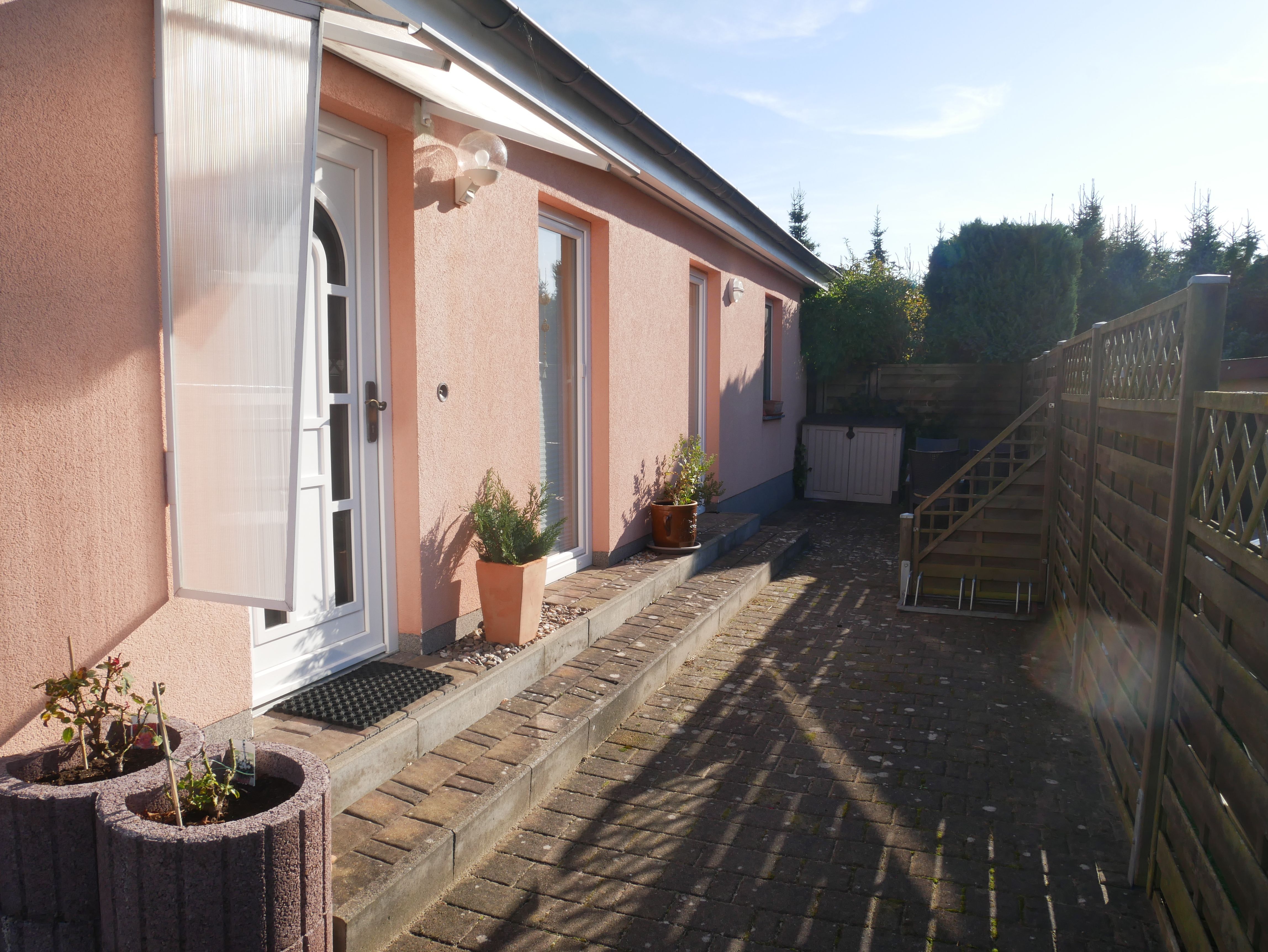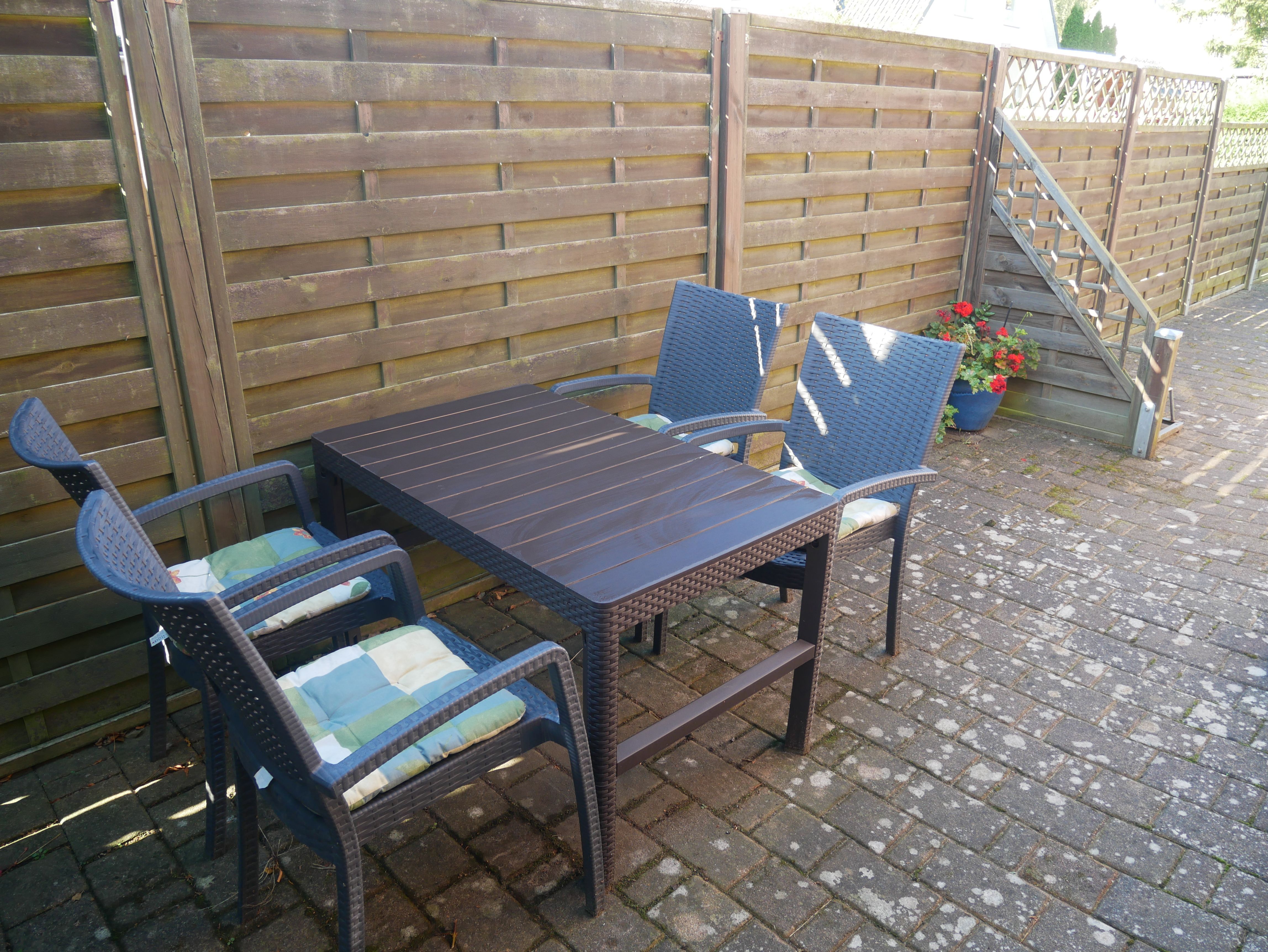 Die Wohnung verfügt über eine schöne separate Terrasse mit gemütlicher Sitzecke, Sonnenschirm sowie Grillmöglichkeit. Direkt vor dem Eingang steht ein Fahrradständer zur Verfügung, wo Sie Ihre Fahrräder abstellen können. Das Grundstück ist bis auf die Zufahrt umzäunt.