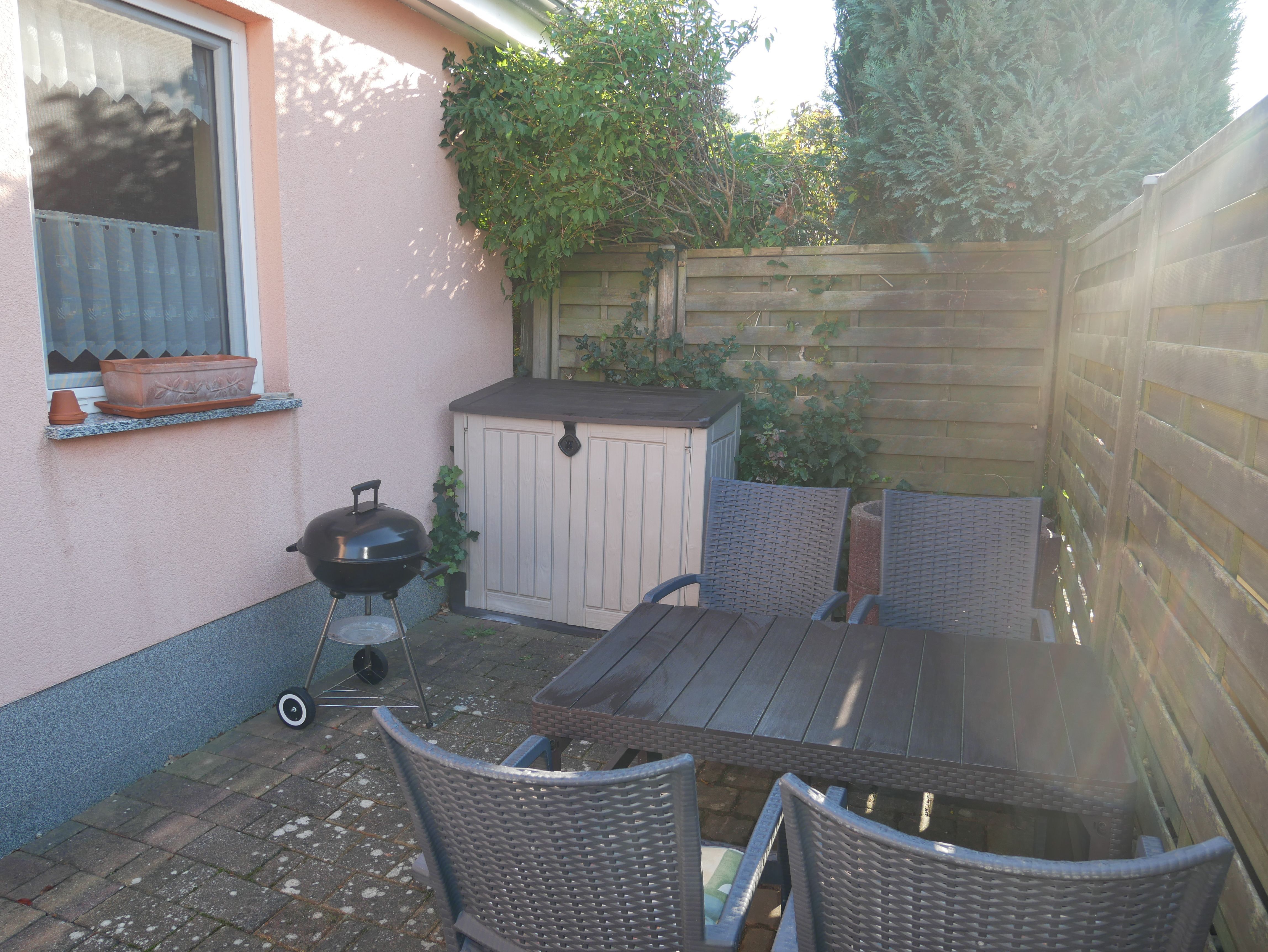 Auf der Terrasse stehen Ihnen eine Sitzecke mit Sonnenschirm und Grill zur Verfügung. Ein Fahrradständer befindet sich direkt vor der Wohnung.