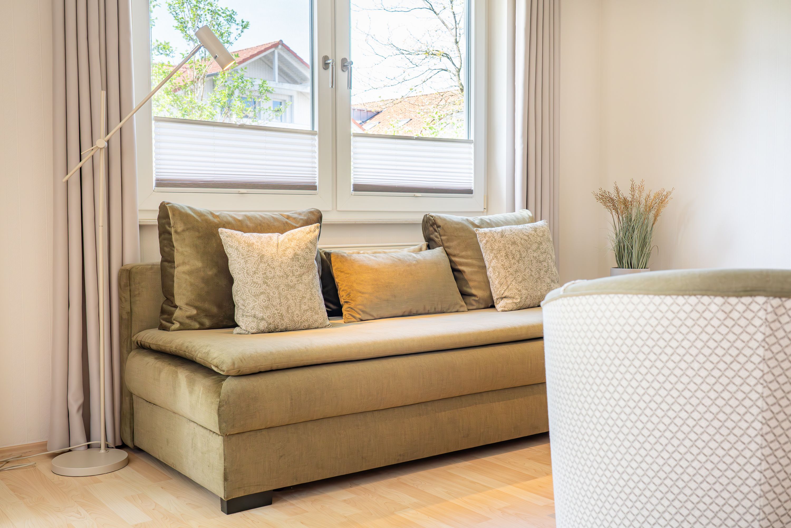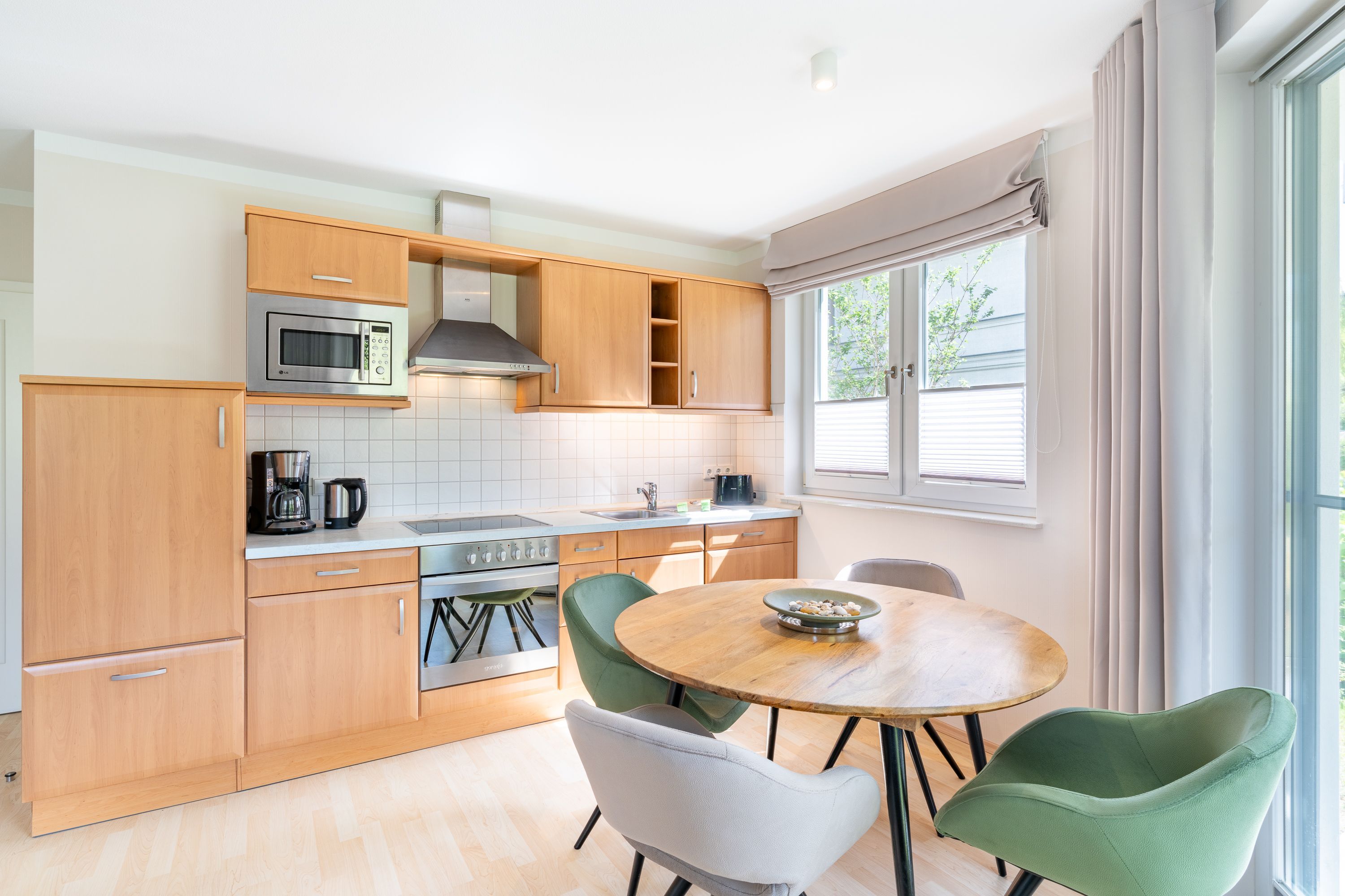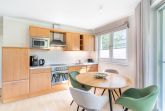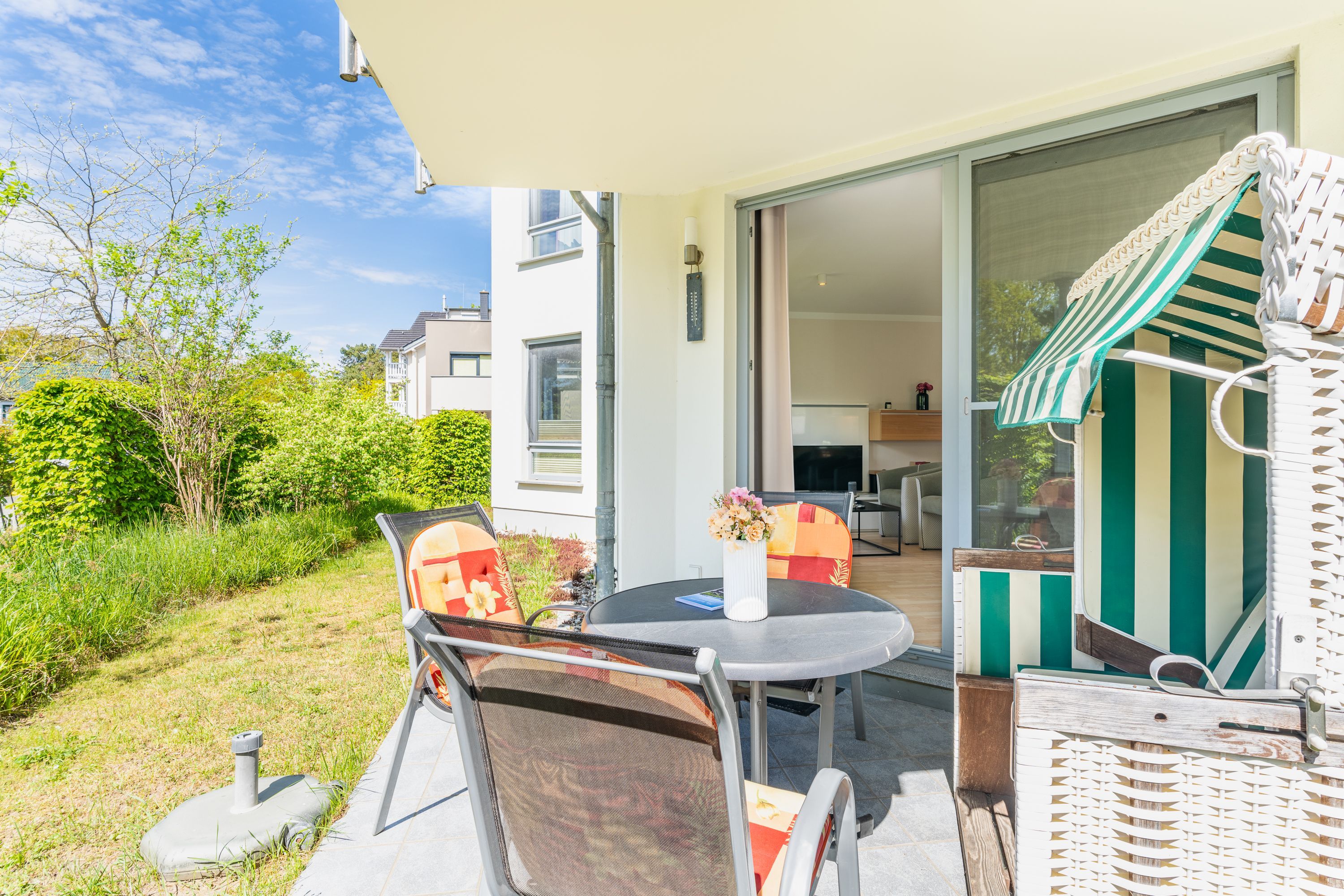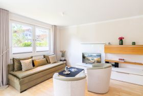 Modern und gemütlich zugleich: Auf Ihrer Terrasse im Grünen können Sie bereits beim morgendlichen Kaffee das Rauschen der Ostsee genießen. Der stilvoll gestaltete Wohnbereich ist mit einem bequemen Sofa und einem Flat-TV ausgestattet. Die integrierte Küchenzeile lässt keine Wünsche offen und bietet alles, was Sie für die Zubereitung Ihrer Lieblingsspeisen benötigen (inkl. Ceranfeld, Backofen, Mikrowelle, Kühlschrank mit Gefrierfach, Geschirrspüler, Wasserkocher, Toaster und Kaffeemaschine). Am Esstisch kann die ganze Familie in geselliger Runde speisen. Vom Wohnzimmer aus gelangen Sie auf Ihre private Terrasse, die zum Sonnenbaden oder abendlichen Spielen mit Blick ins Grüne einlädt. Das freundlich gestaltete Schlafzimmer verfügt über ein bequemes Doppelbett. Zwei weitere Gäste können es sich auf der ausziehbaren Schlafcouch im Wohnbereich für eine erholsame Nacht gemütlich machen.