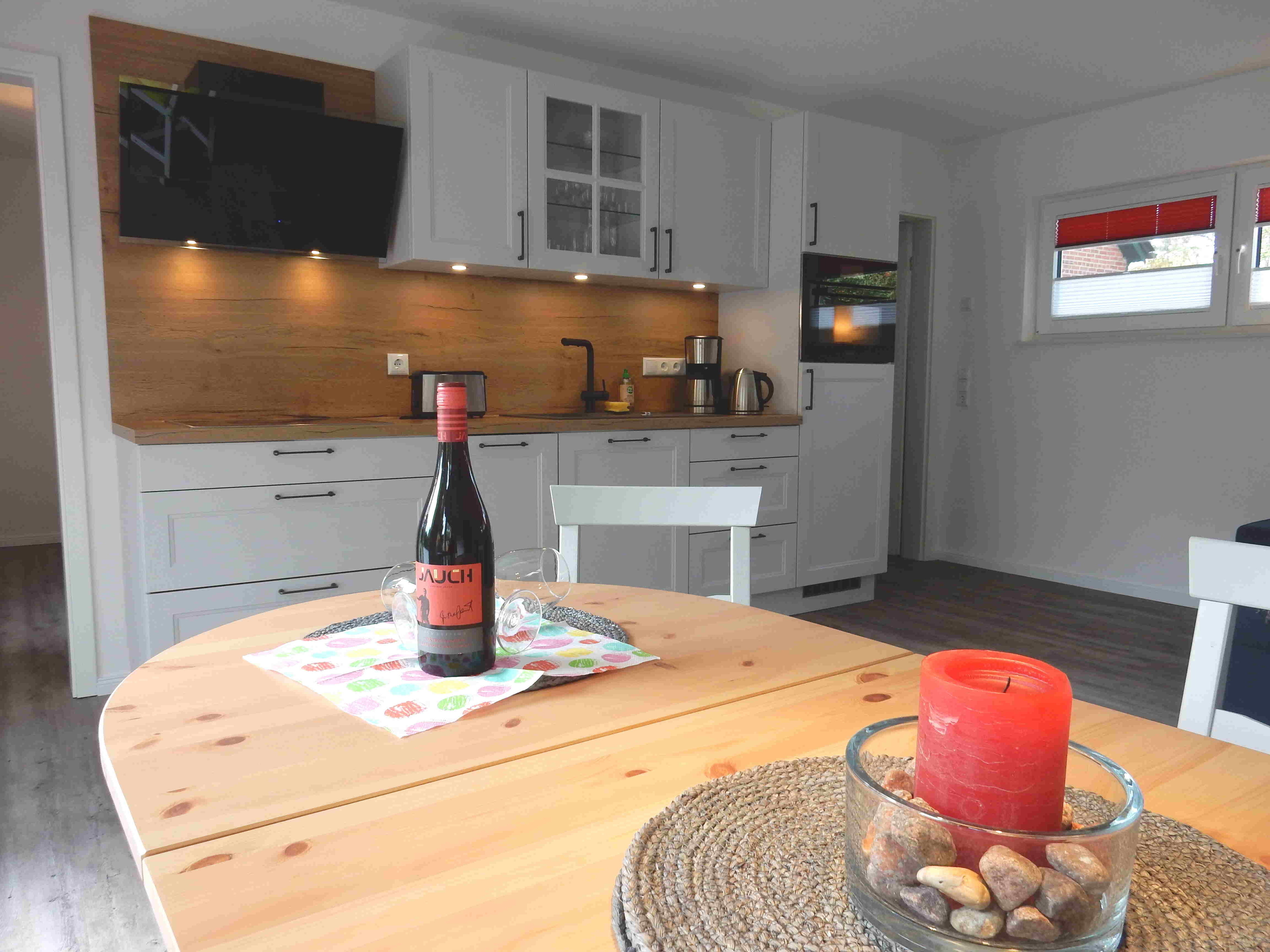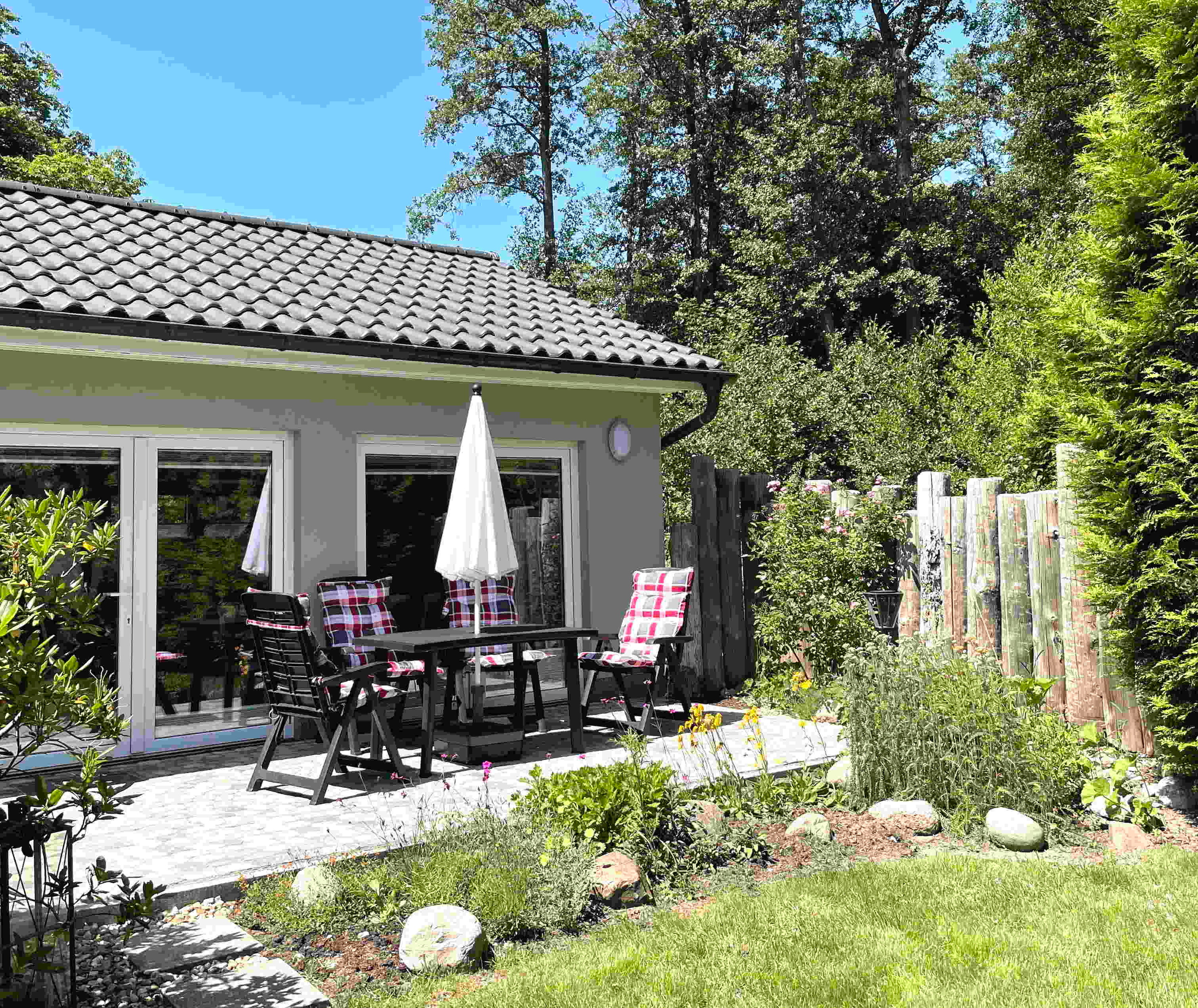 Ferienhaus für zwei Personen mit Terrasse und kleinem, geschütztem Garten hinterm Haus. Modern eingerichtet. Lage am Waldrand und in Strandnähe, direkt am Hauptübergang, schöner Weg zum Strand über den Strom. Separates Schlafzimmer mit Doppelbett (180x200 cm). Badezimmer mit Dusche/WC.Großer Wohn-/Essraum mit Sitzgruppe und Esstisch. TV, WLAN, Bluetooth-Lautsprecher. Küchenzeile mit Kühlschrank (Vier-Sterne-Gefrierfach), Ceran-Kochfeld, Geschirrspülmaschine, Backofen/Mikrowelle-Kombigerät. Kaffeemaschine, Wasserkocher, Toaster.