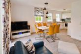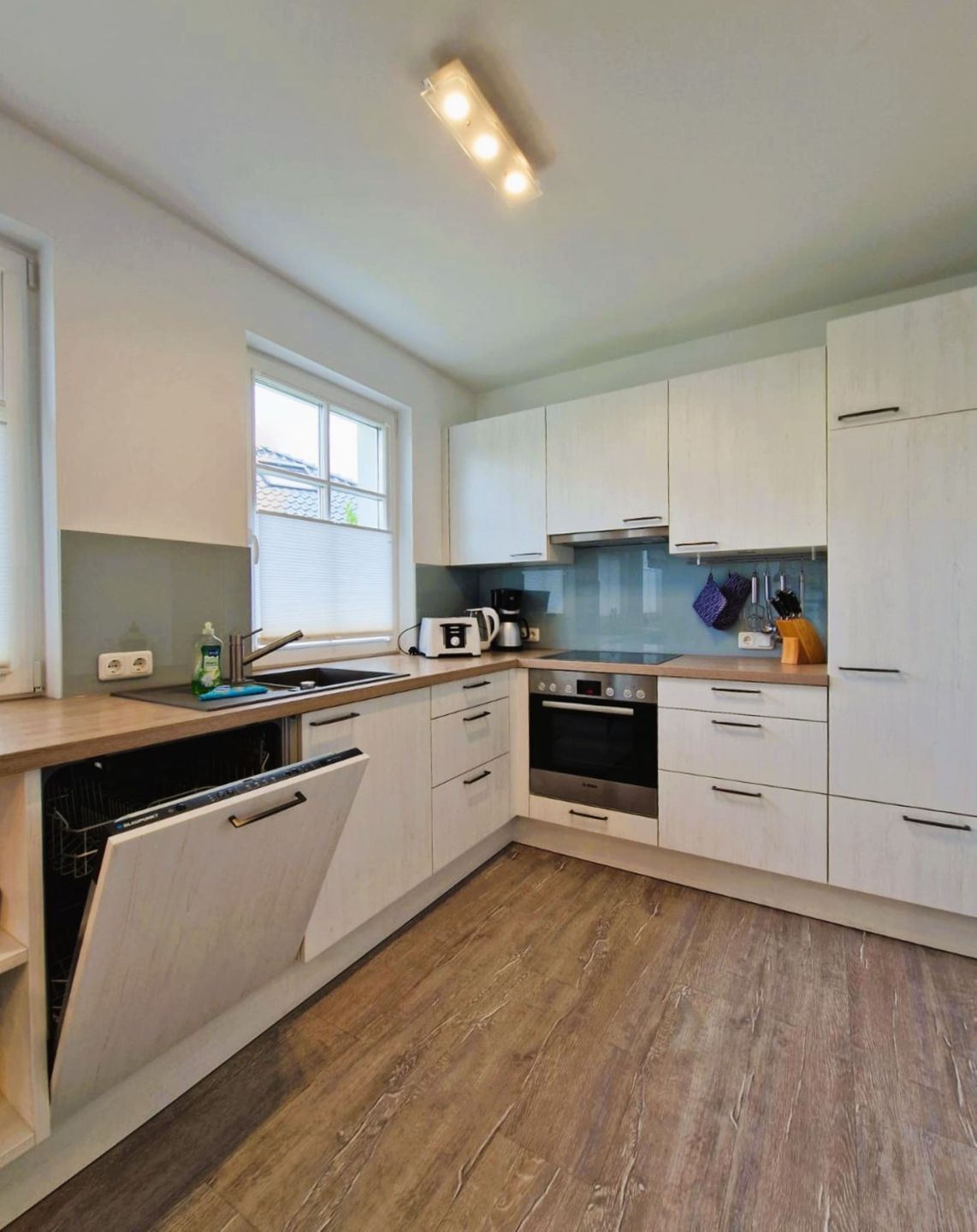 Ein großzügiger Wohnraum mit Wohn-/Essbereich ist hochwertig eingerichtet. LED-TV und mit kompl. Einbauküche (Geschirrspüler, Toaster, Wasserkocher usw.) großzügiger Essplatz