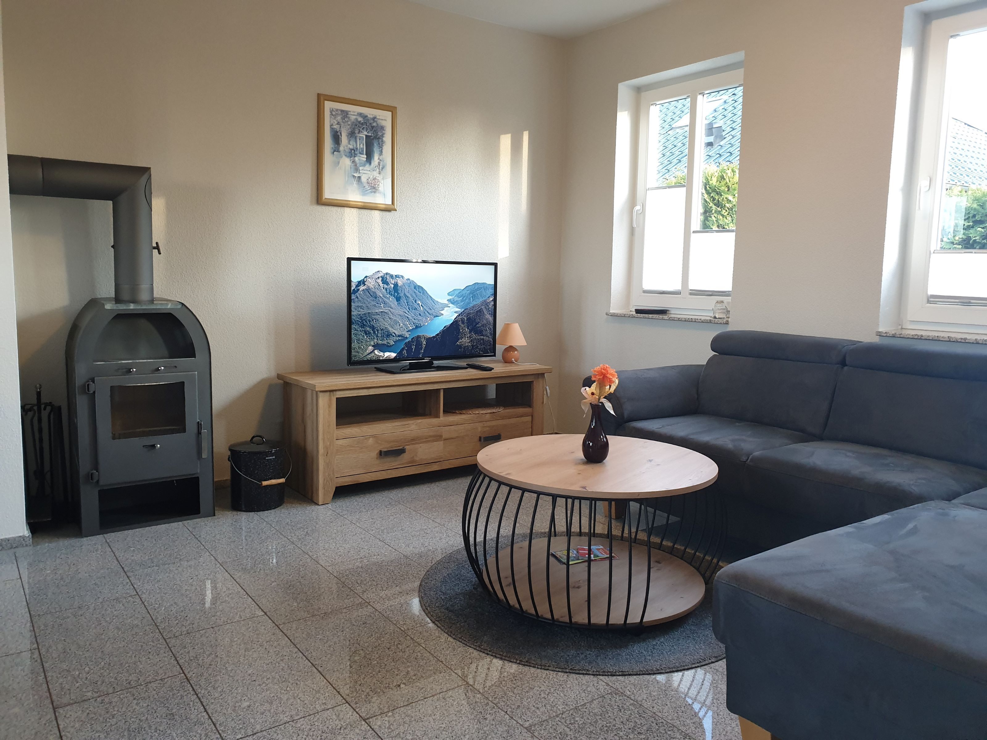 Gemütlicher Wohnbereich mit Kaminofen & Flachbild-TV,