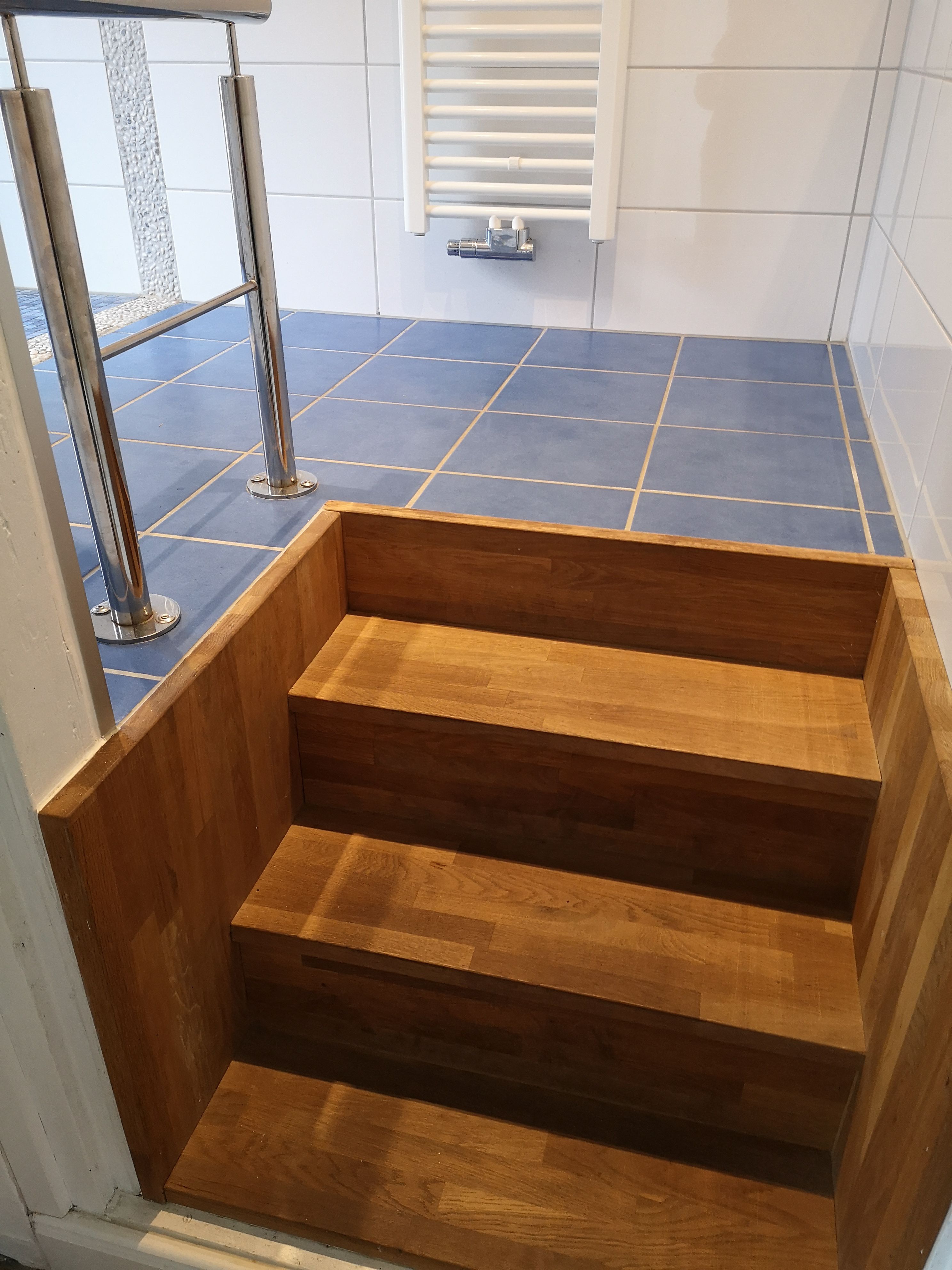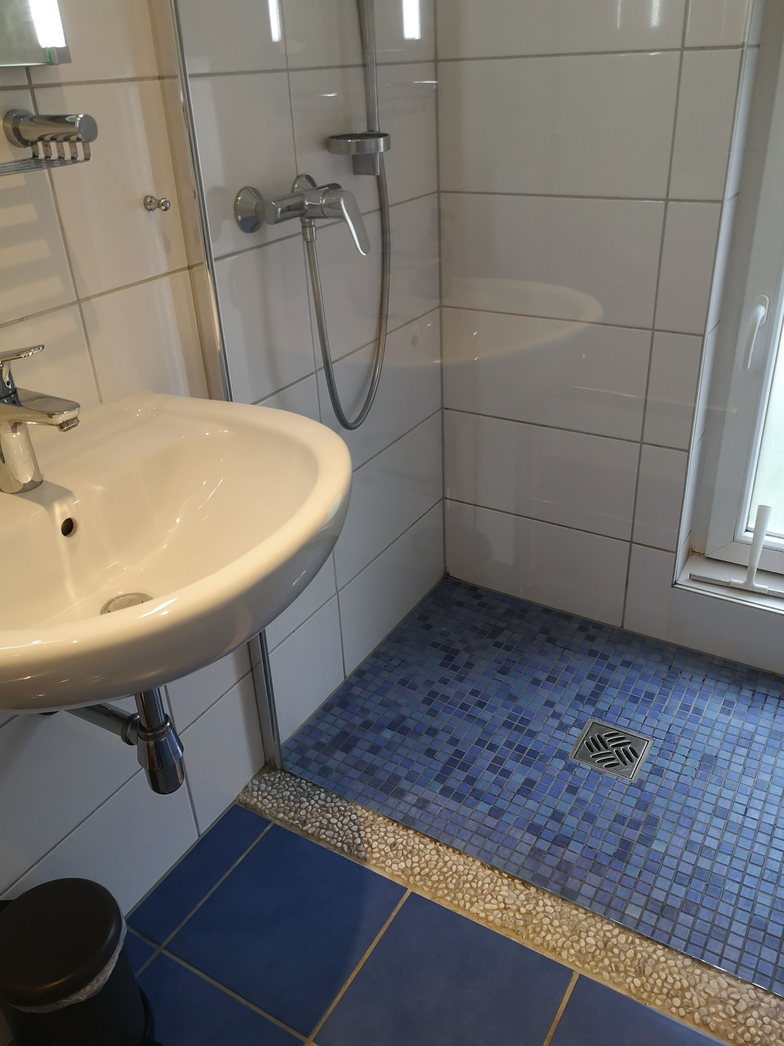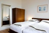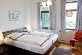 Auf der unteren Wohnebene befindet sich ein Schlafzimmer (Doppelbett) und im Dachgeschoss steht ein weiteres Doppelzimmer mit Aufenthaltsraum zur Verfügung. An das Doppelzimmer (Durchgangszimmer) grenzt ein weiteres kleines Schlafzimmer mit Einzelbett. Ein vorhandenes Kinderbett lässt sich flexibel aufstellen. Im hinteren Bereich der Wohnung bietet eine geräumige und umfangreich ausgestattete Küche die Möglichkeit, sich bei Bedarf selbst zu versorgen.