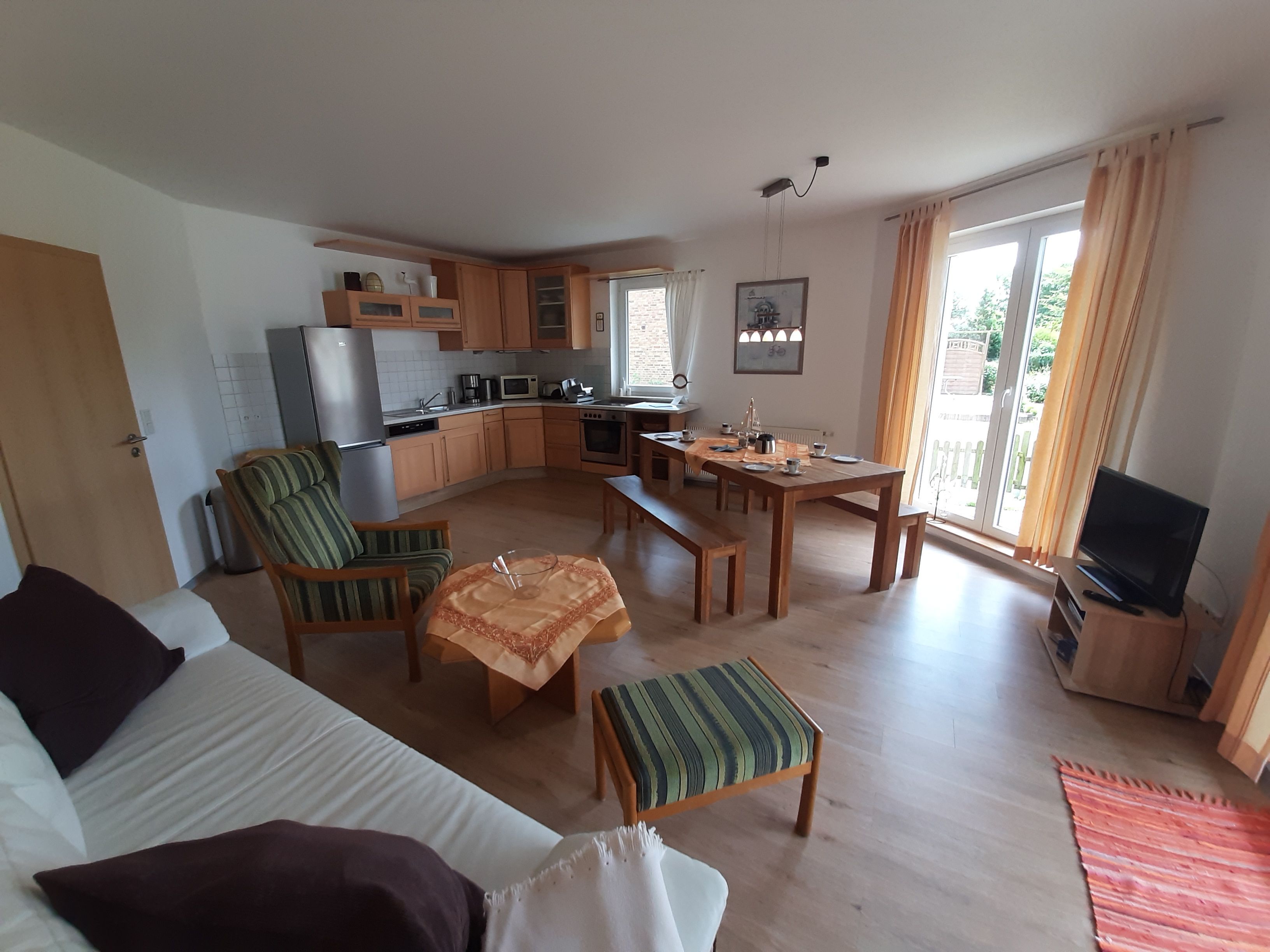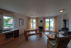 Gemütliche 4-Sterne Wohnung im Erdgeschoss mit 3 Schlafräumen (eines mit Doppelbett, das zweite mit zwei Einzelbetten, das dritte mit einem Einzelbett), großzügigem Bad und Wohnküche sowie Terrasse und Garten zur Belegung bis 5 Personen.