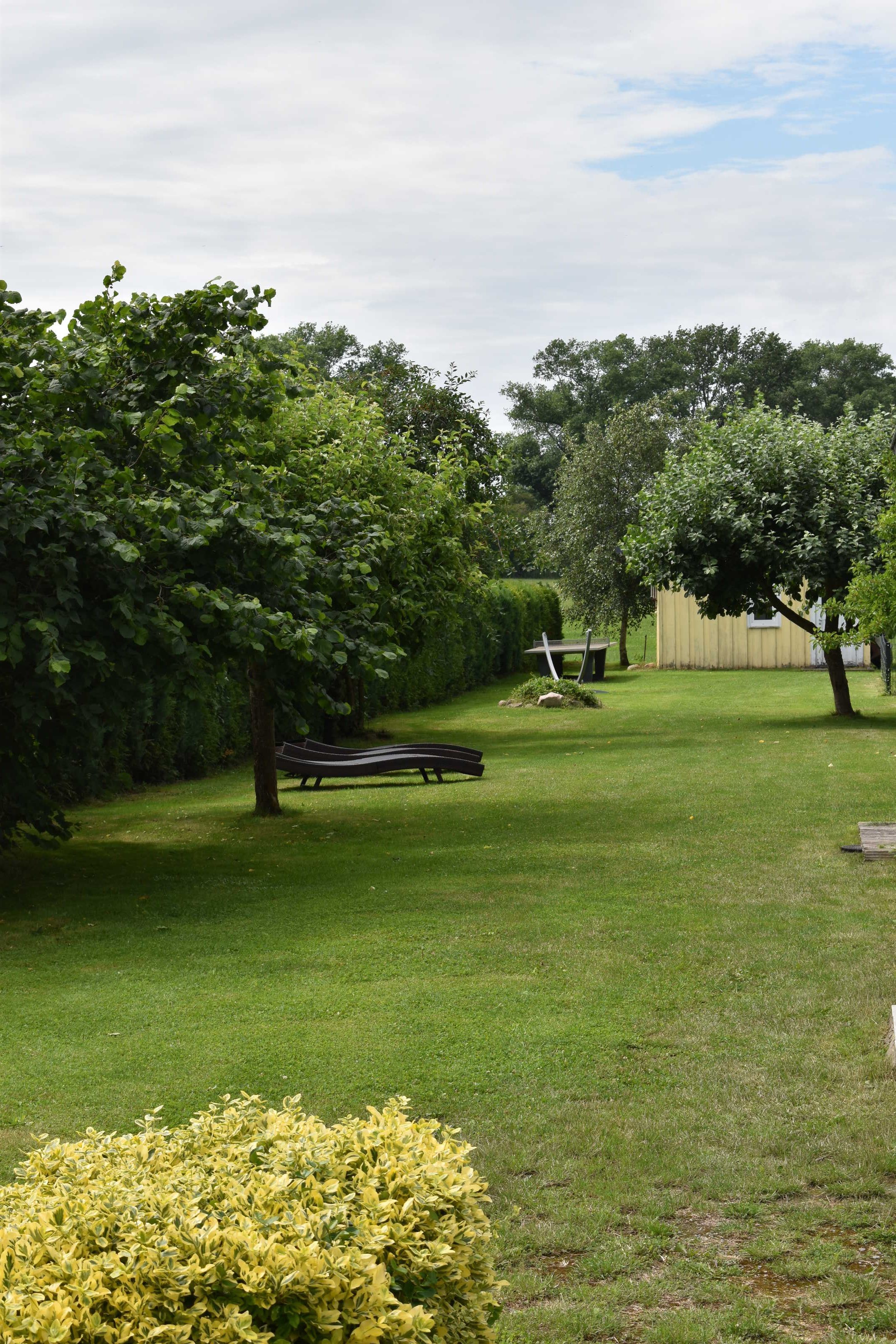Hier finden Sie unter Obstbäumen eine Tischtennisplatte, Grill und Hängematte.