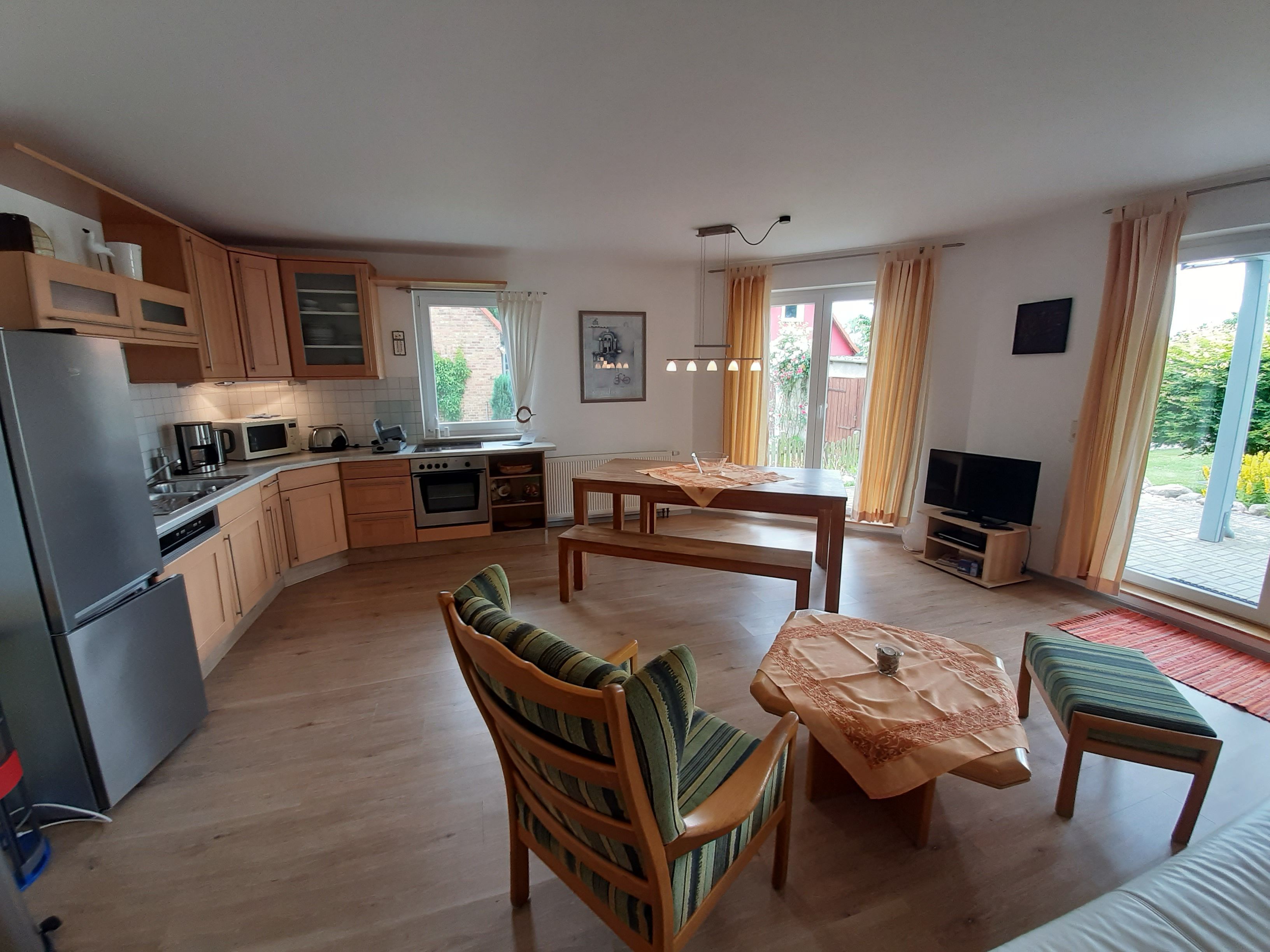 Für Ihren angenehmen Aufenthalt in unserem Haus bieten wir Ihnen ein umfangreiches Sortiment an Zubehör und Ausstattung. Die Küche ist mit Geschirrspüler, Kühl-Gefrier-Kombination, 4-fach Cerankochfeld, Backofen, Mikrowelle, Kaffeemaschine, Toaster, Wasserkocher, Geschirr/Besteck/Kochutensilien ausgestattet. Ein großer Esstisch rundet das Angebot ab. Bei Bedarf können Kinderstühlchen für die Kleinen bis 3 Jahre zur Verfügung gestellt werden.