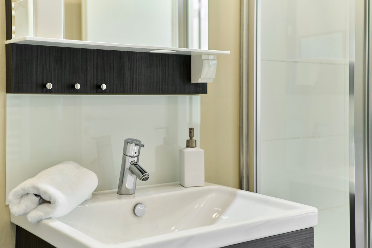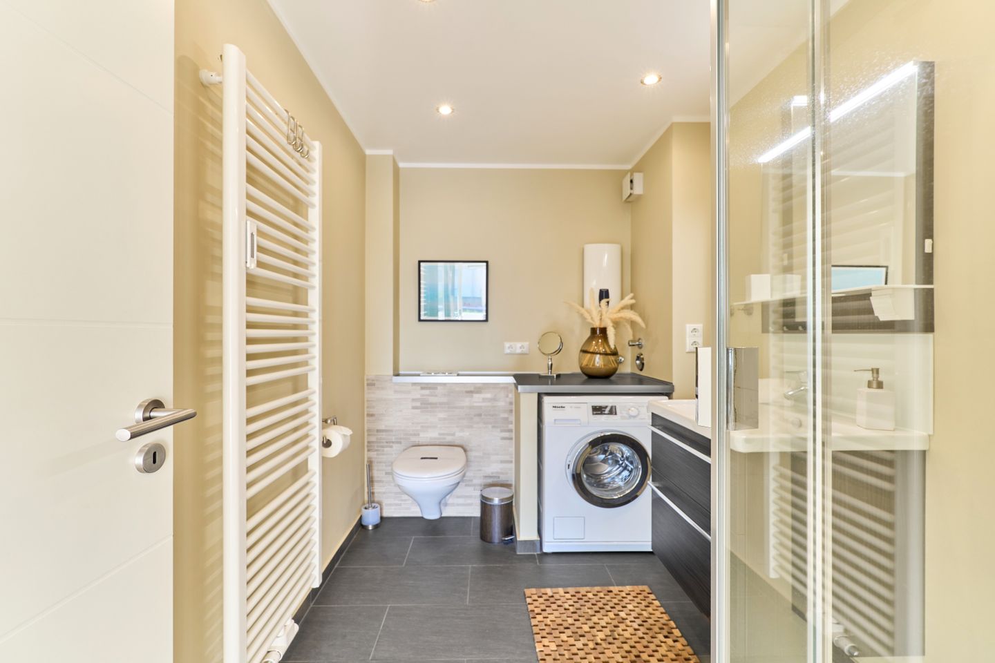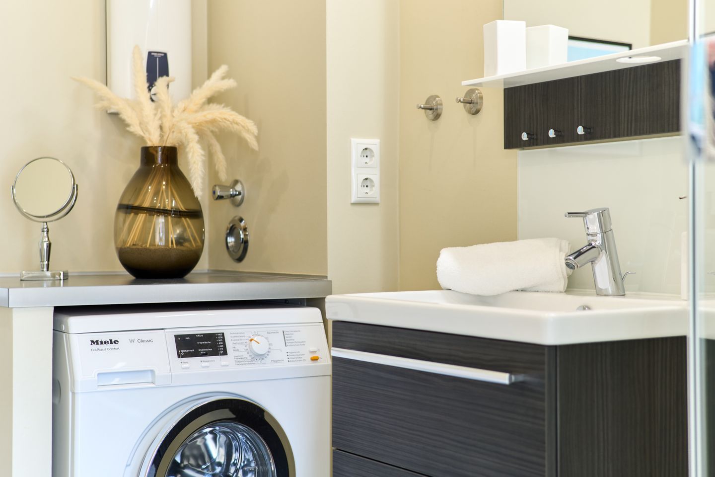 Das elegante Badezimmer ist modern gestaltet und mit einer großzügigen, bodentiefen Dusche ausgestattet, die Ihnen höchsten Komfort bietet. Eine Waschmaschine steht Ihnen ebenfalls zur Verfügung, was besonders für längere Aufenthalte praktisch ist.