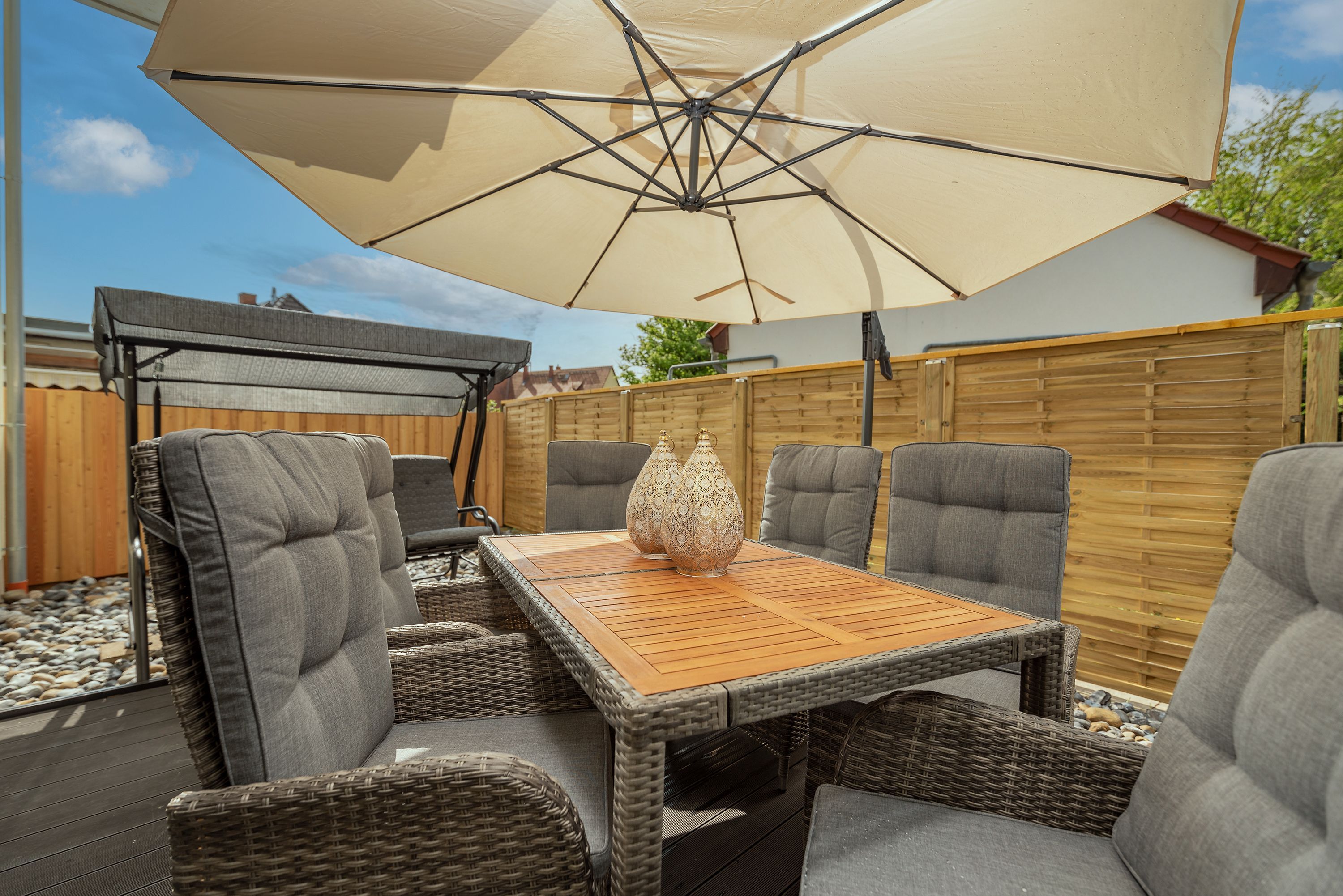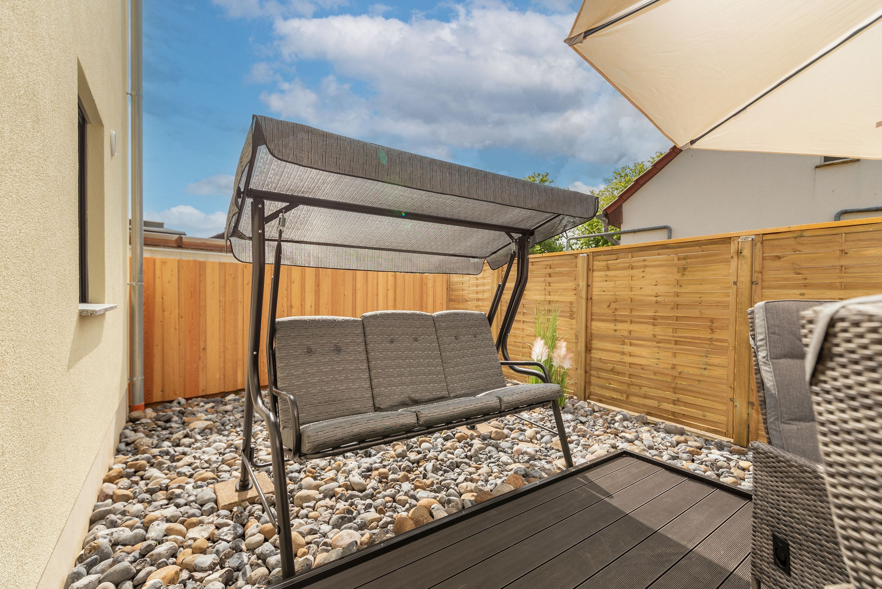 • Eine Sonnenterrasse mit Gartenmöbeln und einer Hollywoodschaukel.