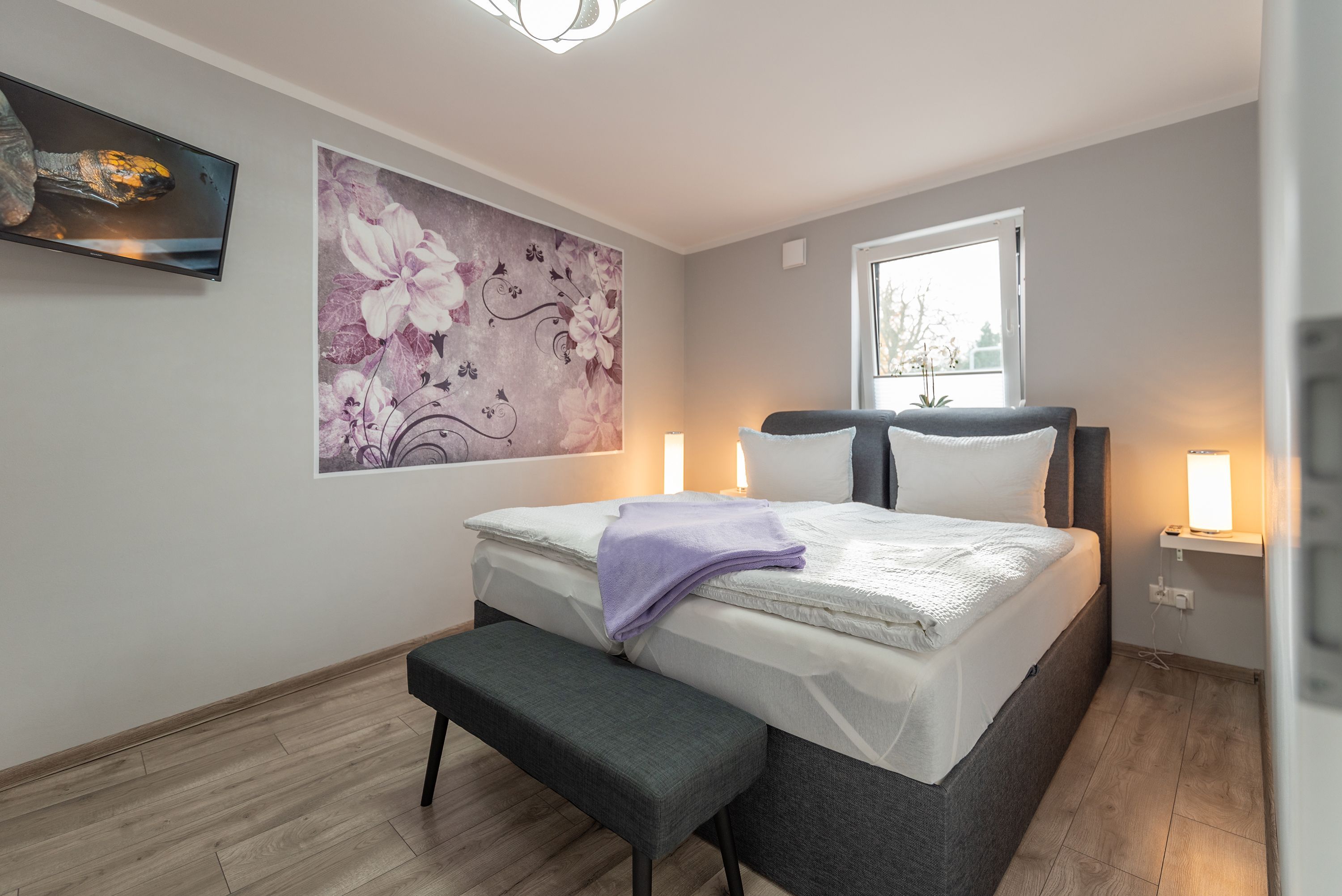 • Ein Schlafzimmer mit einem komfortablen Boxspringbett,