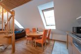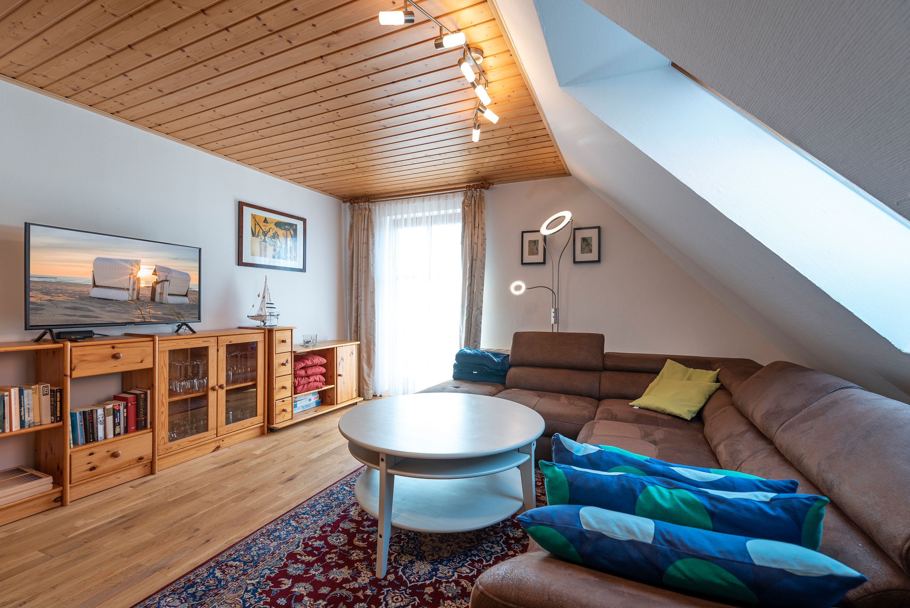 Die Ferienwohnung Ackerweg 1 im ersten Obergeschoss, ideal für bis zu 4 Personen, ist hell, freundlich und mit einem gemütlichen Ambiente eingerichtet. Sie verfügt über einen kleinen Flur, ein Badezimmer, ein Schlafzimmer sowie einen offenen Schlafboden, der vom Wohnzimmer aus über eine Treppe erreichbar ist. Der Wohnbereich beinhaltet eine praktische Küchenzeile und einen Flat-TV, wobei sowohl das Schlafzimmer als auch das Wohnzimmer direkten Zugang zum großzügigen Balkon bieten. Dieser lädt zu entspannten Momenten unter freiem Himmel ein und erweitert den Wohnraum um eine attraktive Außenfläche.