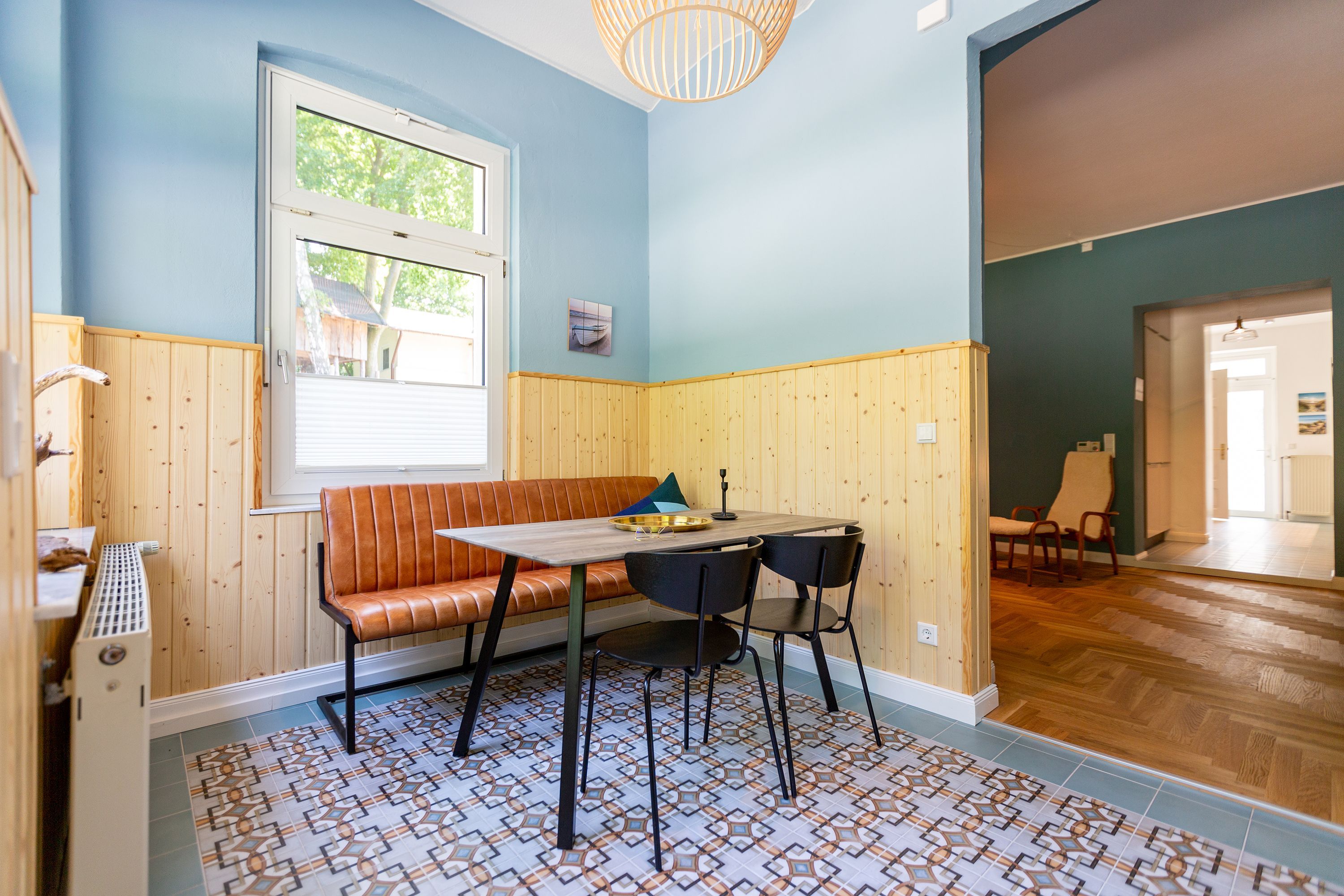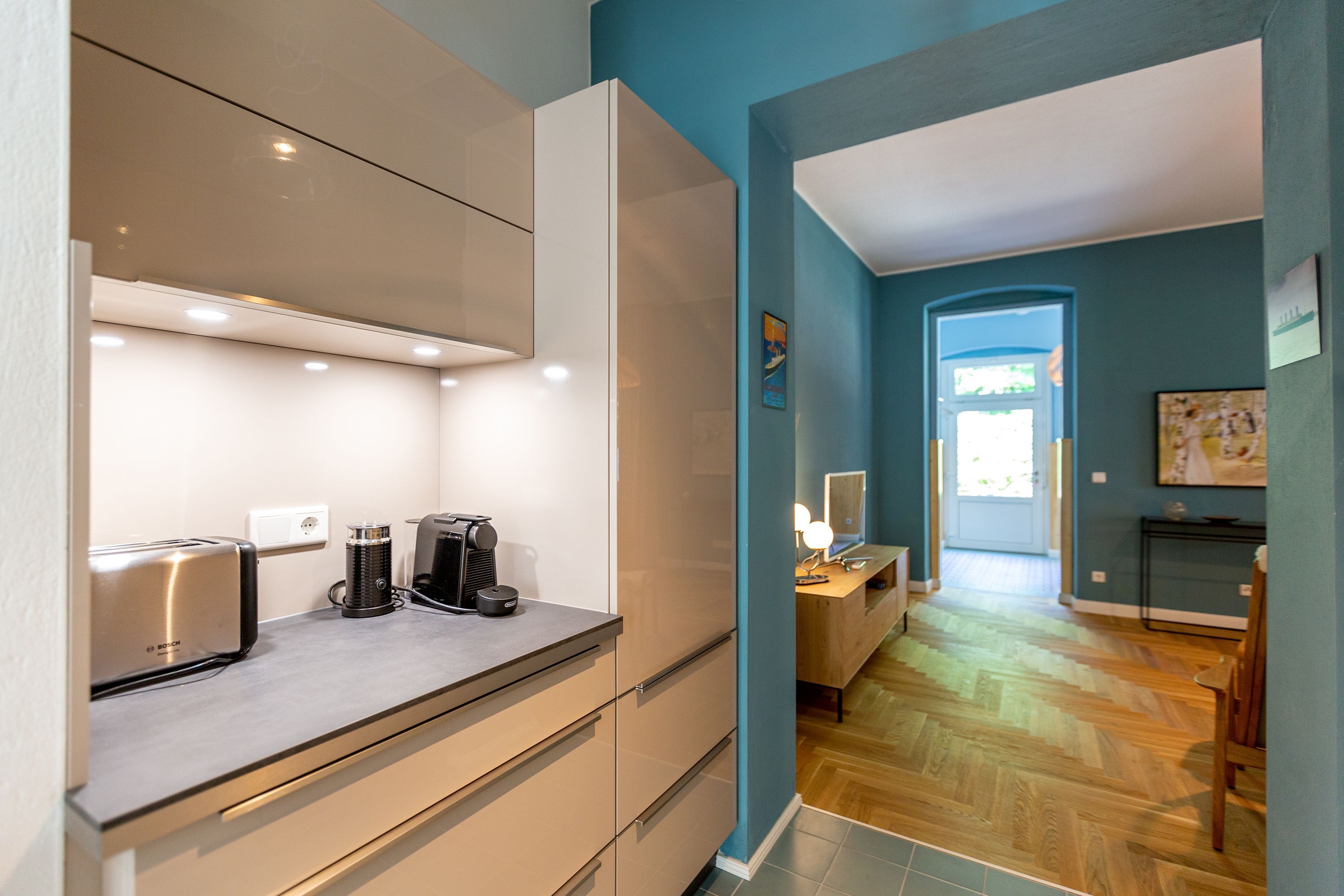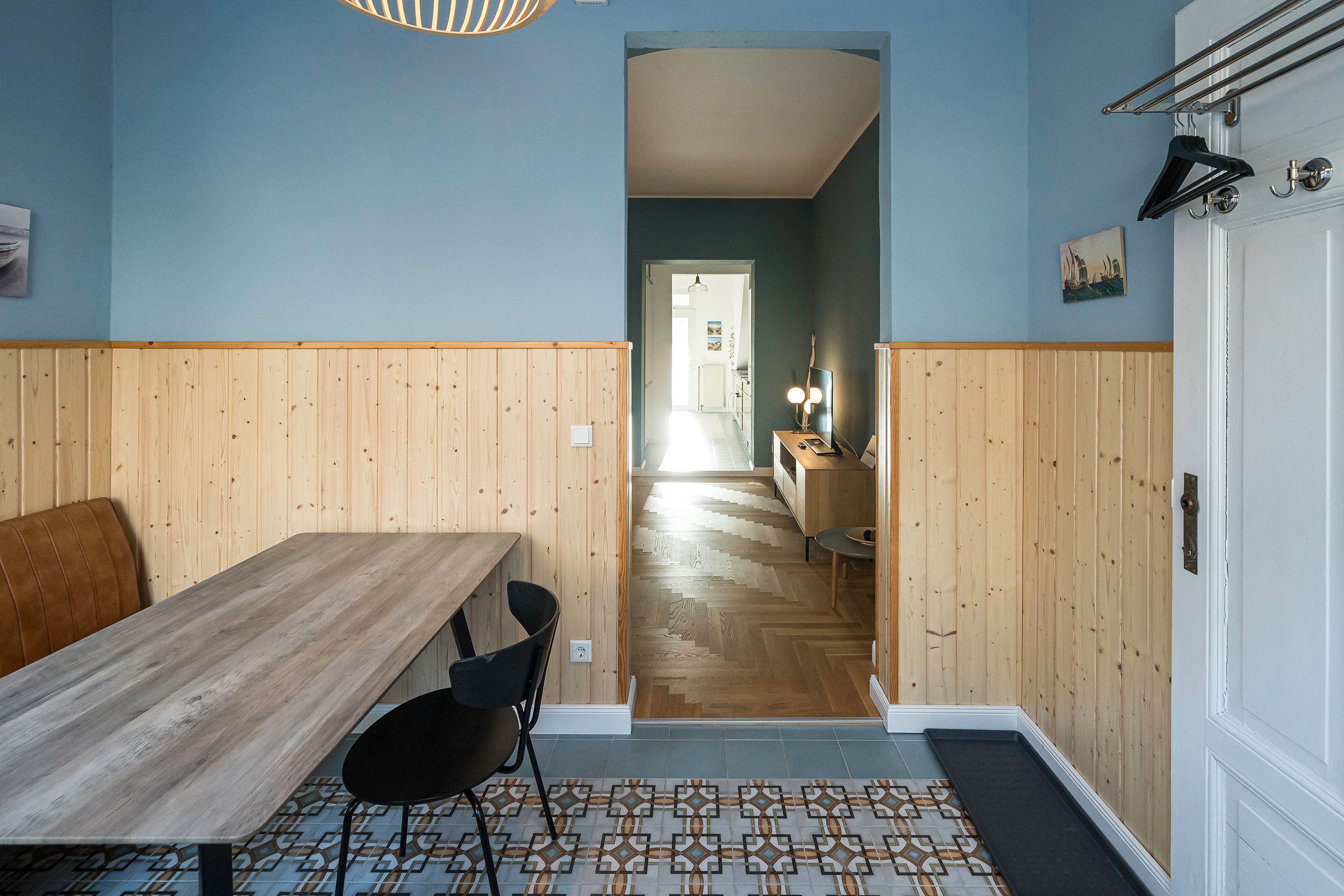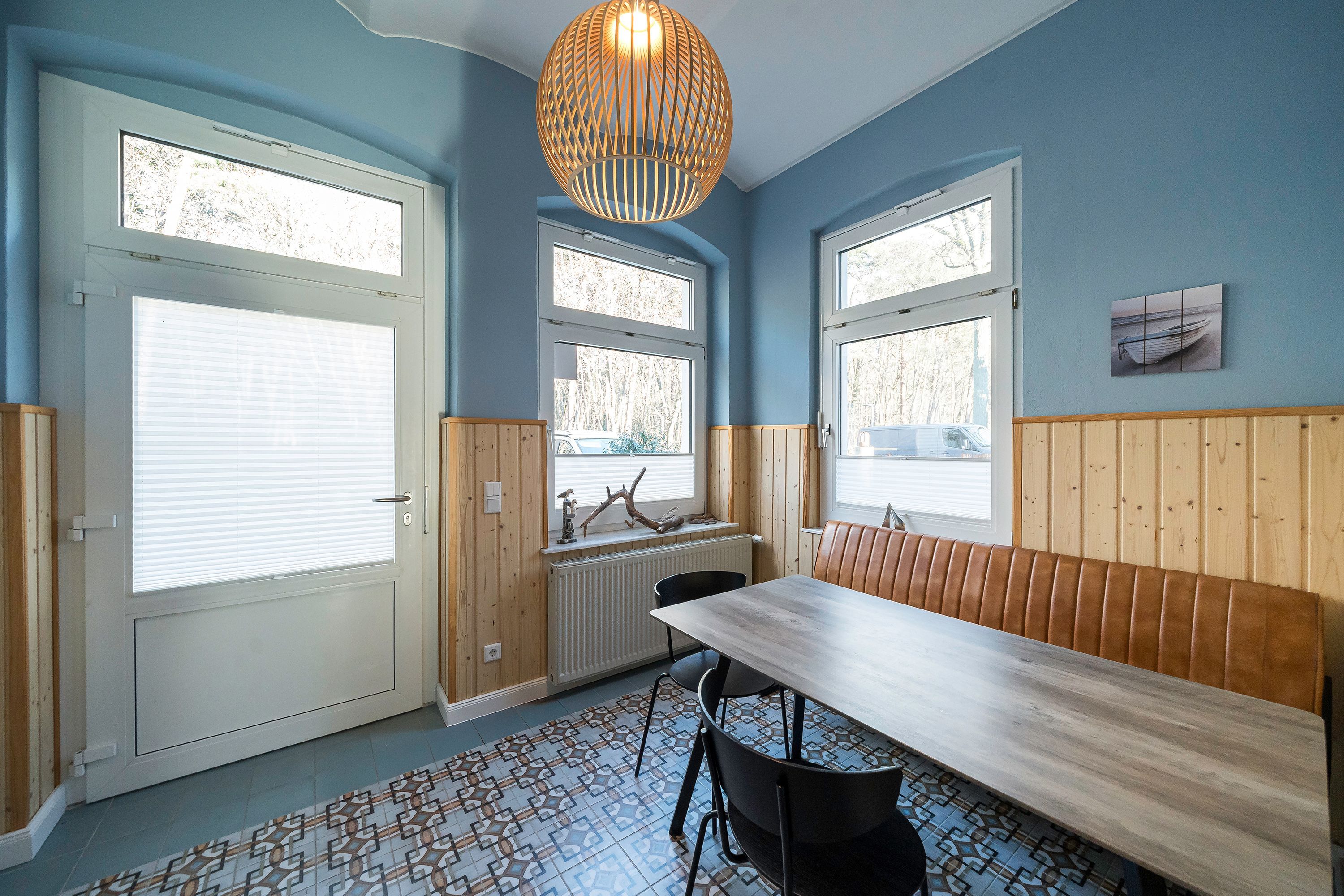Die Ferienwohnung 2 im Erdgeschoss besticht durch ihre liebevolle Ausstattung und das durchdachte Raumkonzept. Sie umfasst einen offenen Wohnbereich mit einer komfortablen Schlafcouch, die als zusätzliche Schlafmöglichkeit dient, sowie einen Flat-TV. Die angrenzende Küchenzeile ist mit allem ausgestattet, was das Herz begehrt, von der Nesspressomaschine bis zum Backofen. Ein separater Essbereich in der Veranda bietet den perfekten Rahmen für gemeinsame Mahlzeiten oder unterhaltsame Spieleabende. Das Schlafzimmer lädt mit einem luxuriösen Boxspringdoppelbett (1,80m x 2,00m) zum Entspannen ein, während das stilvolle Badezimmer mit einer ebenerdigen Dusche, einem Waschbecken und WC ausgestattet ist. Zur Wohnung gehört zudem eine kleine, nach Norden ausgerichtete Terrasse mit Gartenmöbeln, ideal, um die frische Ostseeluft zu genießen.
