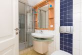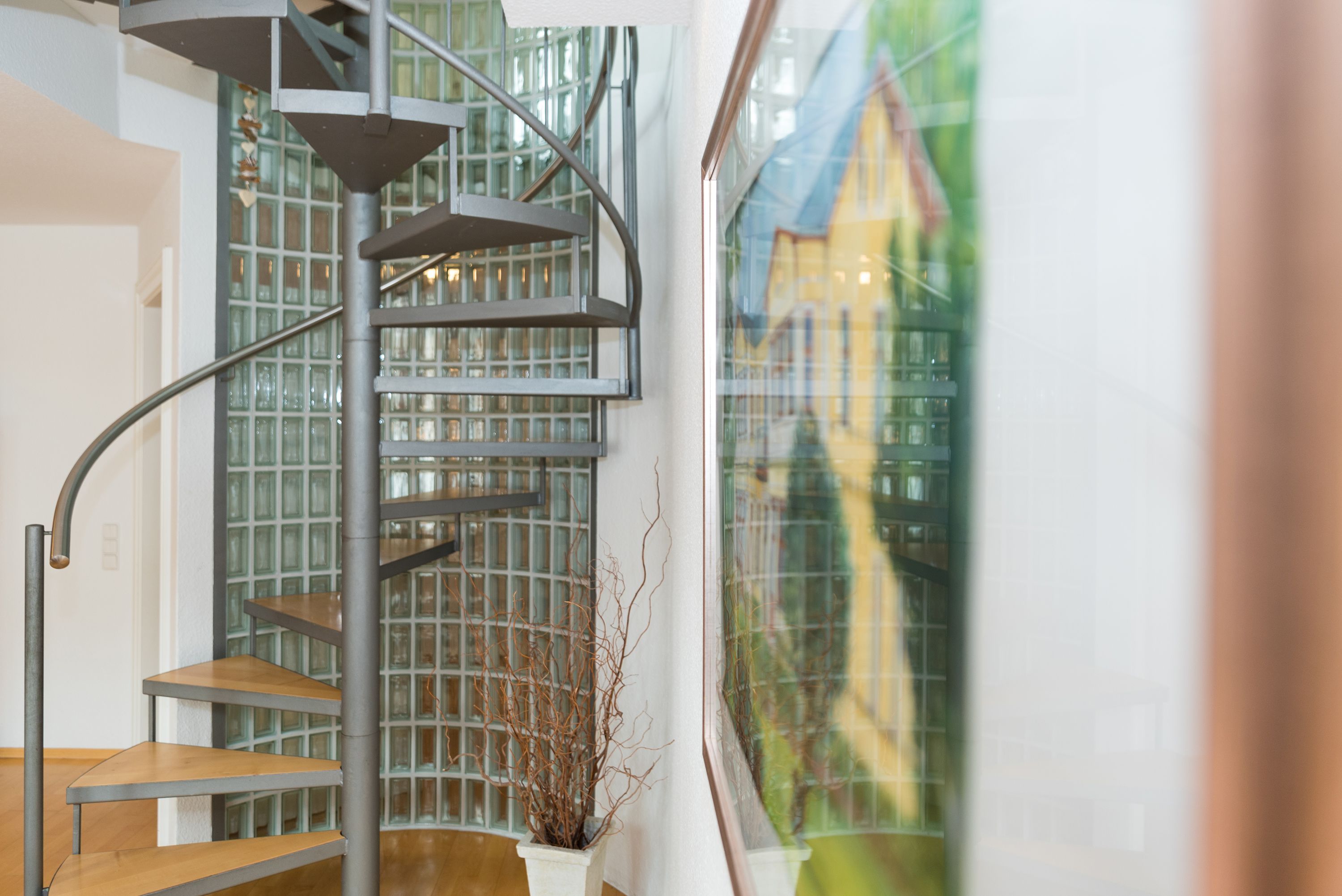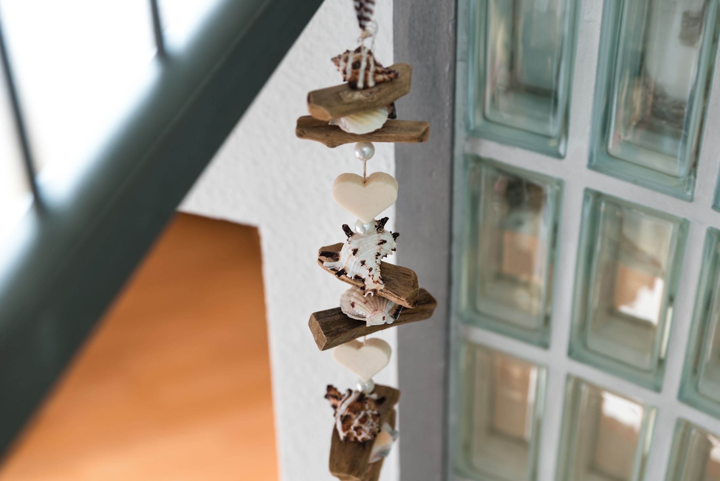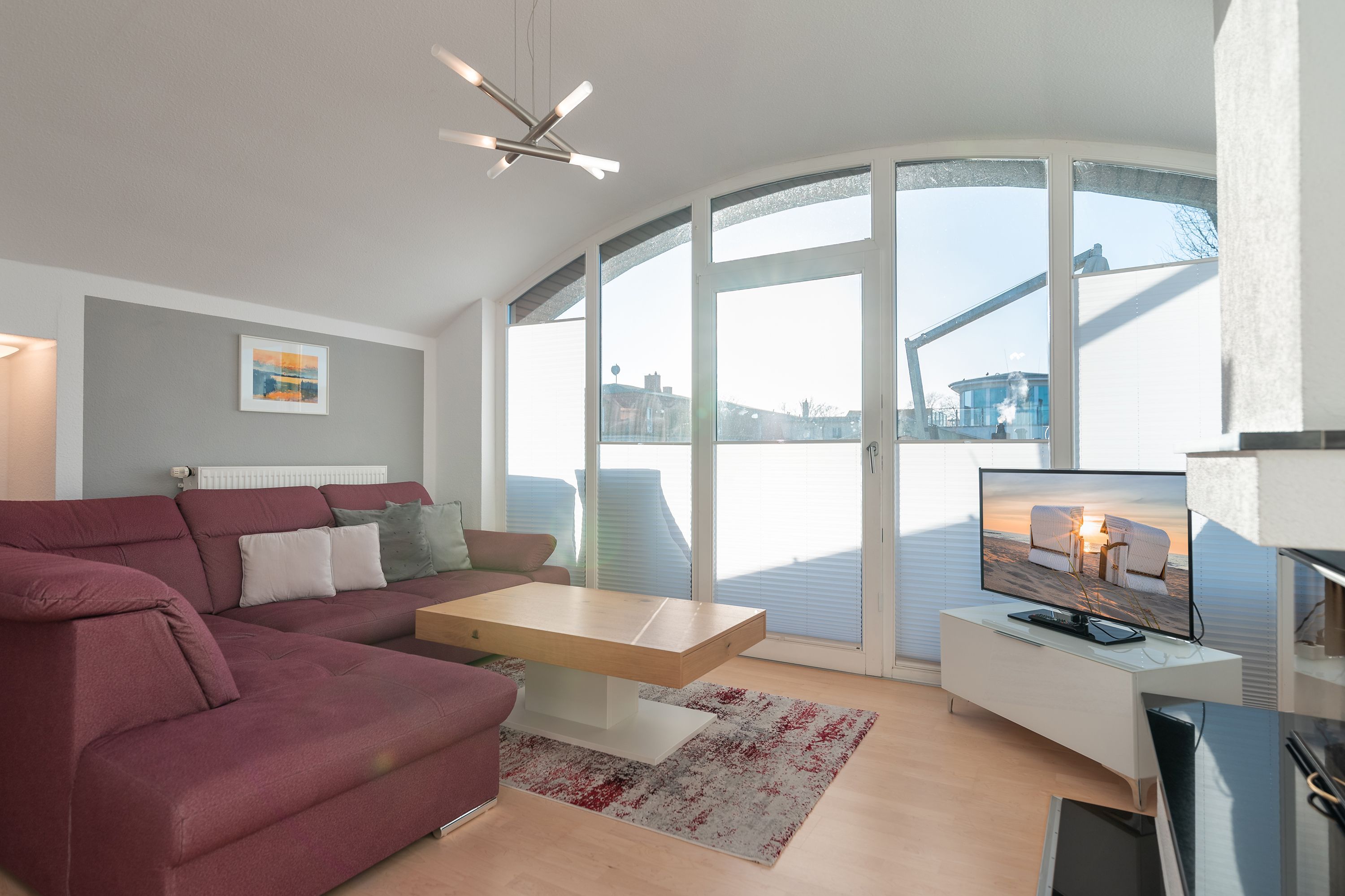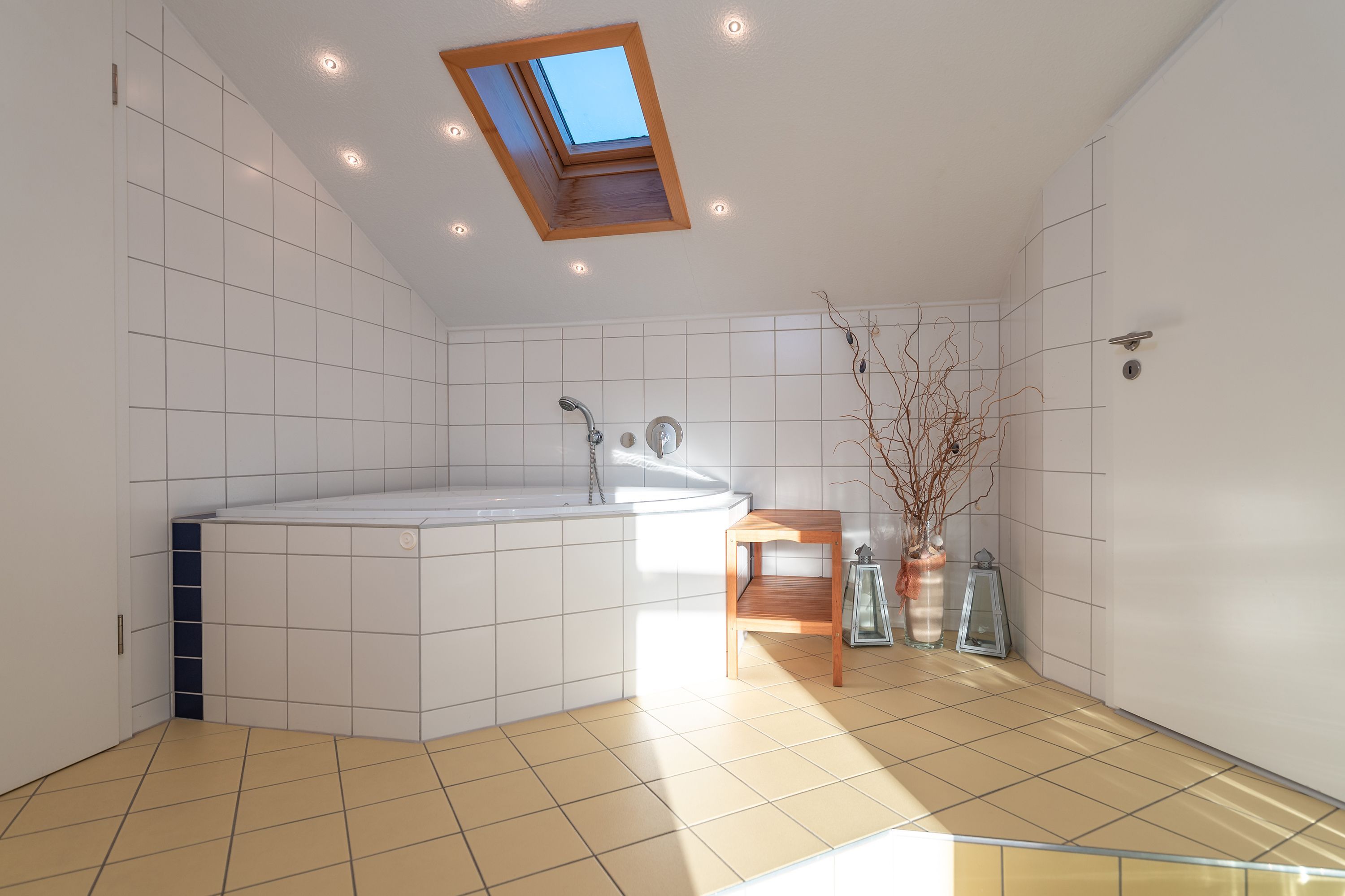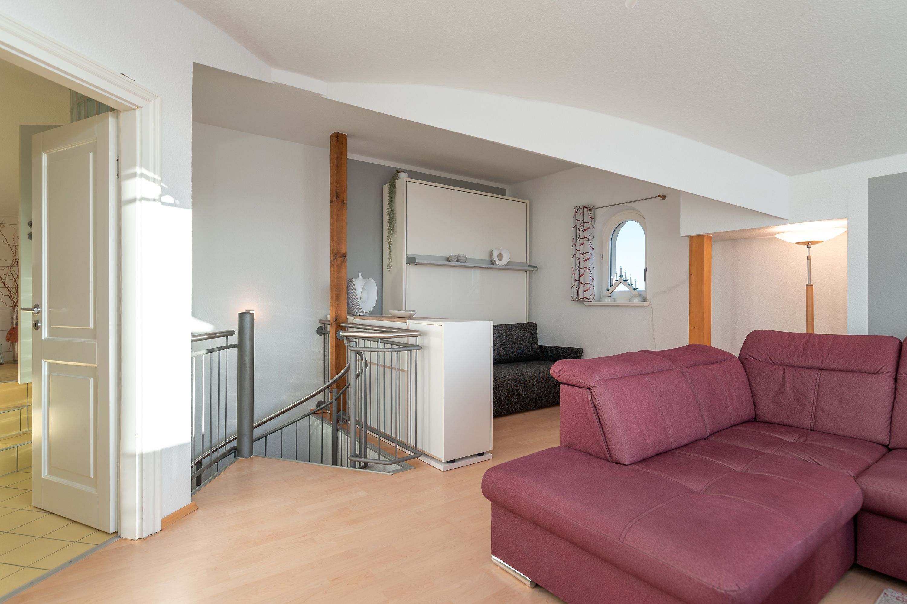 Eine Wendeltreppe führt Sie ins Dachgeschoss, wo sich das Wohnzimmer mit einem einladenden Kamin und einer gemütlichen Couchecke mit Flat-TV befindet. Genießen Sie entspannte Stunden auf der sonnigen, möblierten Terrasse, die den perfekten Rahmen für unvergessliche Urlaubsmomente bietet und von wo aus Sie ebenfalls den seitlichen Meerblick bewundern können. Das zweite Badezimmer im Dachgeschoss verfügt über eine Dusche, einen Waschtisch/WC und eine einladende Badewanne. Das angrenzende, zweite Schlafzimmer mit Doppelbett unter der charakteristischen Dachschräge verspricht ruhige Nächte.