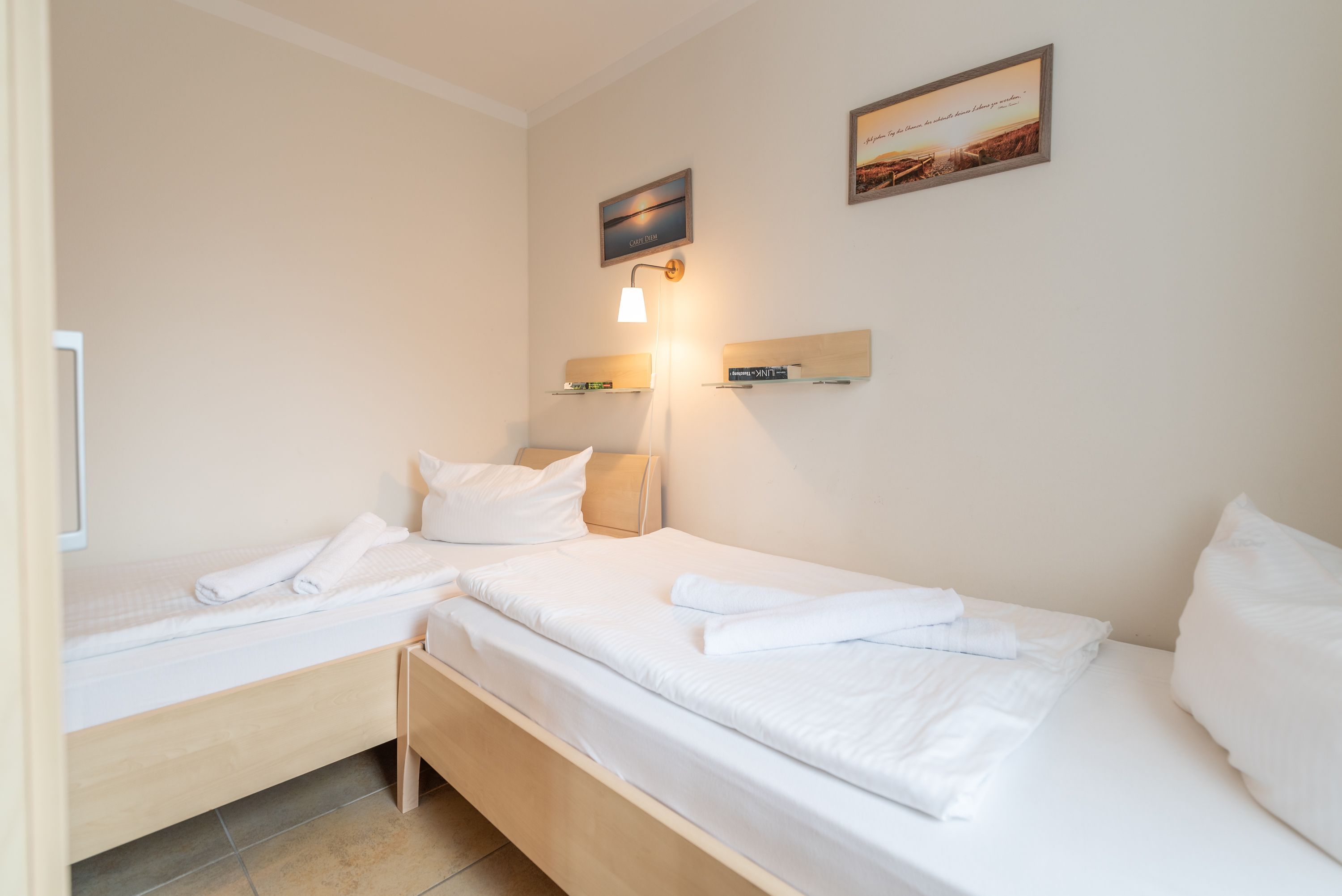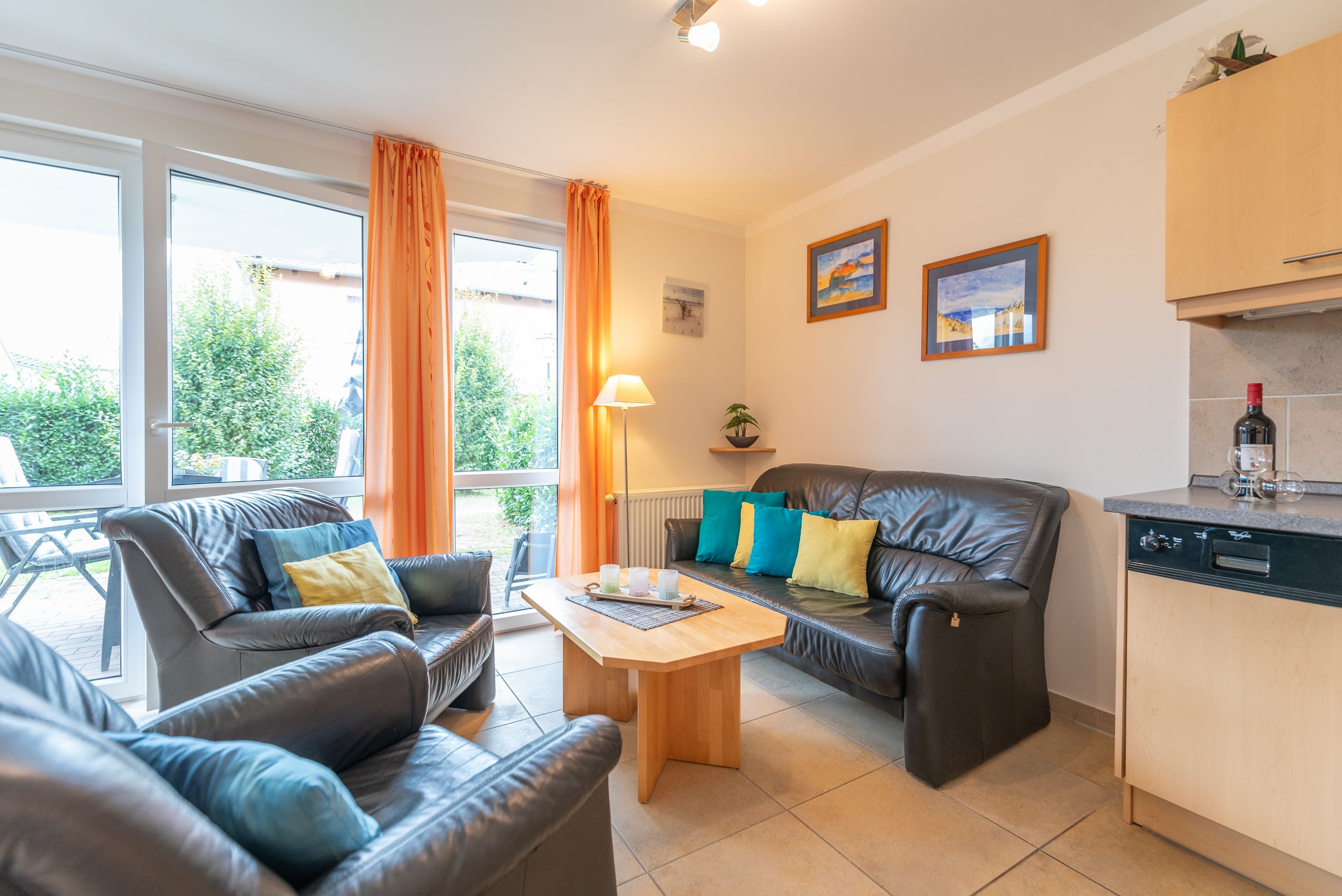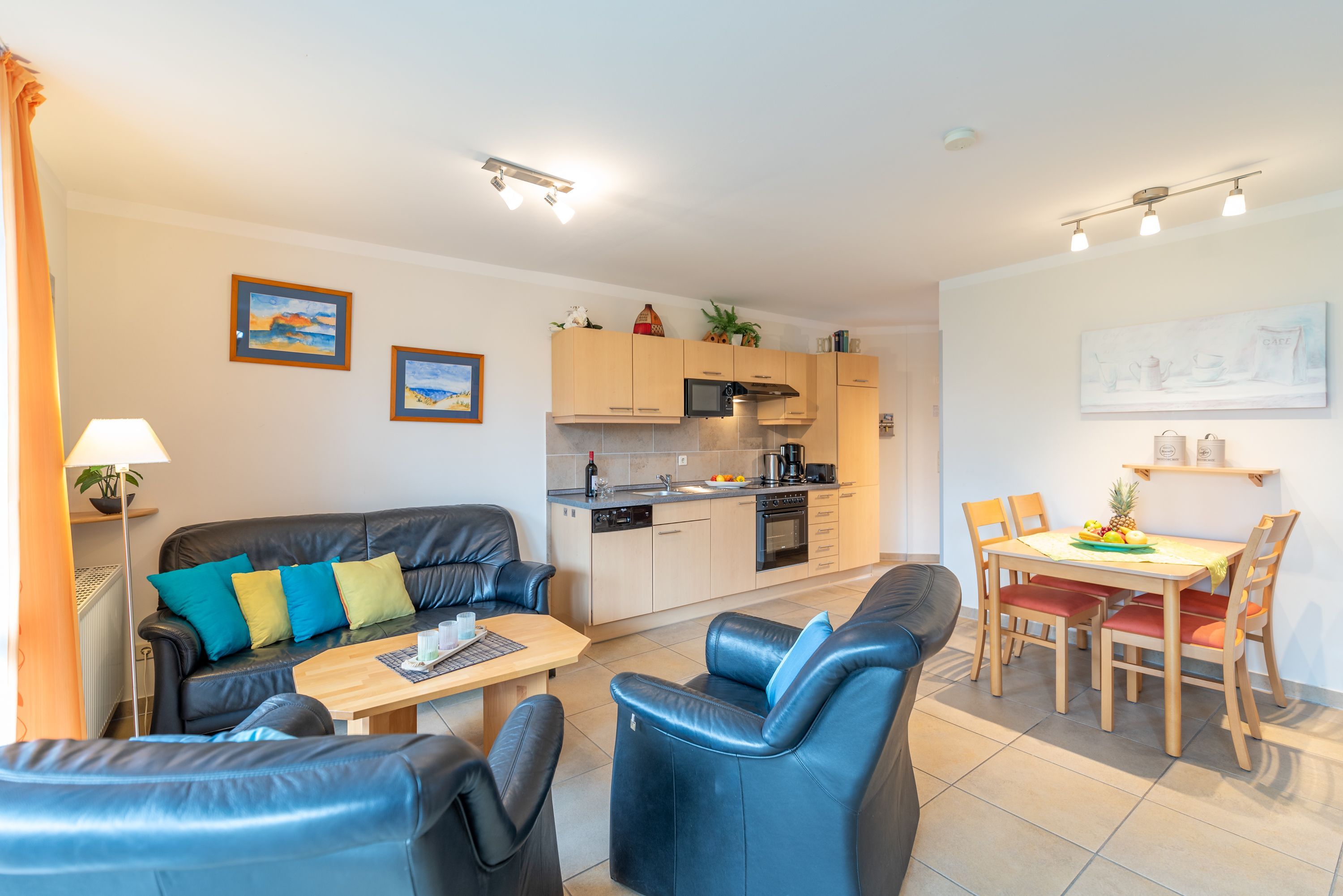 Die Wohnung verfügt über ein Schlafzimmer mit einem gemütlichen Doppelbett und ein weiteres Schlafzimmer mit zwei getrennt stehenden Betten. Das moderne Wohnzimmer ist mit einer bequemen Ledersitzgarnitur, einem Esstisch mit vier Stühlen sowie einem SAT-TV (Flachbildschirm FullHD/LED-TV) und einem CD-Radio ausgestattet. Eine vollausgestattete Küchenzeile ist ebenfalls integriert und bietet alles, was Sie für die Zubereitung Ihrer Mahlzeiten benötigen. Ein kostenloser WLAN-Internet-Hotspot steht allen Gästen zur Verfügung.