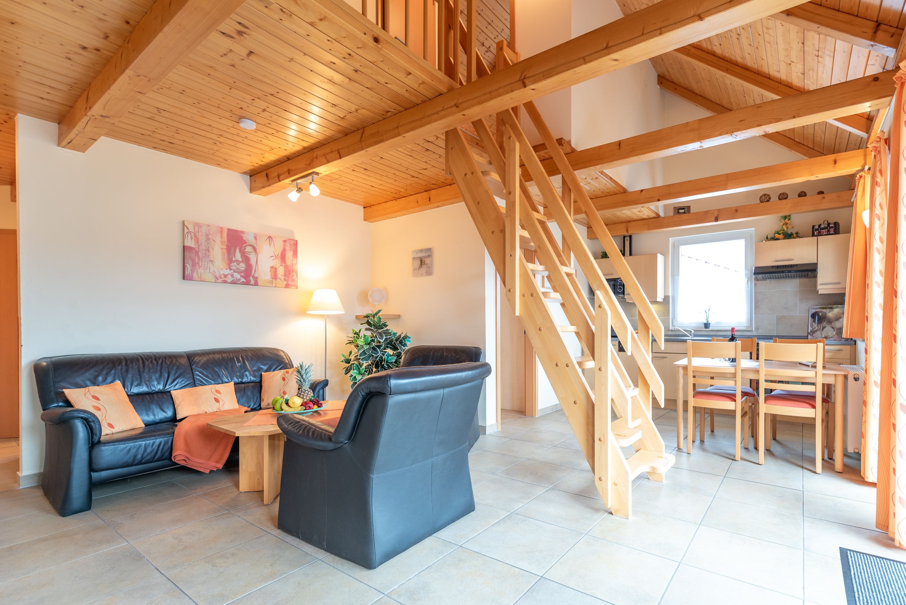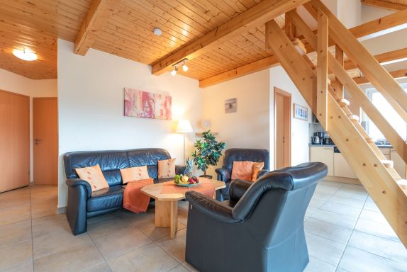 Das Wohnzimmer ist mit einer bequemen Ledercouch, einem Esstisch mit fünf Stühlen sowie einem SAT-TV (Flachbildschirm FullHD/LED-TV) und einem CD-Radio ausgestattet. Eine vollausgestattete Küchenzeile ist ebenfalls integriert und bietet alles, was Sie für die Zubereitung Ihrer Mahlzeiten benötigen. Ein kostenloser WLAN-Internet-Hotspot steht allen Gästen zur Verfügung.