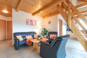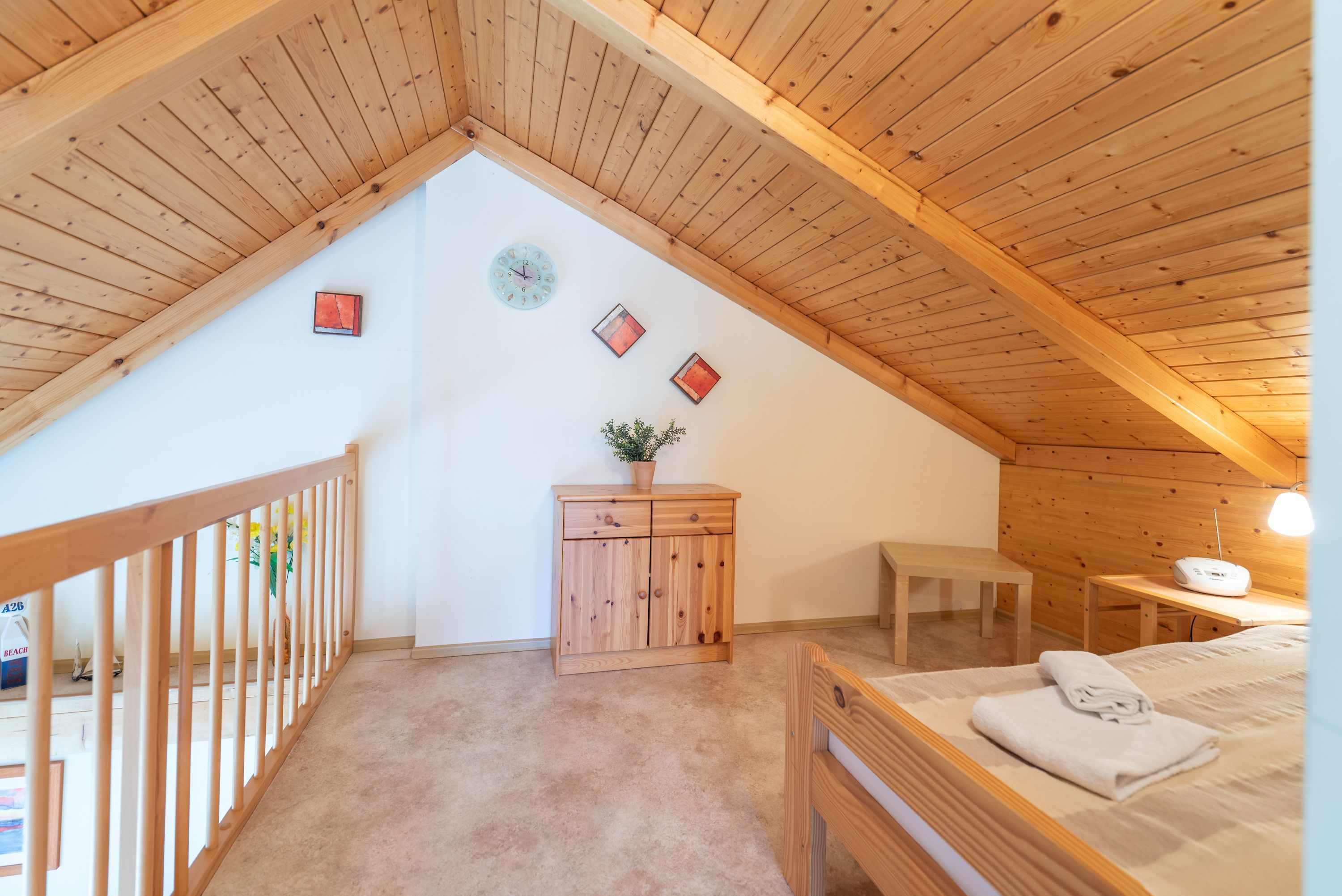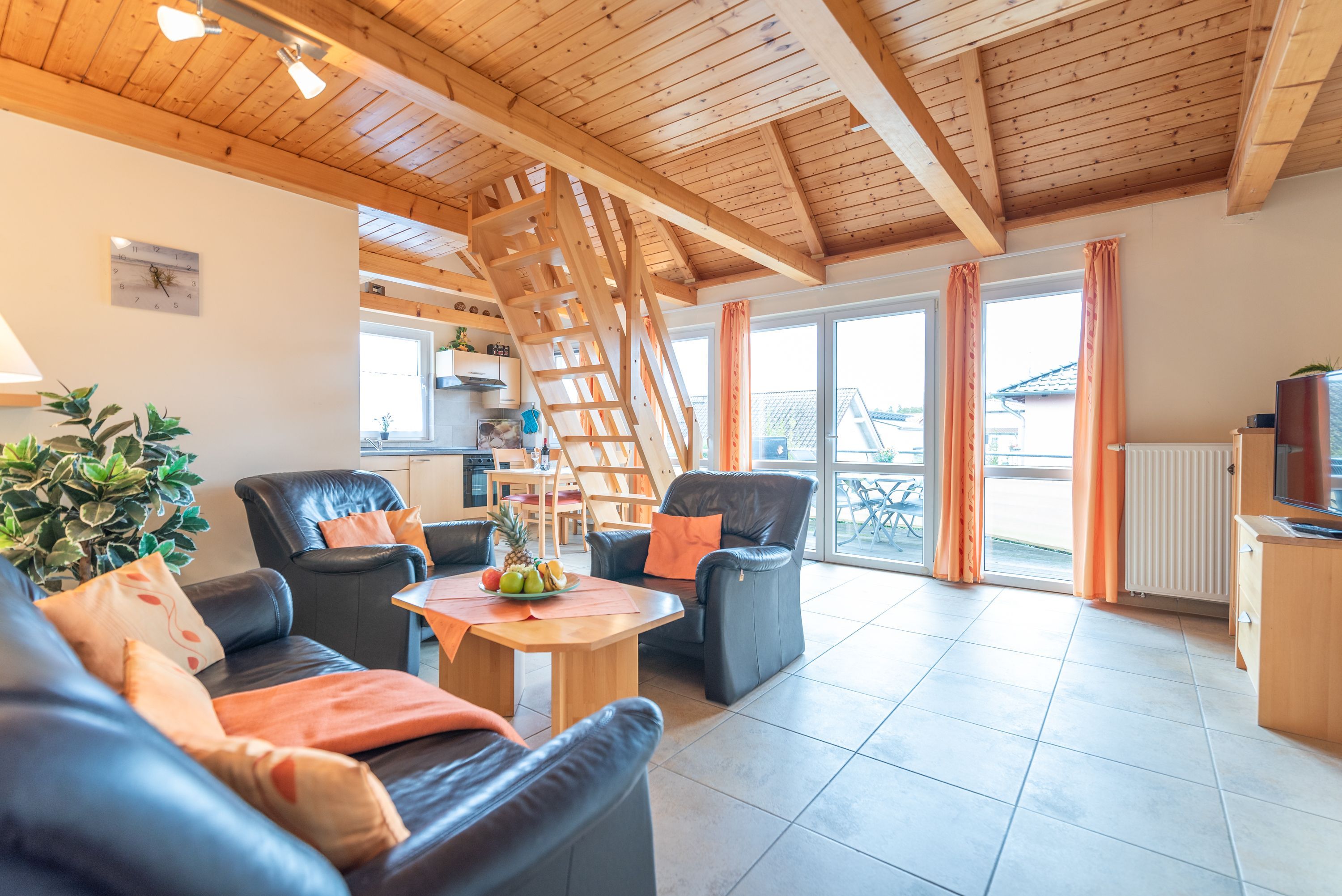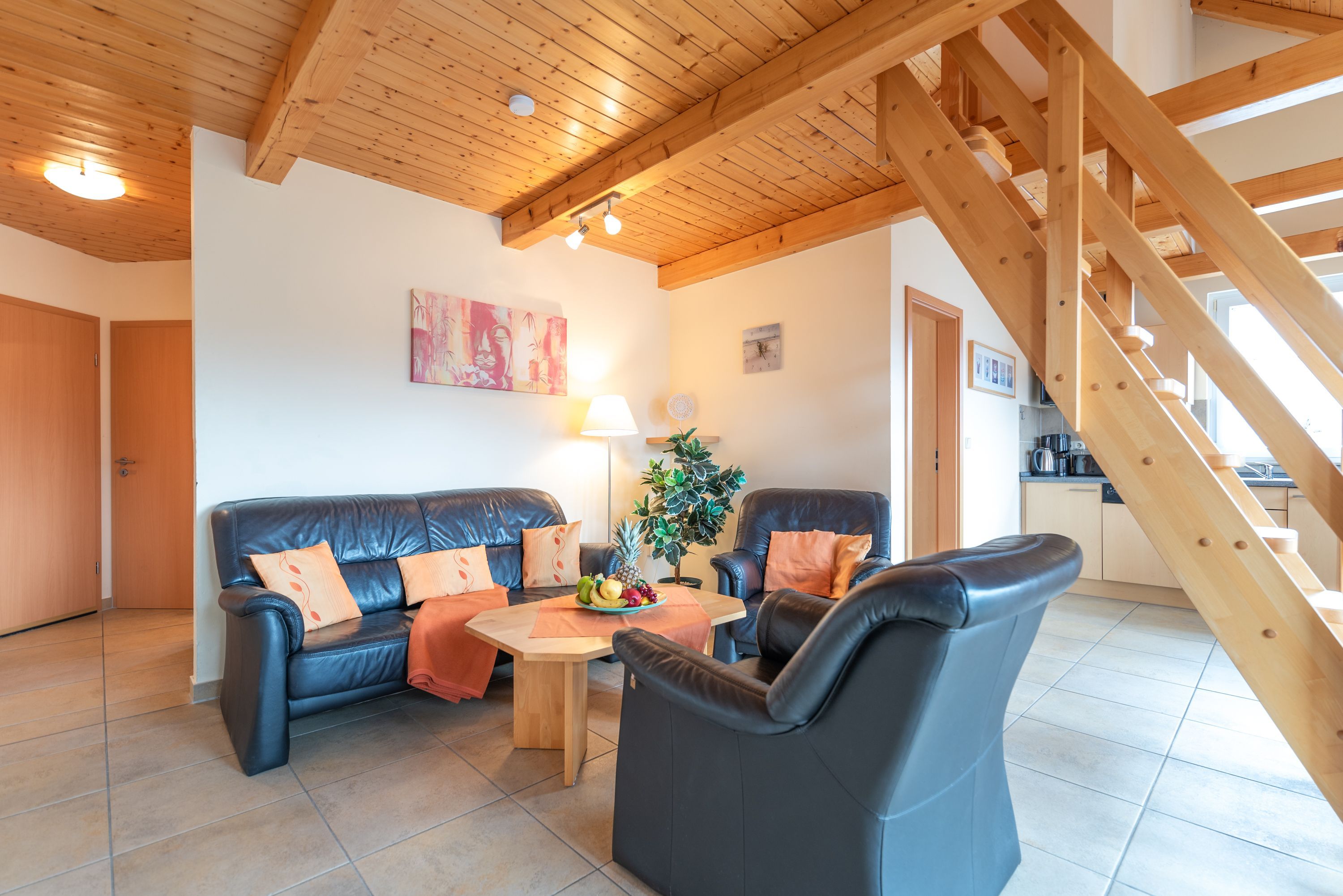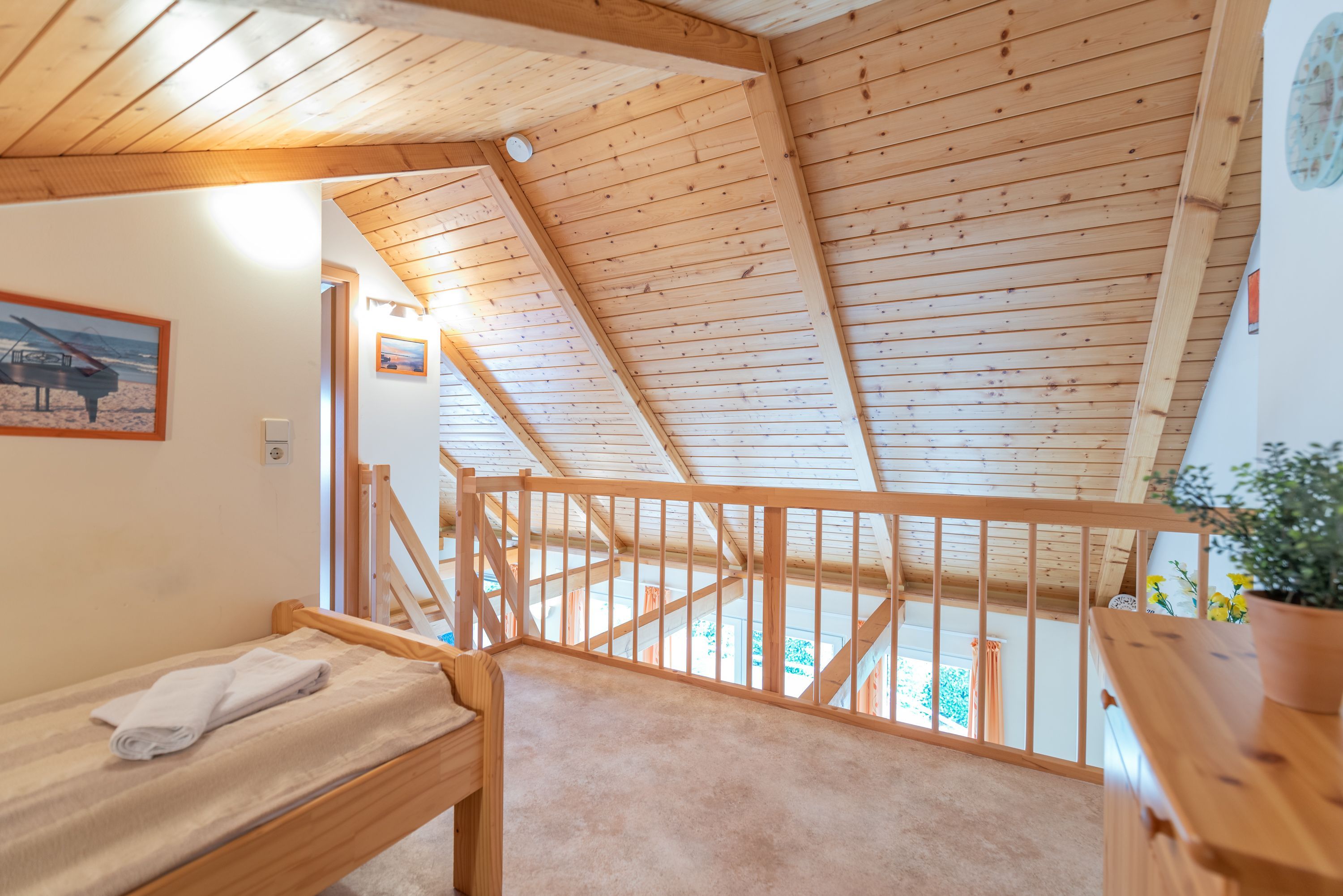 Das 3.Einzelbett steht auf dem großzügigen Dachraum (offen) neben dem 2.Schlafzimmer. Die Wohnung umfasst zudem ein modernes Bad (Duschwanne) und ein Gäste-WC, sowie ein gemütliches Wohnzimmer, das viel Platz zum Entspannen und Beisammensein bieten.