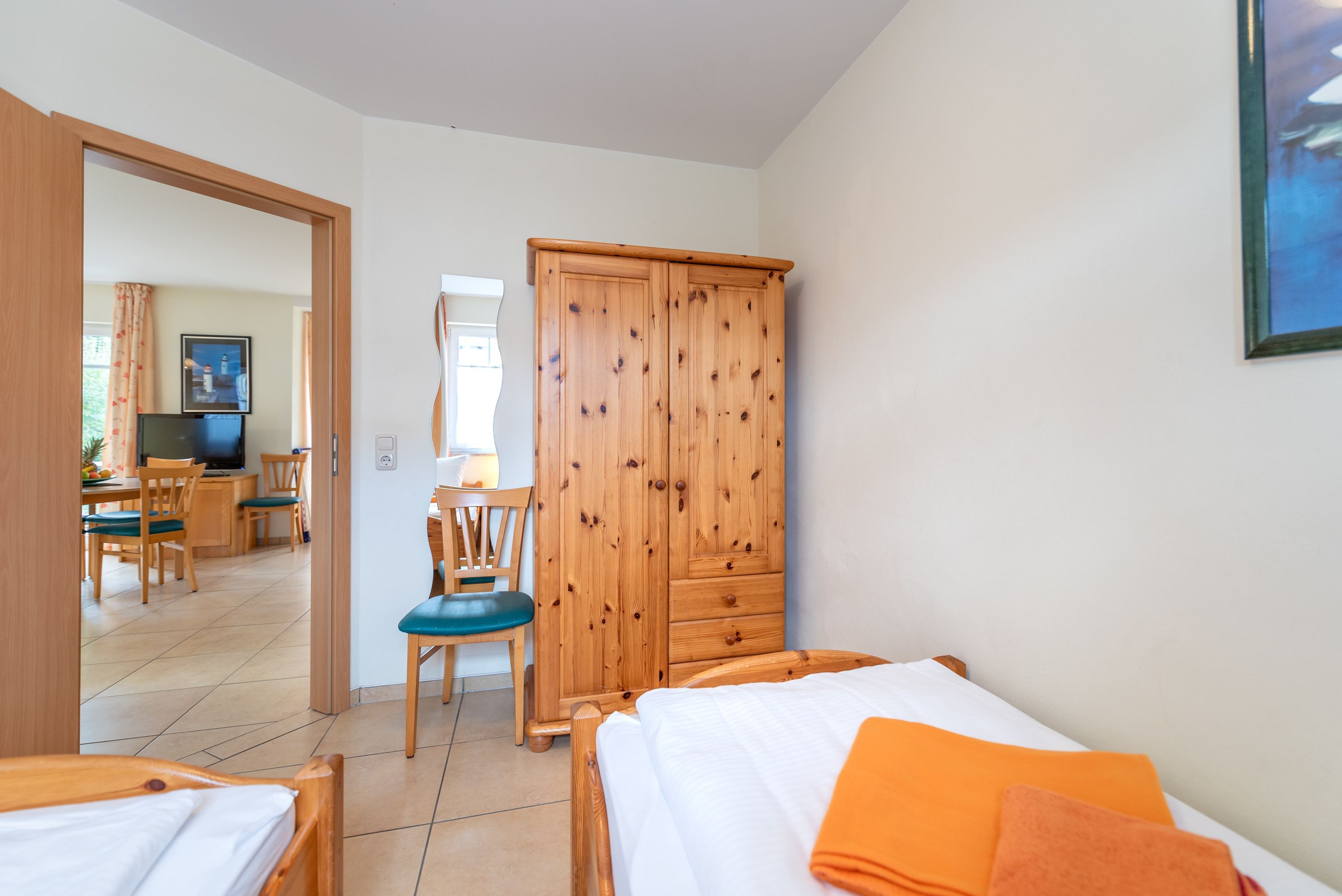 Die Wohnung verfügt über zwei getrennte Schlafzimmer: Ein Schlafzimmer ist mit einem gemütlichen Doppelbett ausgestattet, während das zweite Schlafzimmer über zwei getrennte Betten verfügt. Für eine fünfte Person steht im Wohnraum eine Schlafcouch bereit. Auf Anfrage stellen wir Ihnen gerne kostenlos einen Hochstuhl und ein Kinderbett zur Verfügung.