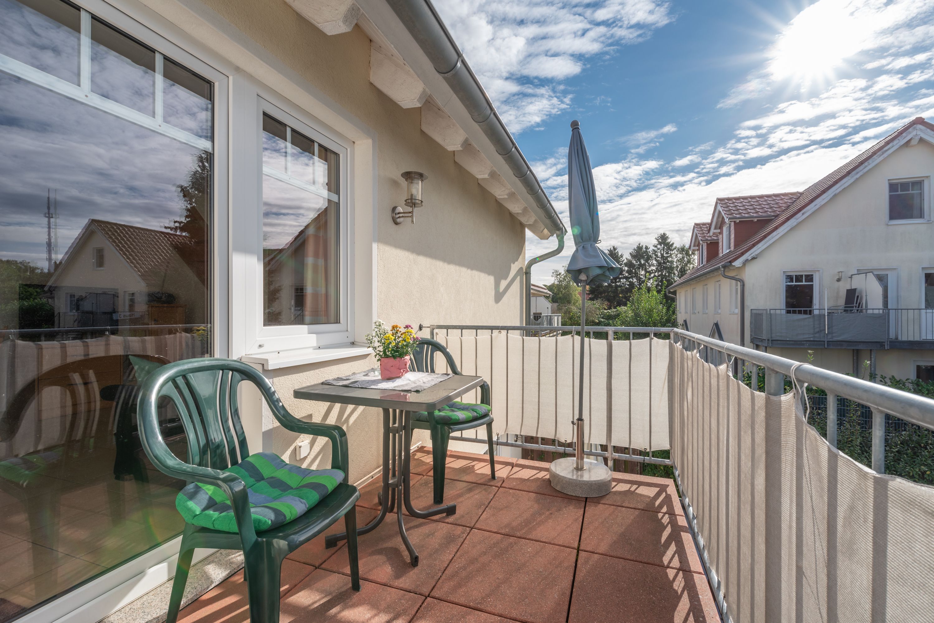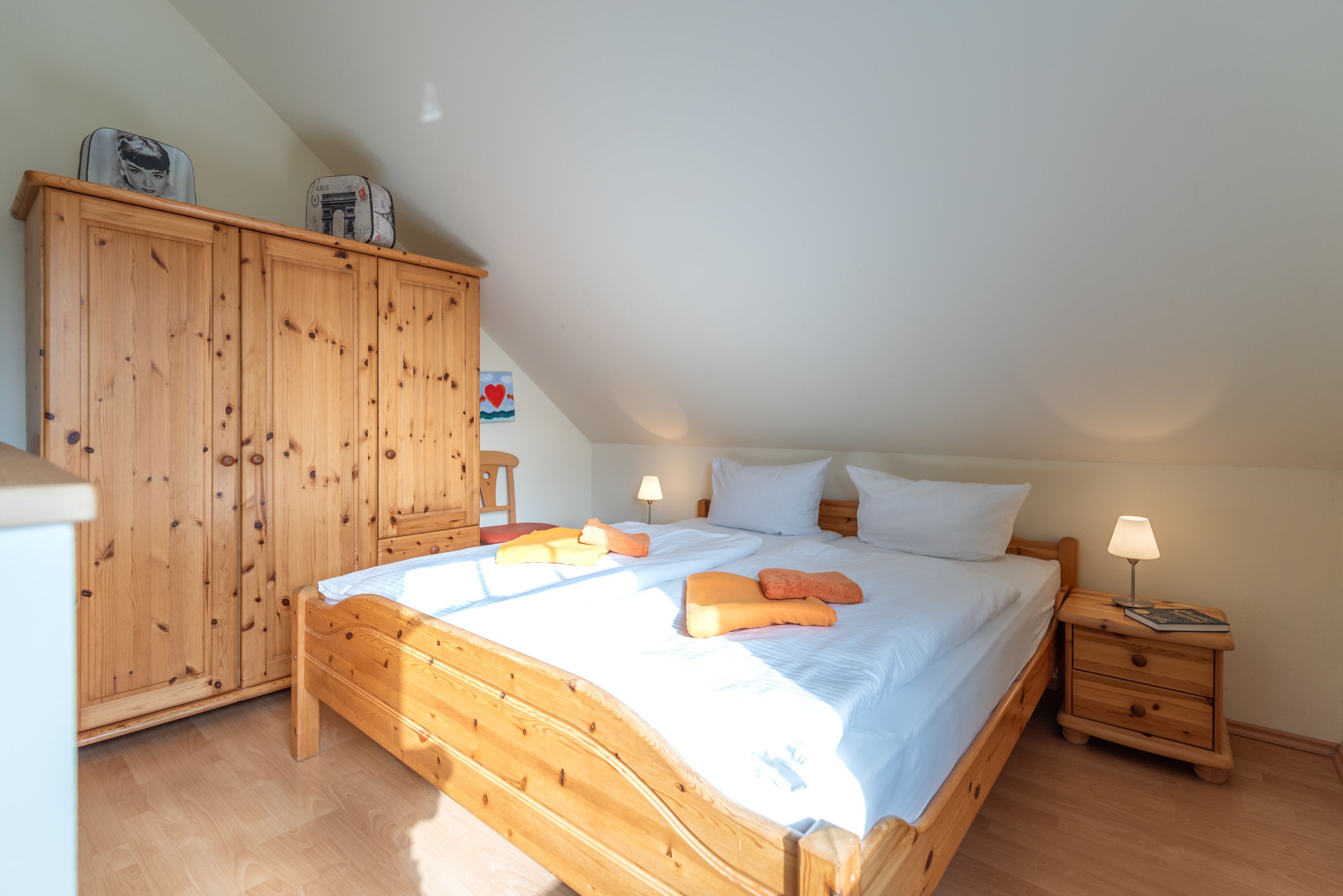 Die Wohnung ist mit einem großen Südwestbalkon ausgestattet, der ideal für entspannte Stunden im Freien ist. Der separate Schlafraum im Dachgeschoss, der mit Laminat ausgelegt ist, bietet ein bequemes Doppelbett und eine zusätzliche Schlafcouch. Dieser Raum ist über eine Treppe zu erreichen und bietet ausreichend Platz für erholsame Nächte.